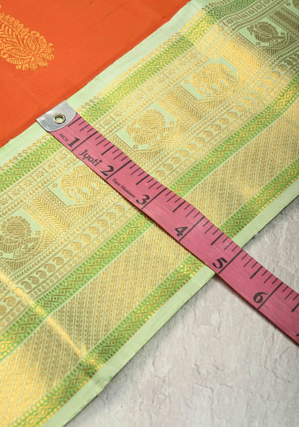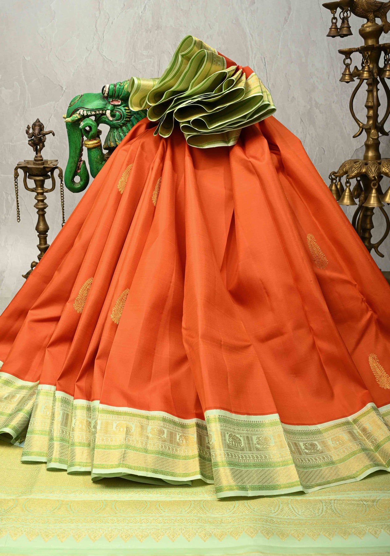 This 3-gram pure zari sunset orange Kanjivaram silk saree radiates vibrant elegance with its rich and luminous silk texture. The body is beautifully adorned with classic zari paisley buttas, adding a touch of traditional charm and intricate detailing. A striking contrast Korvai zari border enhances the saree with grandeur and showcases masterful Kanchipuram craftsmanship. Woven from pure silk with lightweight pure zari, it offers both luxury and comfort. Ideal for weddings, festive occasions, and grand celebrations, this saree makes a timeless and regal statement.
