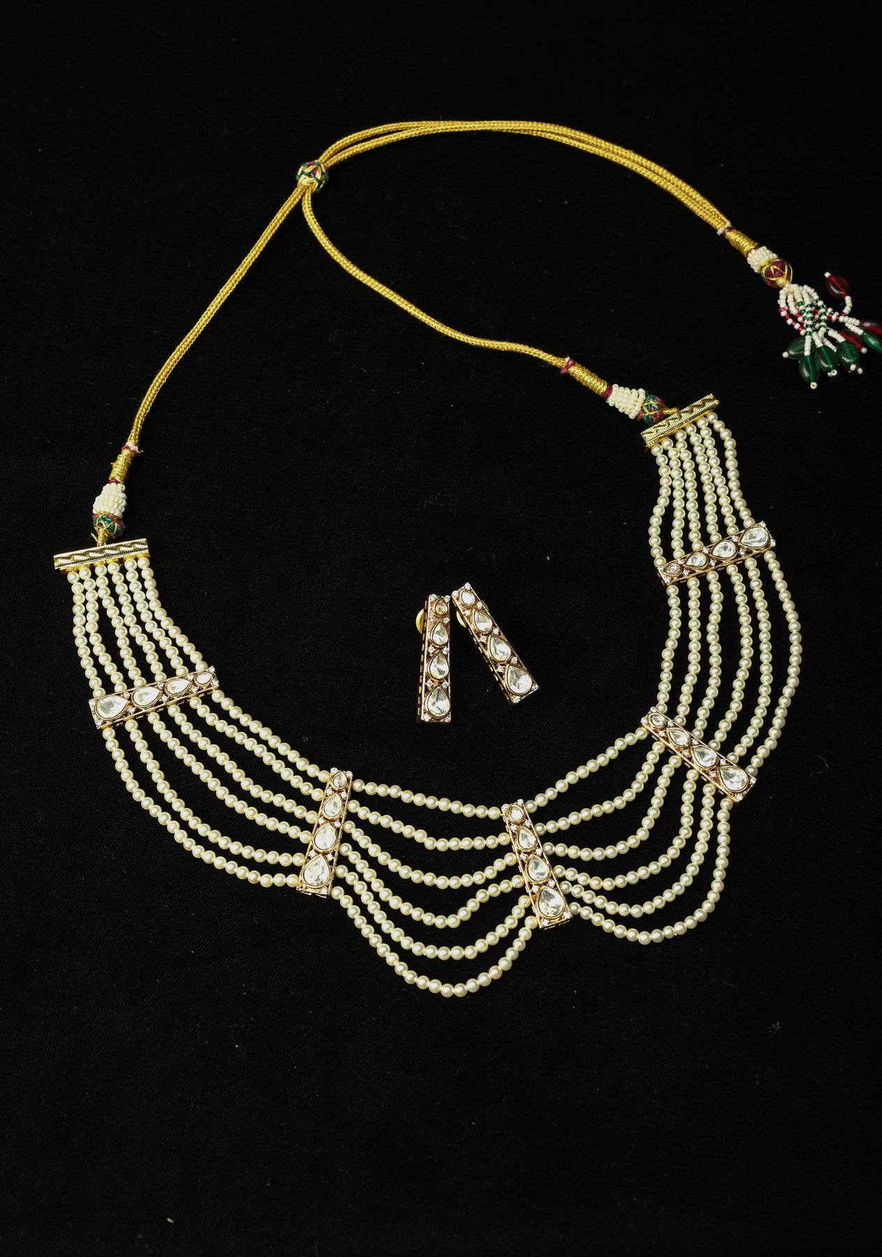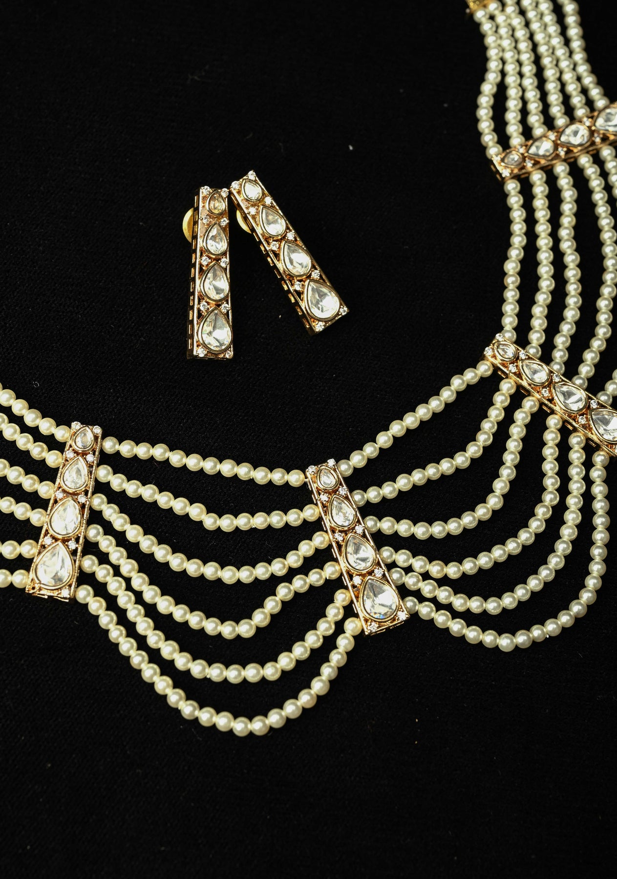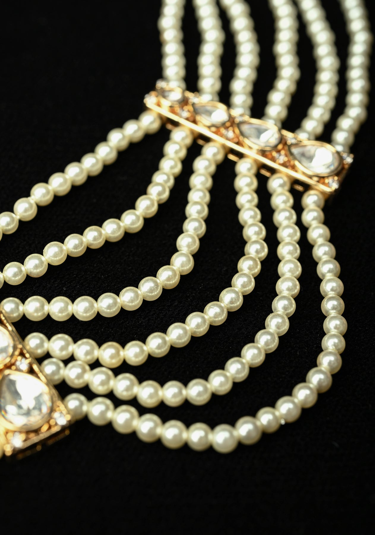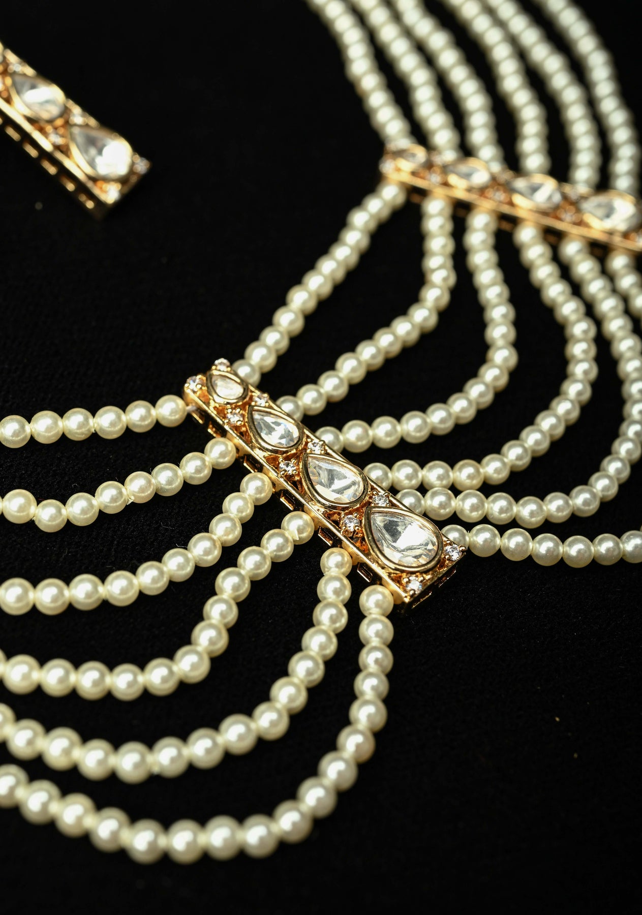 Make a regal statement with this 6-Layered Kundan Pearl Necklace and Earrings Set with Stones. Featuring intricate Kundan craftsmanship combined with lustrous pearls and sparkling stones, this set exudes elegance and grandeur.