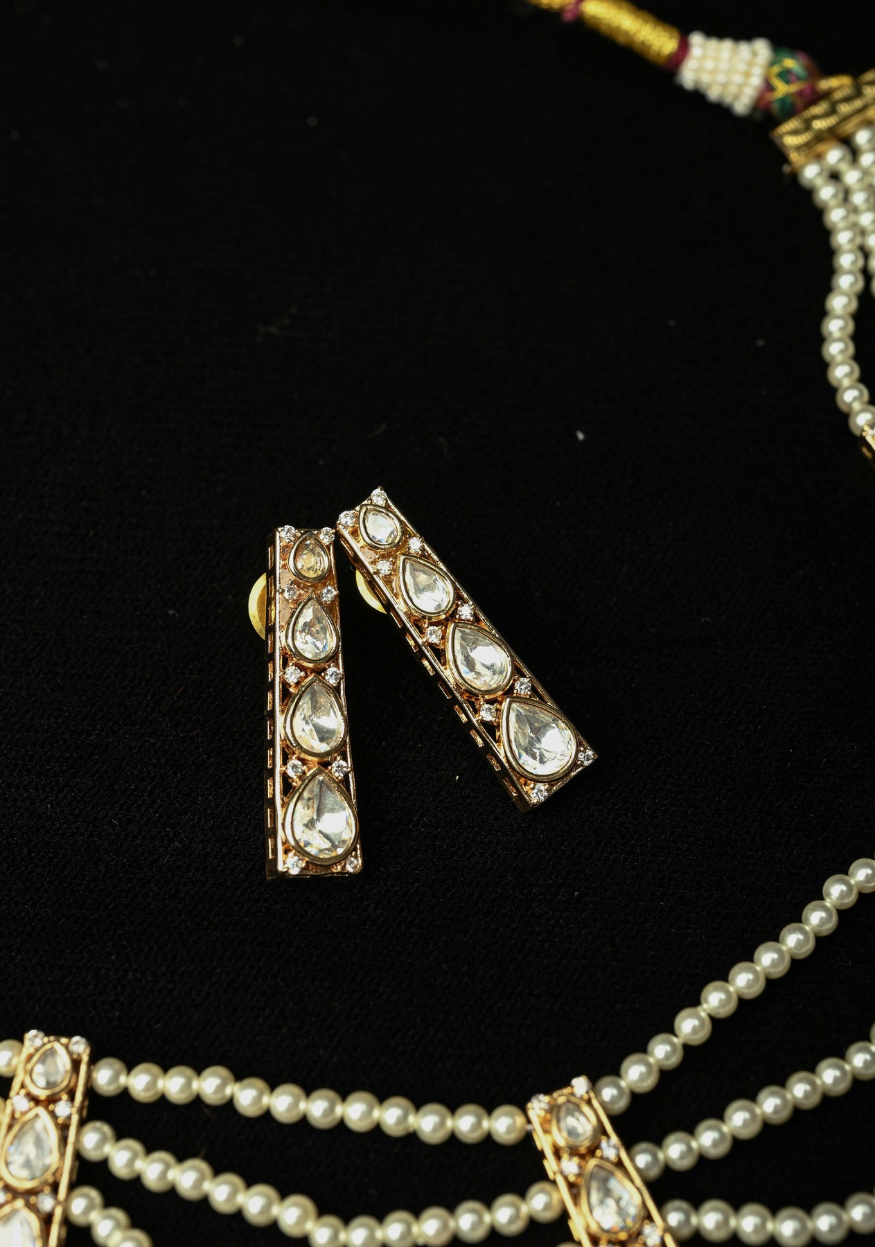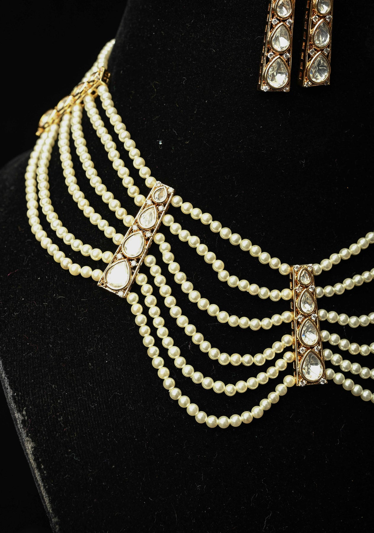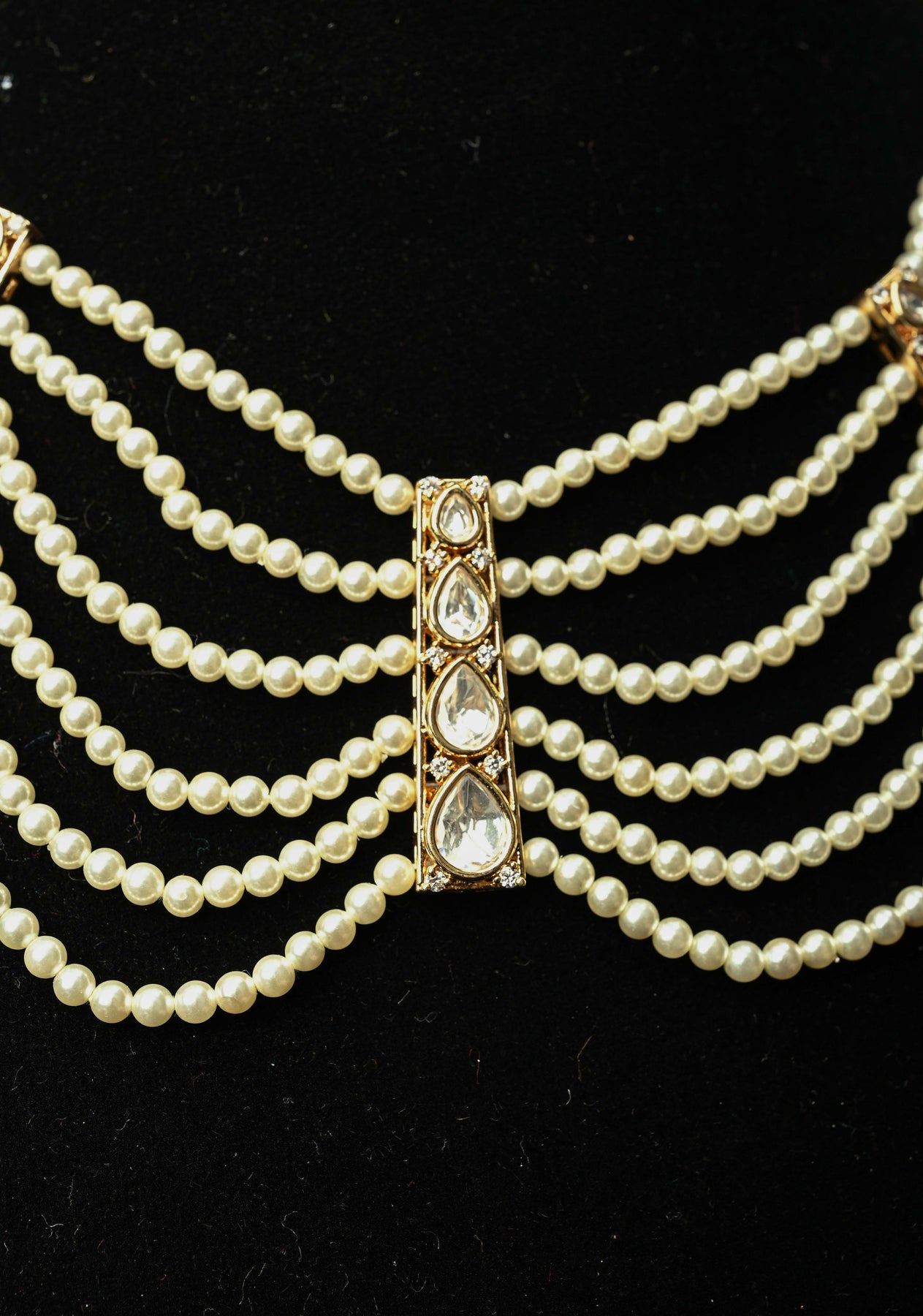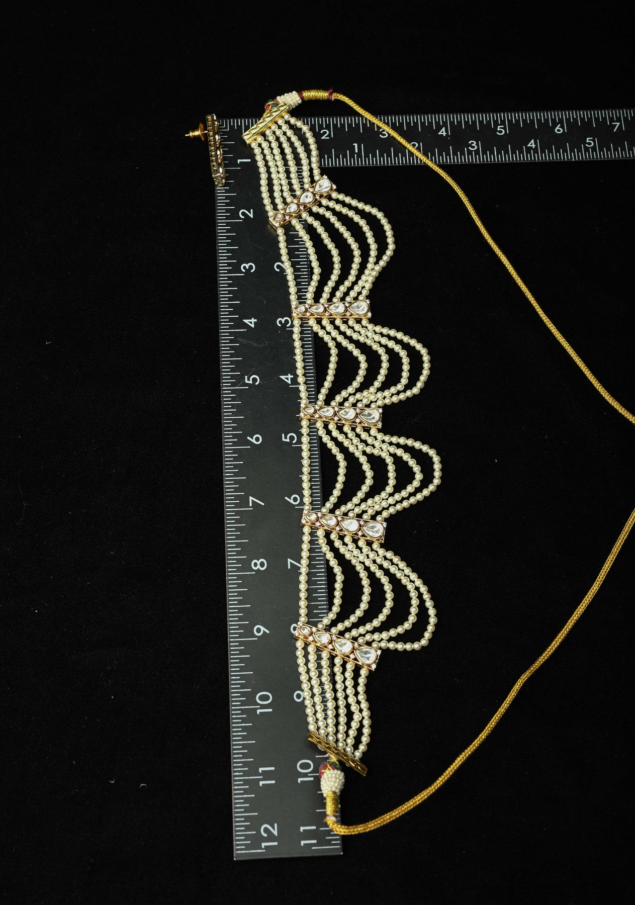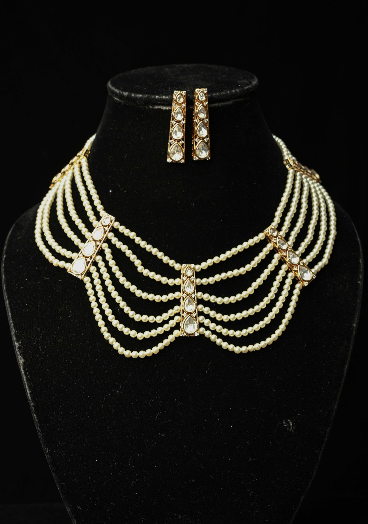 Make a regal statement with this 6-Layered Kundan Pearl Necklace and Earrings Set with Stones. Featuring intricate Kundan craftsmanship combined with lustrous pearls and sparkling stones, this set exudes elegance and grandeur.