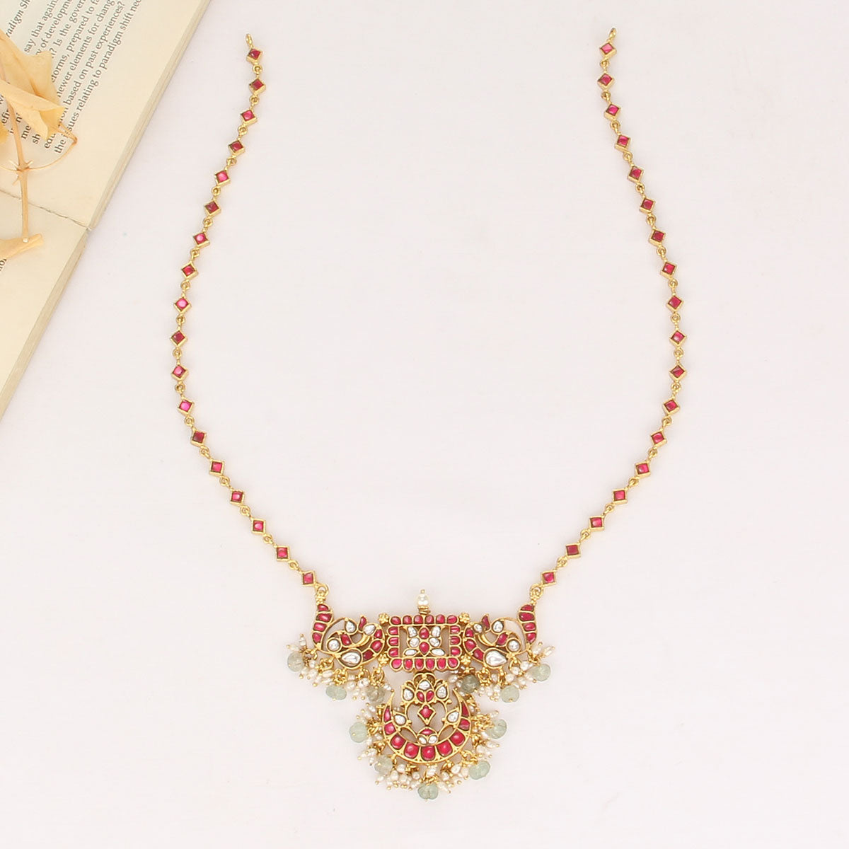 This 92.5 Silver, 24kt gold-plated long necklace is adorned with semi-precious kundan stones and Beads for a luxurious aesthetic.