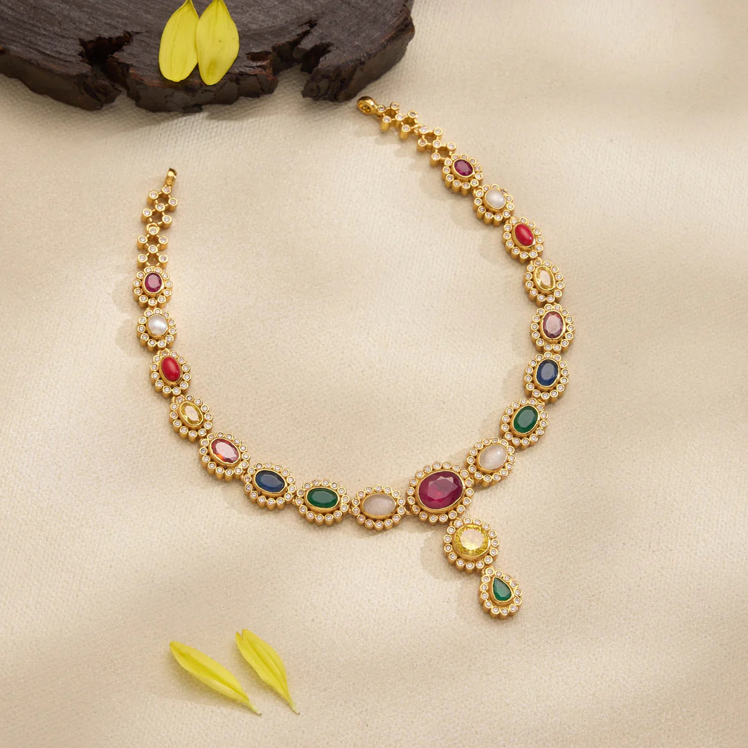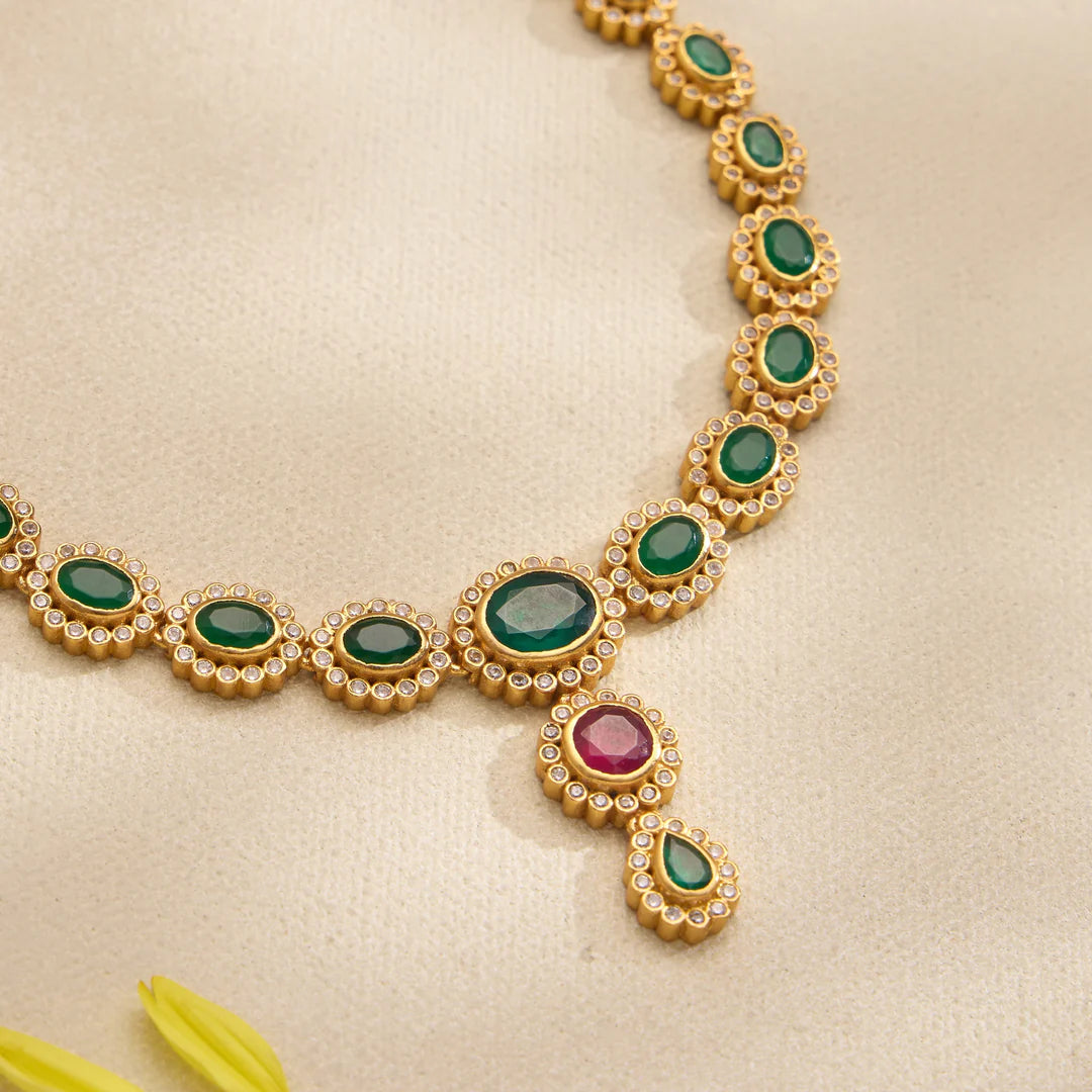 Avani Ruby Short Necklace features an elegant Floral design intricately accented with sparkling CZ stones, Emeralds and Ruby and another beautiful Navaratna Pattern. This piece combines refined artistry with subtle brilliance, making it an ideal choice for adding a touch of sophistication to any outfit. Its delicate craftsmanship ensures it sits comfortably and gracefully around the neckline, perfect for special occasions.