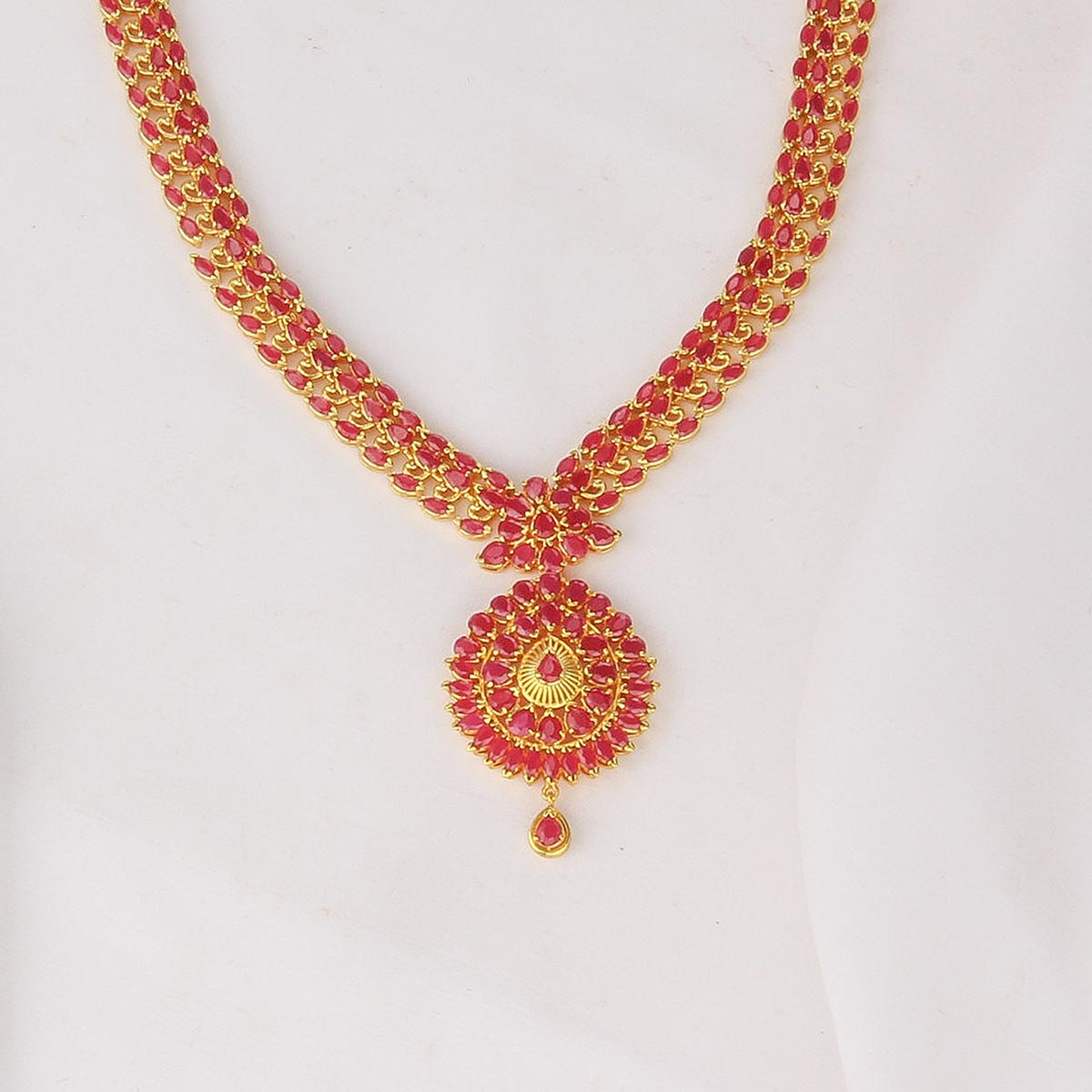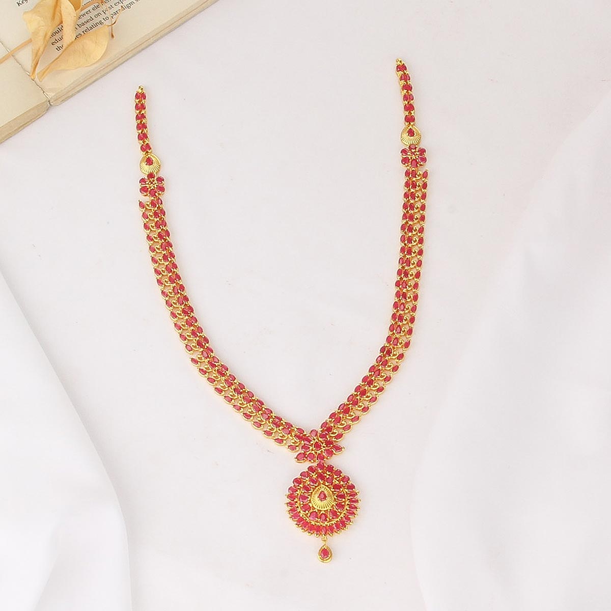 This 92.5 Silver, 24 kt Gold-Plated Long Necklace is adorned with Semi-precious Stones for a luxurious aesthetic.