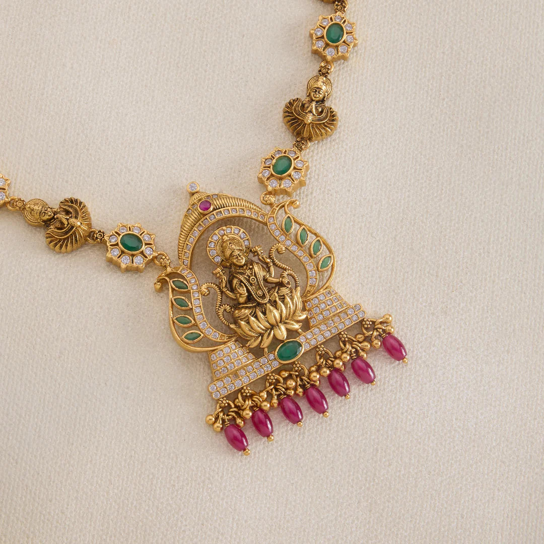 Expertly crafted, the Kalya Dhanalakshmi Short Necklace boasts exquisite design and quality. Adorned with Emeralds, Ruby, and CZ stones, its intricate Lakshmi and Devta Motifs add a touch of elegance. Golden accents and Ruby Emerald Beads complete this stunning piece. Elevate your style with this truly unique necklace.