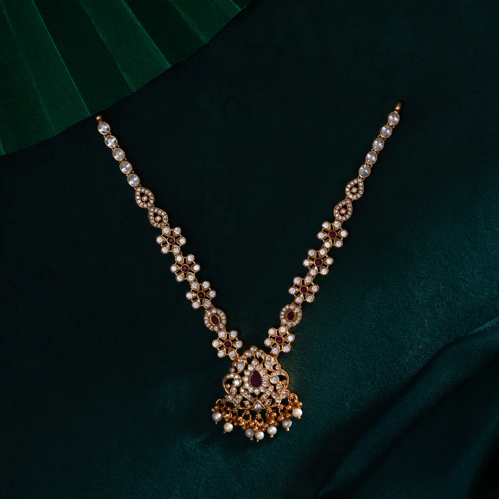 Mukulita Short Necklace showcases exquisite craftsmanship with its intricate Floral and Pear design. This elegant piece features premium CZ stones complemented by Emeralds, Rubies, and Navaratna gemstones. The refined aesthetic is enhanced by delicate Pearl and Golden bead hangings, creating a sophisticated statement piece that balances traditional artistry with contemporary appeal.