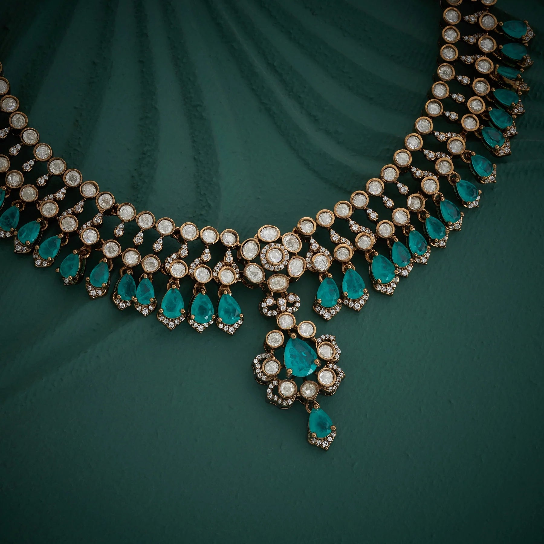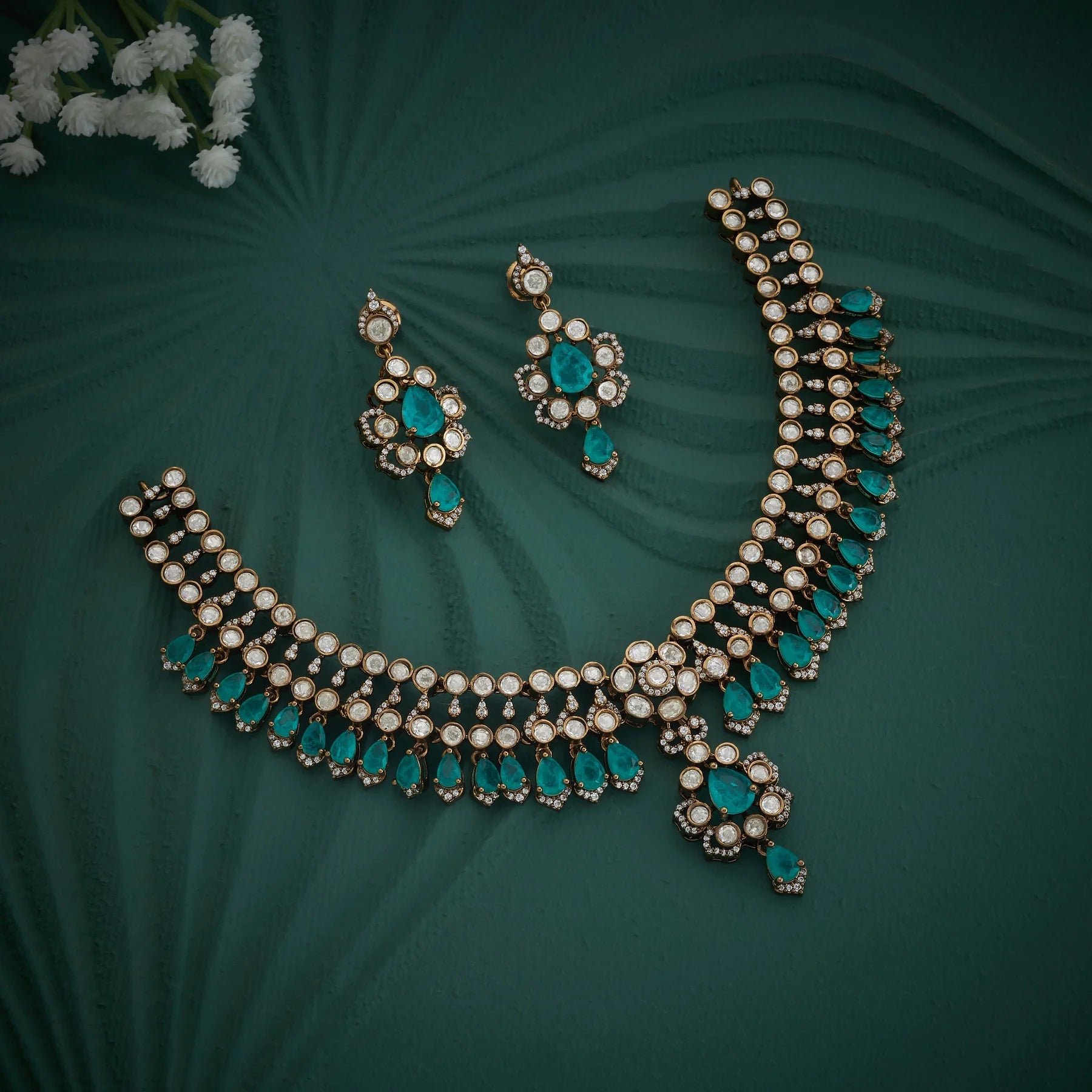 Archira Victorian Necklace Set showcases timeless elegance with intricate Moissanite settings that capture light beautifully. The design features gracefully dangling Pear-shaped semi-precious green stones, each bordered with sparkling Cubic Zirconia and adorned with delicate Floral motifs at the center. This sophisticated piece combines traditional Victorian craftsmanship with contemporary gemstone work, making it an ideal choice for festive occasions, weddings. The harmonious blend of green tones and brilliant sparkle creates a striking statement that complements both traditional and modern ensembles.