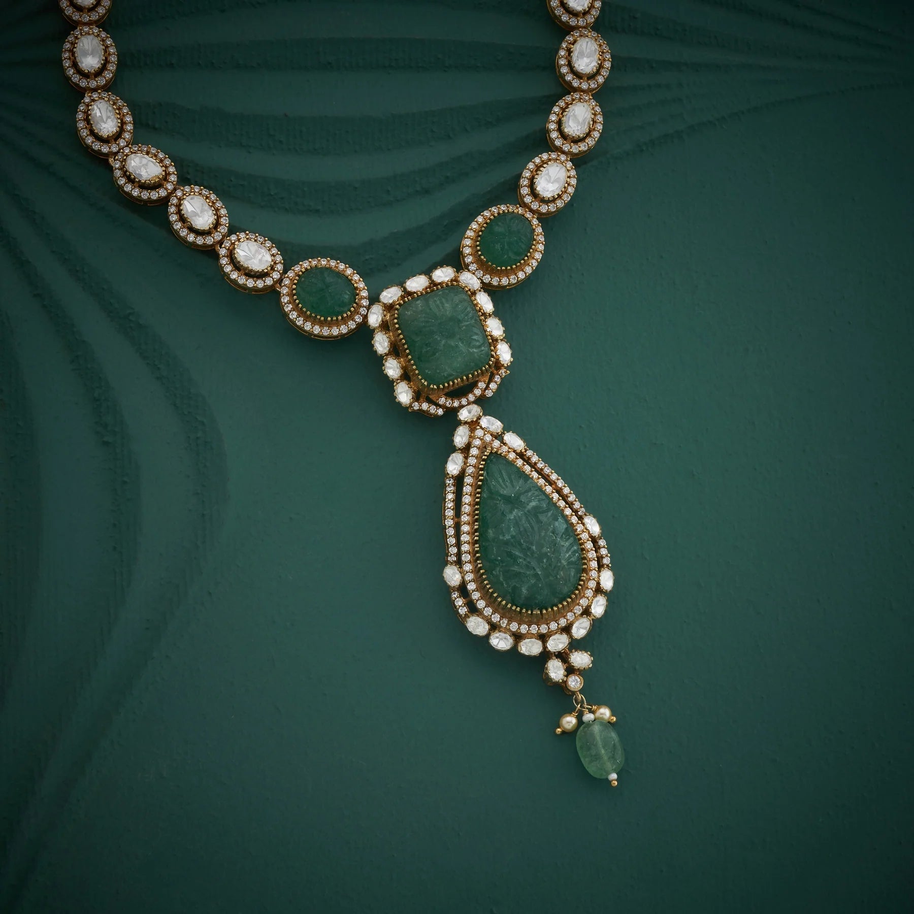 Introducing the Carved-Emerald Victorian Necklace Set, a sophisticated piece that showcases masterful craftsmanship. This necklace features a meticulously carved Emerald as its centerpiece, complemented by brilliant Moissanites and Cubic Zirconia stones that enhance its luminosity and depth. The combination of these premium materials creates a striking visual impact while maintaining exceptional durability. Perfect for those who appreciate moissanite jewellery with distinctive character, this set delivers elegance and timeless appeal for both special occasions wear.