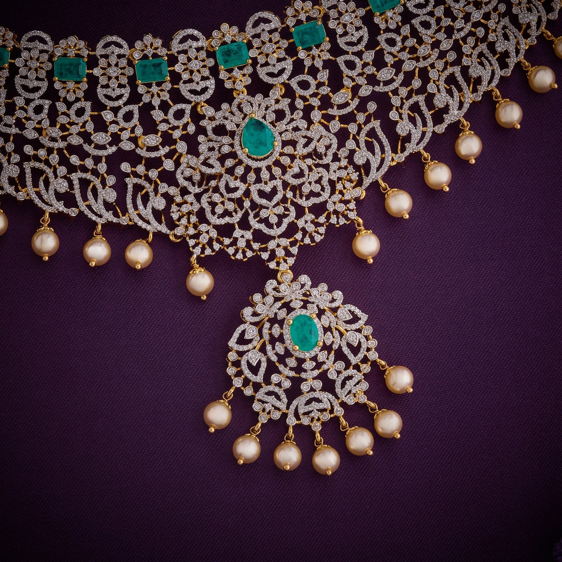 Elevate your evening elegance with this exquisite Emerald CZ Choker Set, meticulously crafted to capture timeless sophistication. The piece features an intricate Floral design adorned with brilliant Cubic Zirconia stones that catch light beautifully, complemented by rich Emerald accents. Delicate Pearl drops cascade gracefully, adding movement and refined femininity to the design. Perfect for weddings, celebrations, or special occasions, this choker combines traditional artistry with contemporary allure, making it an investment piece that transcends seasonal trends.