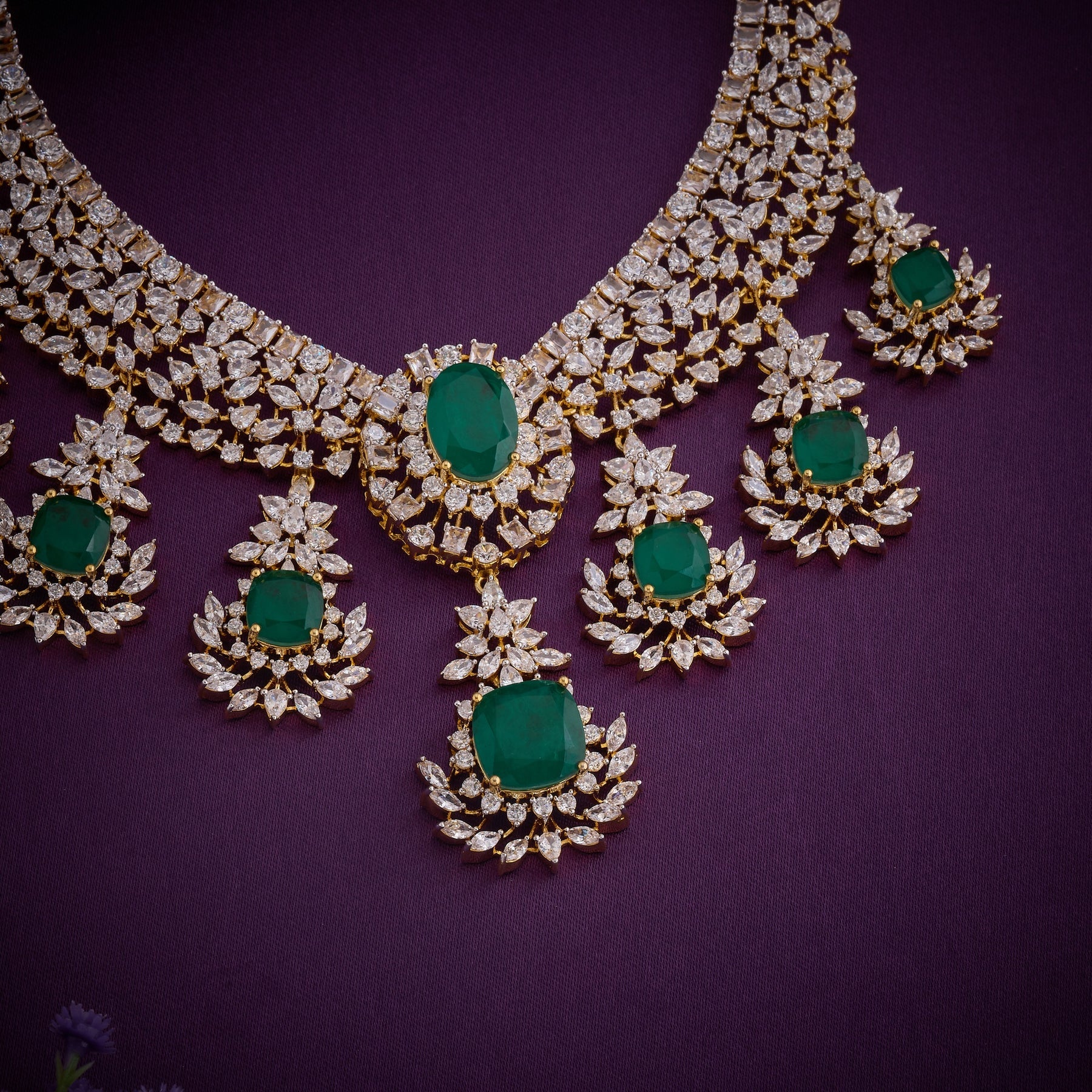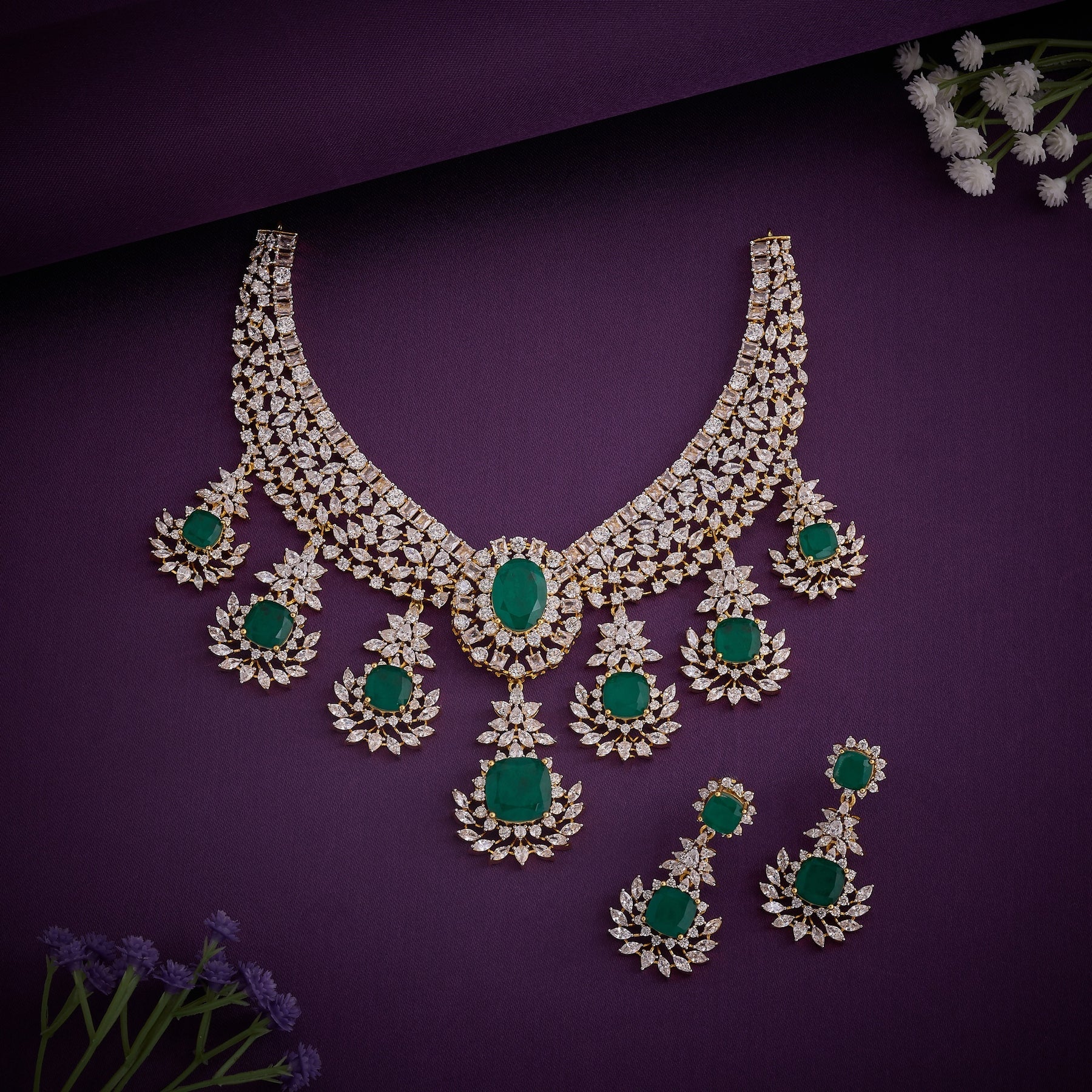 Elevate your jewellery collection with the Emerin-CZ Necklace Set, expertly crafted to combine timeless elegance with contemporary design. This sophisticated set features lustrous Green stones paired with brilliant Cubic Zirconia accents, creating a striking interplay of colour and sparkle. The thoughtful combination of Emerald-toned gems and semi precision-cut CZ stones delivers a luxurious aesthetic at an accessible price point. Perfect for special occasions, this necklace set offers versatile styling options that complement both traditional and modern wardrobes. Each piece is designed with meticulous attention to detail, ensuring durability and lasting brilliance.