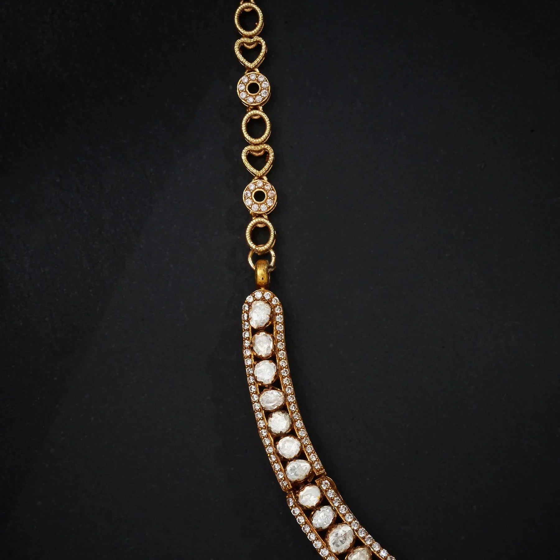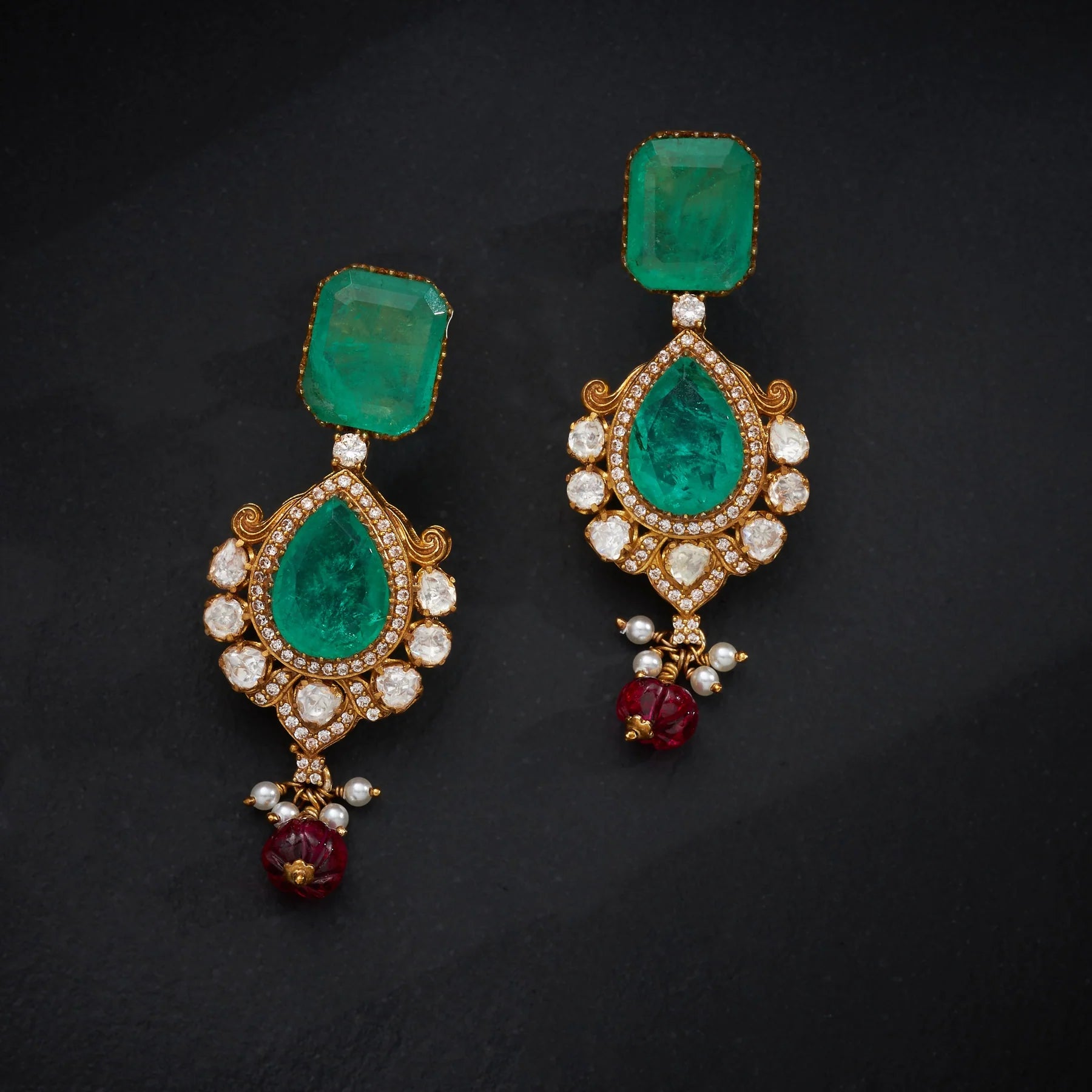 Elevate your collection with the Glimverda Victorian Necklace Set, a masterfully crafted piece that seamlessly blends timeless elegance with contemporary sparkle. This exquisite necklace features intricate Floral detailing adorned with brilliant Moissanite and Cubic Zirconia stones that catch light with exceptional radiance. Complementing the design are rich Emeralds that add depth and sophistication, while delicate Red bead and Pearl hangings create movement and grace. Perfect for special occasion this set delivers the luxury aesthetic of fine jewellery with versatile styling potential..
