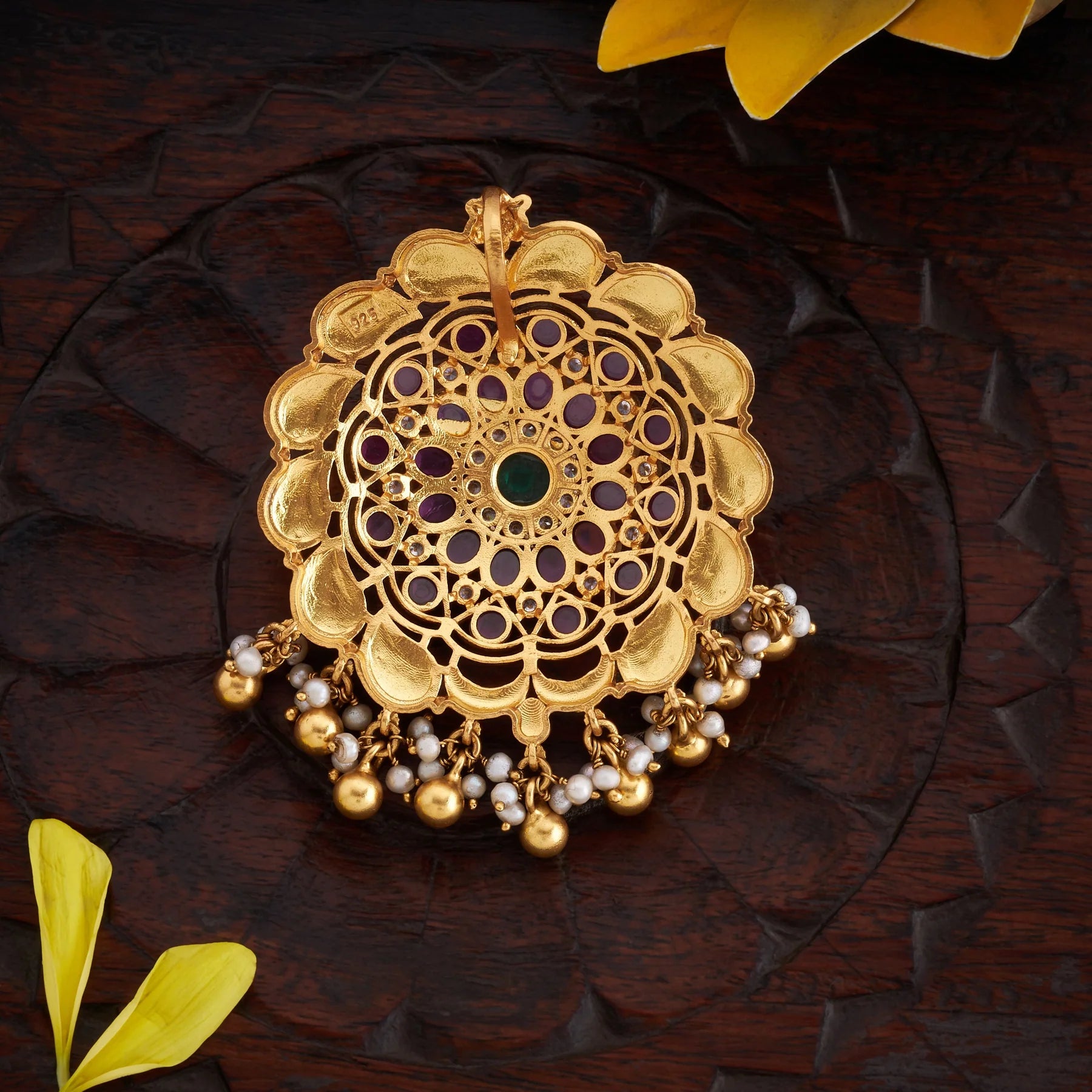 Komalini Antique Pendant showcases timeless elegance with its distinctive Floral silhouette, adorned with intricate Kundan work that catches light beautifully. Golden beads and delicate Pearl drops cascade gracefully, creating a refined statement piece. Perfect for festive occasions. This pendant celebrates traditional craftsmanship with contemporary appeal.
