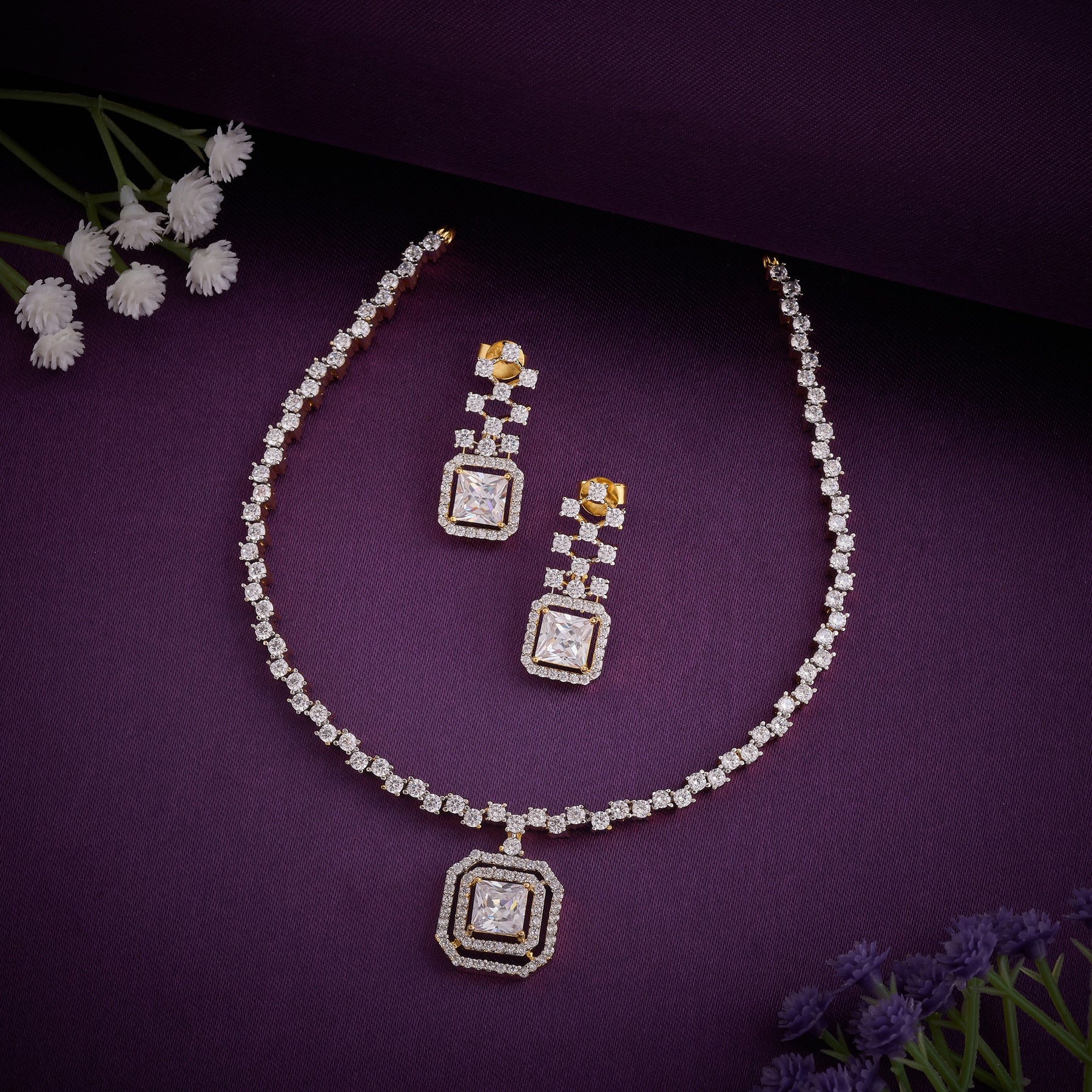 Moonlight CZ Necklace Set Crafted with precision, this necklace set features a striking Square design adorned with Cubic Zirconia stones that capture and reflect light with exceptional brilliance. The geometric Square silhouette offers a contemporary aesthetic, while the carefully selected CZ stones deliver diamond-like sparkle at an accessible price point. Ideal for special occasions, this set combines modern design sensibility with timeless sophistication. The Cubic Zirconia stones are expertly cut to maximize light performance, ensuring your piece remains luminous and eye-catching. Perfect for those who appreciate quality craftsmanship and refined style.