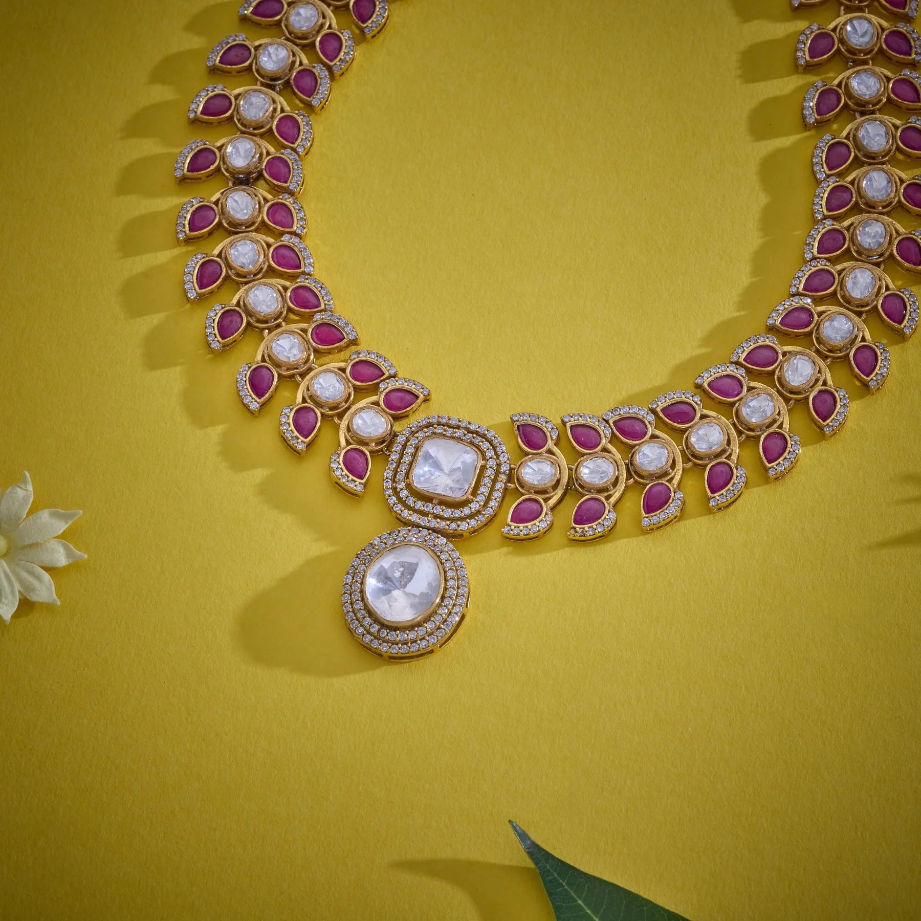 Pavira Victorian Short Necklace Embrace timeless elegance with this exquisite Victorian-inspired necklace, featuring intricate Moissanite craftsmanship paired with striking red stone settings. The delicate design captures the ornate beauty of Victorian jewellery, with hand-cut Moissanite creating a luminous backdrop for rich crimson stones that command attention. Perfect for special occasions or adding a touch of regal sophistication to your everyday ensemble, this piece seamlessly blends heritage artistry with contemporary style.