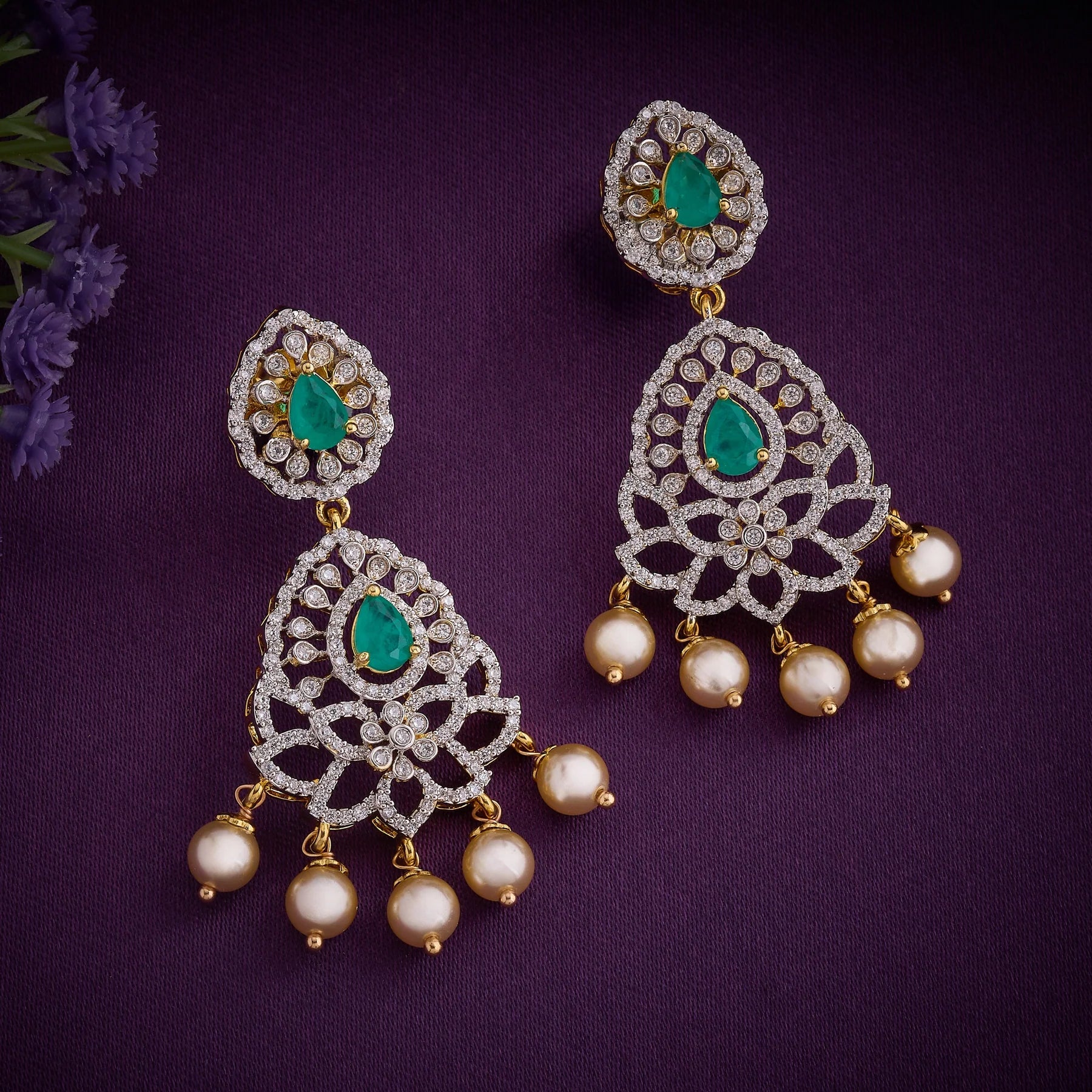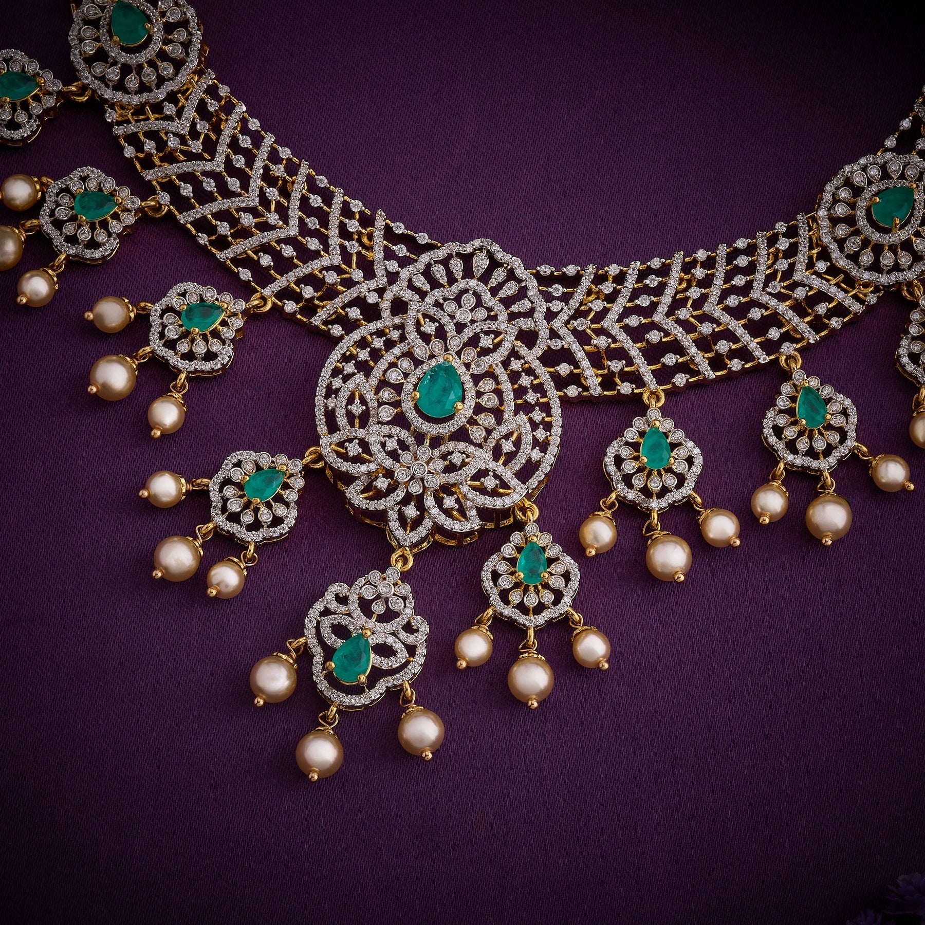 Elevate your jewellery collection with this sophisticated necklace set, meticulously crafted to blend timeless elegance with contemporary design. Featuring intricate Floral motifs adorned with brilliant Cubic Zirconia stones and vibrant Green stones, each piece showcases exceptional craftsmanship. Delicate Pearl hangings add a refined touch, creating graceful movement and dimension. Perfect for special occasions, this versatile set delivers a polished, best aesthetic that complements any wardrobe.