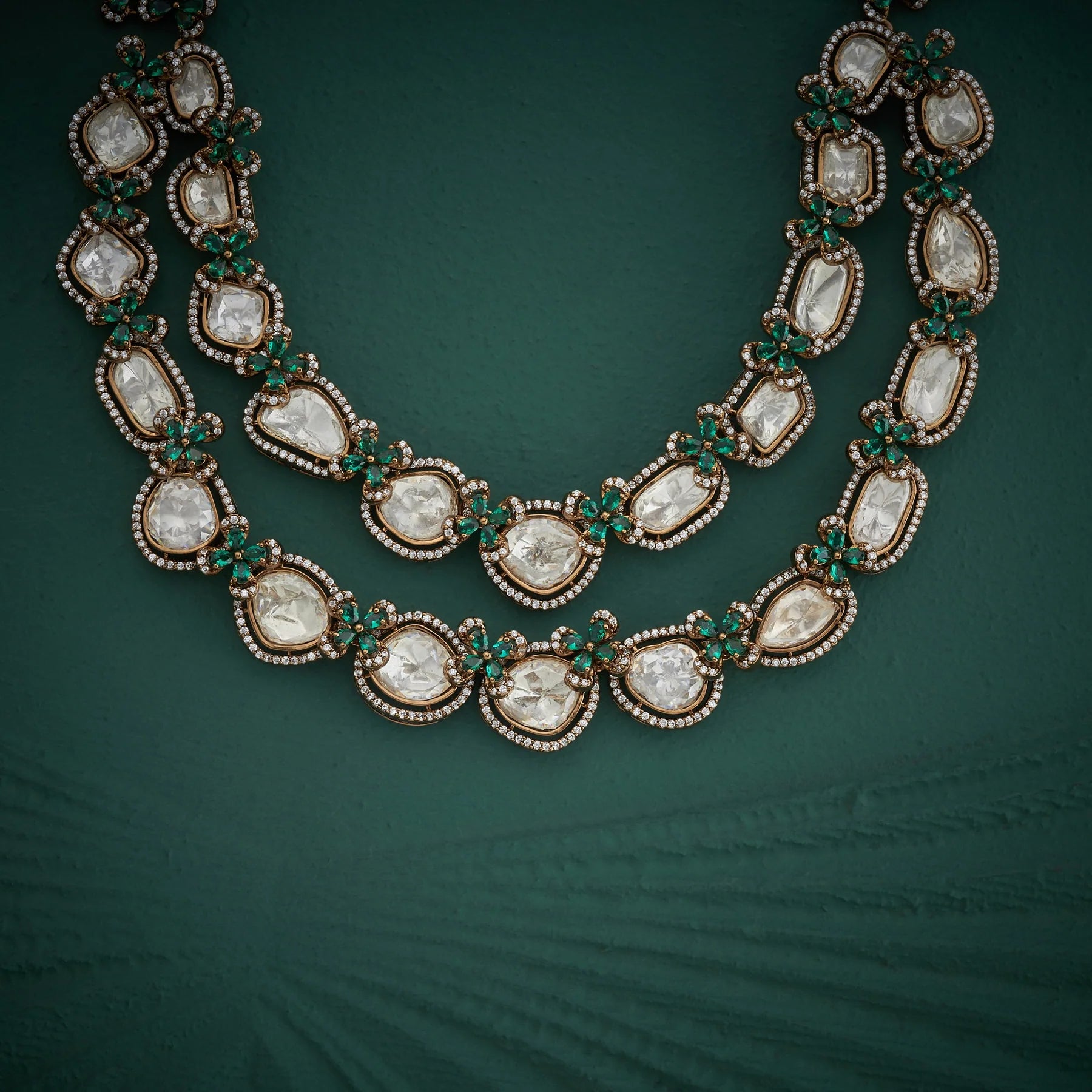 Verdelume Moira Necklace Set showcases intricate floral artistry enhanced by a curated blend of gemstones. Emeralds provide verdant depth, while moissanites deliver brilliant sparkle and durability. Complementary Cubic Zirconia stones complete the design with accessible. This expertly crafted set combines botanical elegance with sophisticated gemstone selection, ideal for those seeking refined jewellery that balances visual impact with lasting quality.