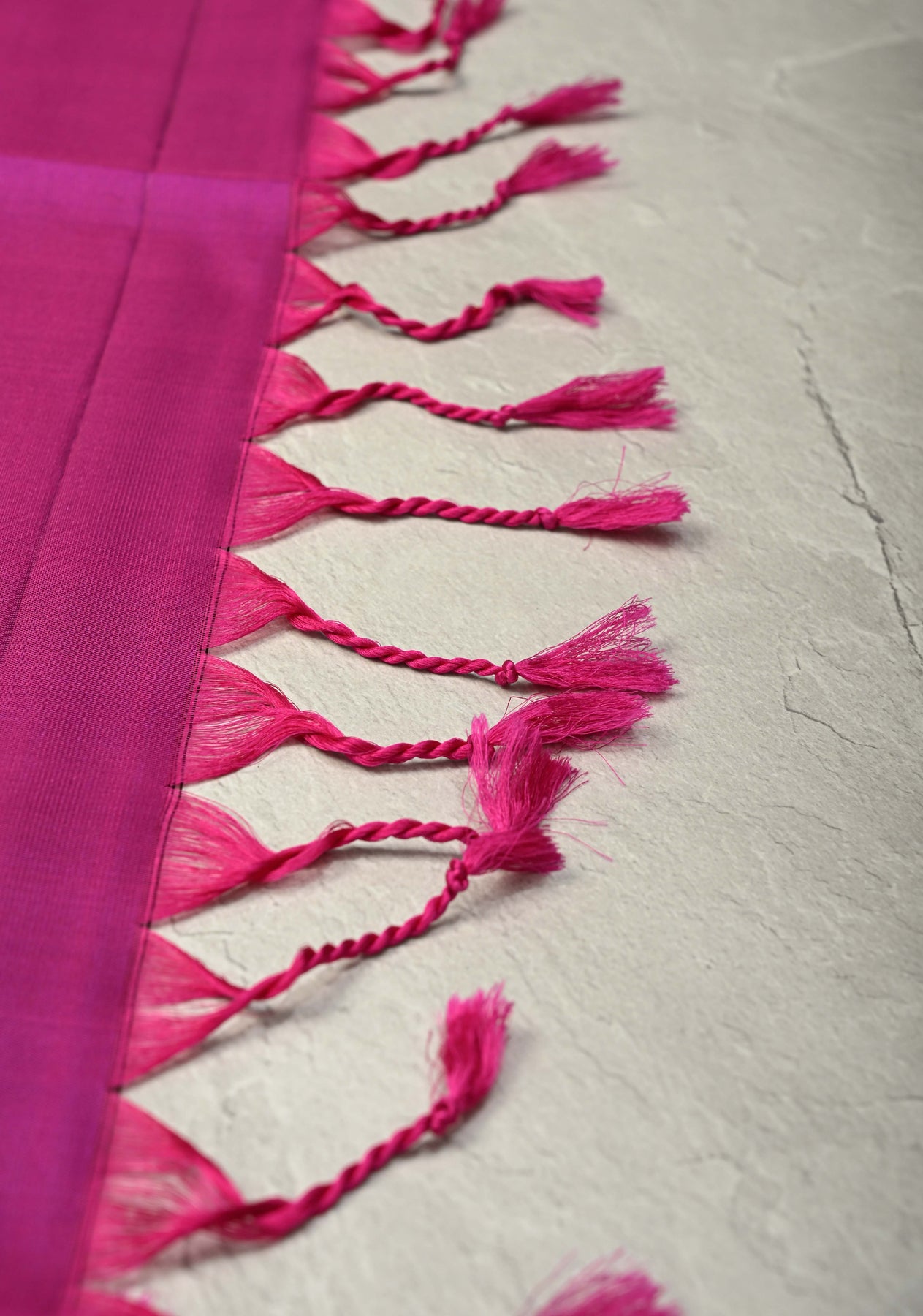 This saree is ready to wear with fall and pico done. Handmade silk tassels as seen in the pic adorn the pallu and add more grace to it. An unstitched blouse fabric is included.