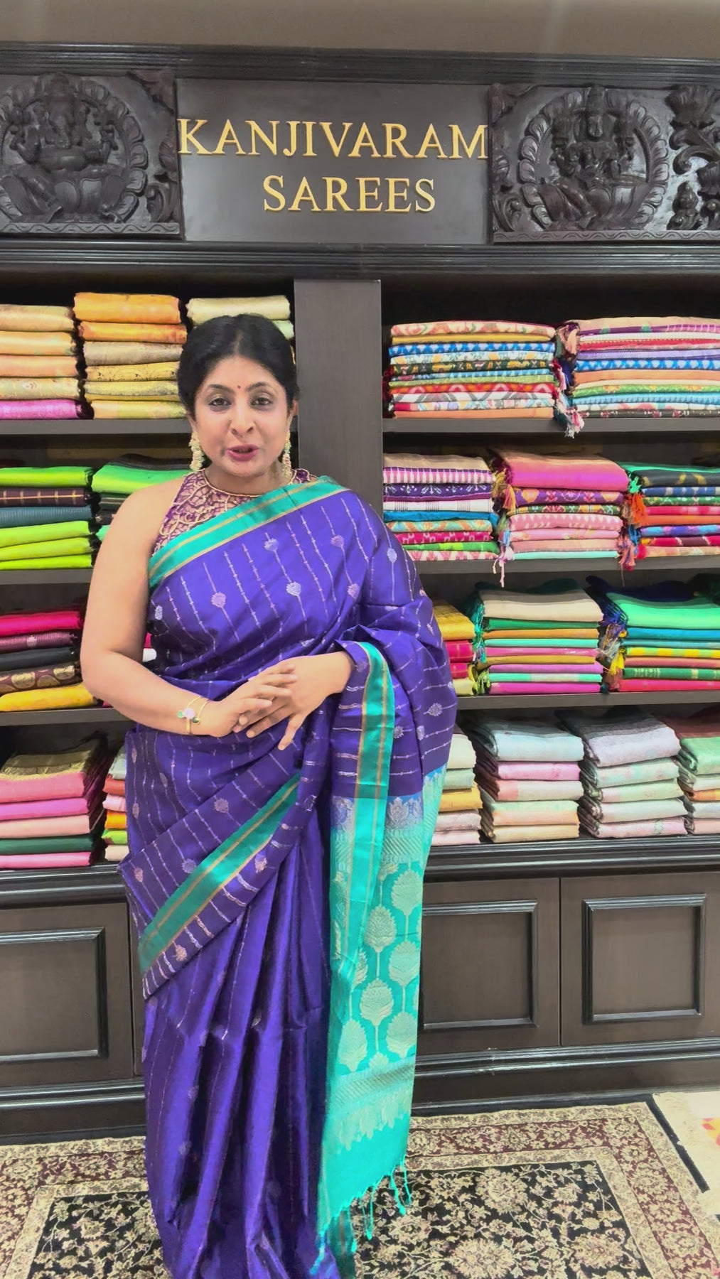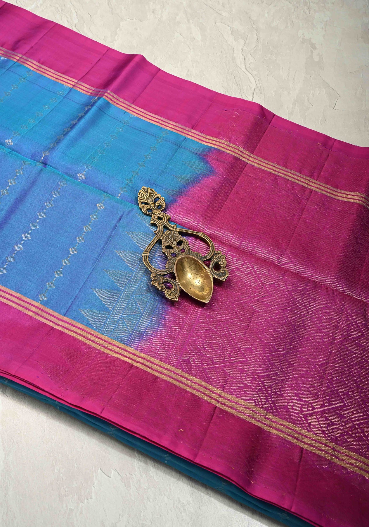The soothing Aegean blue dual tone body is enhanced with subtle zari stripes, adding a refined shimmer and contemporary appeal. Completing the look is a striking contrast magenta border, which brings vibrancy and classic Kanchipuram character to the saree. A timeless piece that beautifully balances tradition with modern elegance.