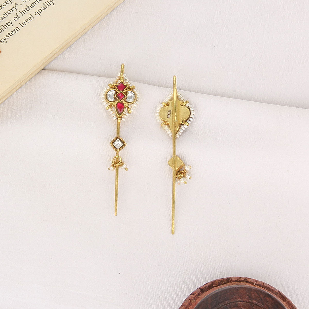 This 92.5 Silver, 24 kt Gold-Plated Needle Ear cuffs is adorned with Semi-precious Kundan Stones for a luxurious aesthetic.