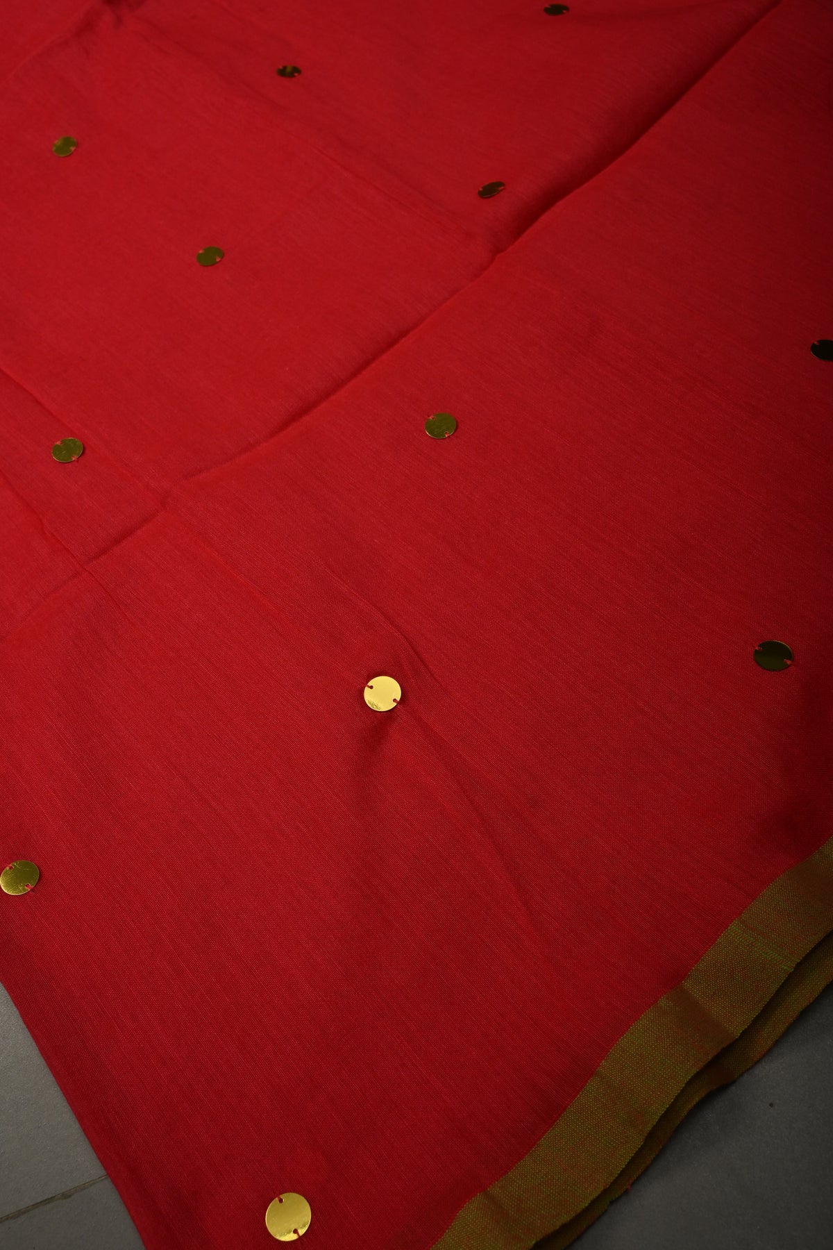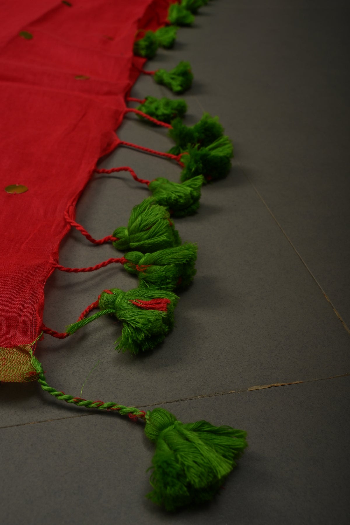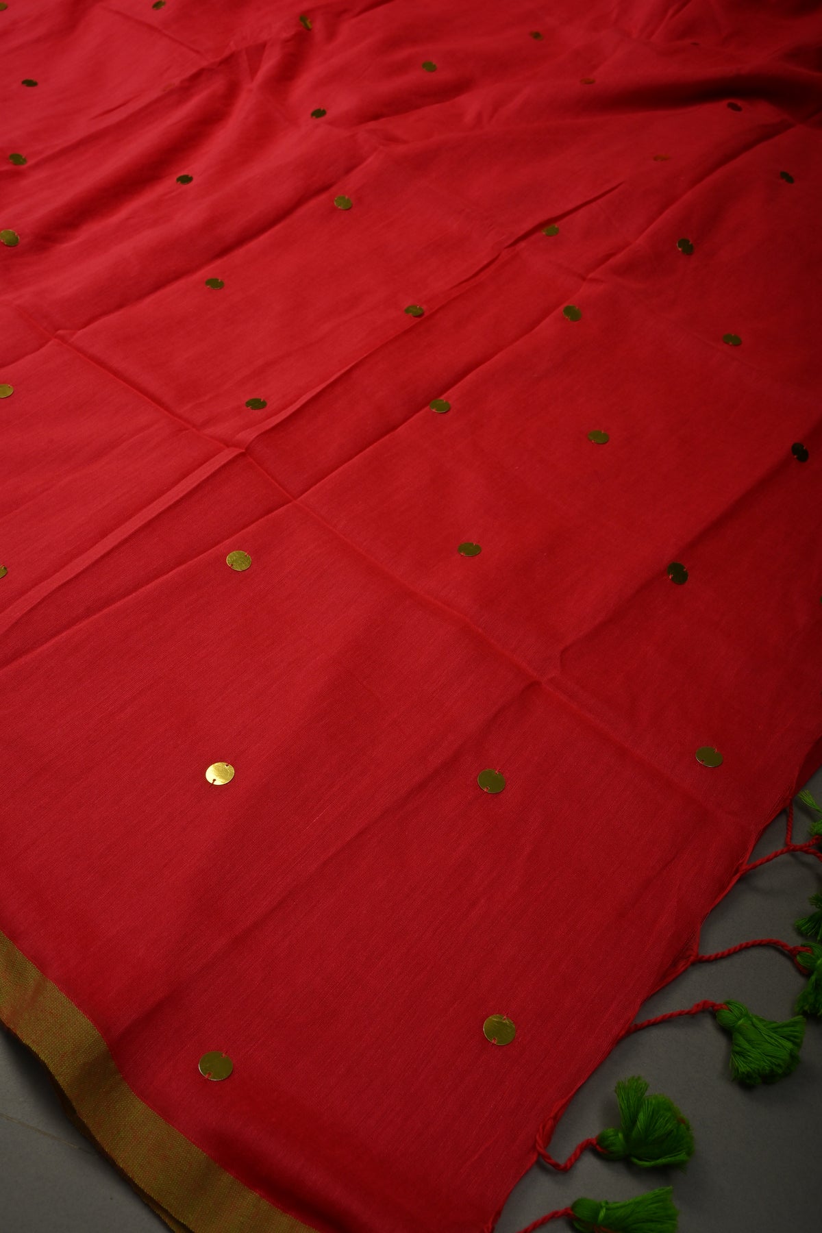 Amaranth Mercerized Mul Cotton Saree with Tikki Work and Long Tassels, No Blouse Piece