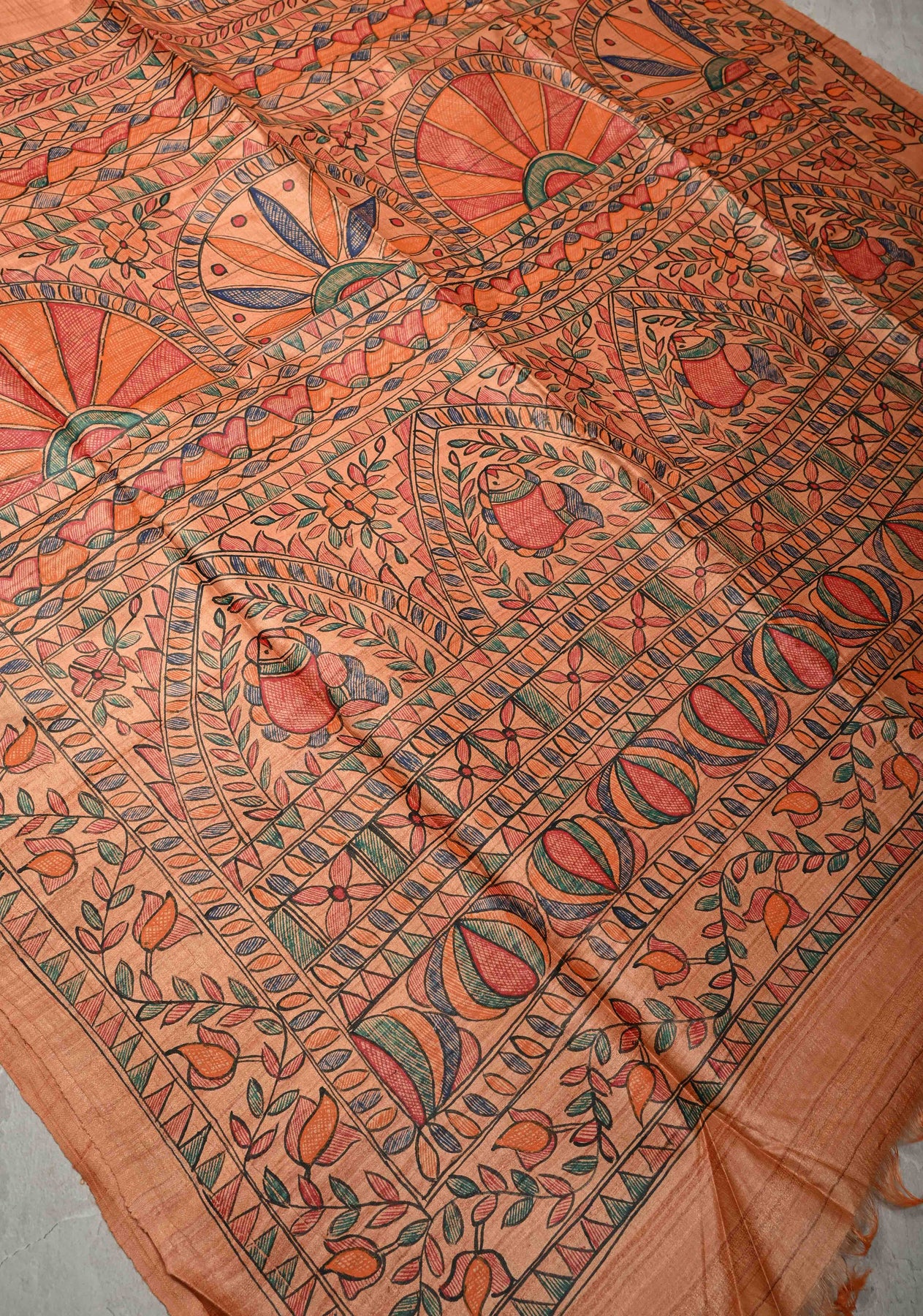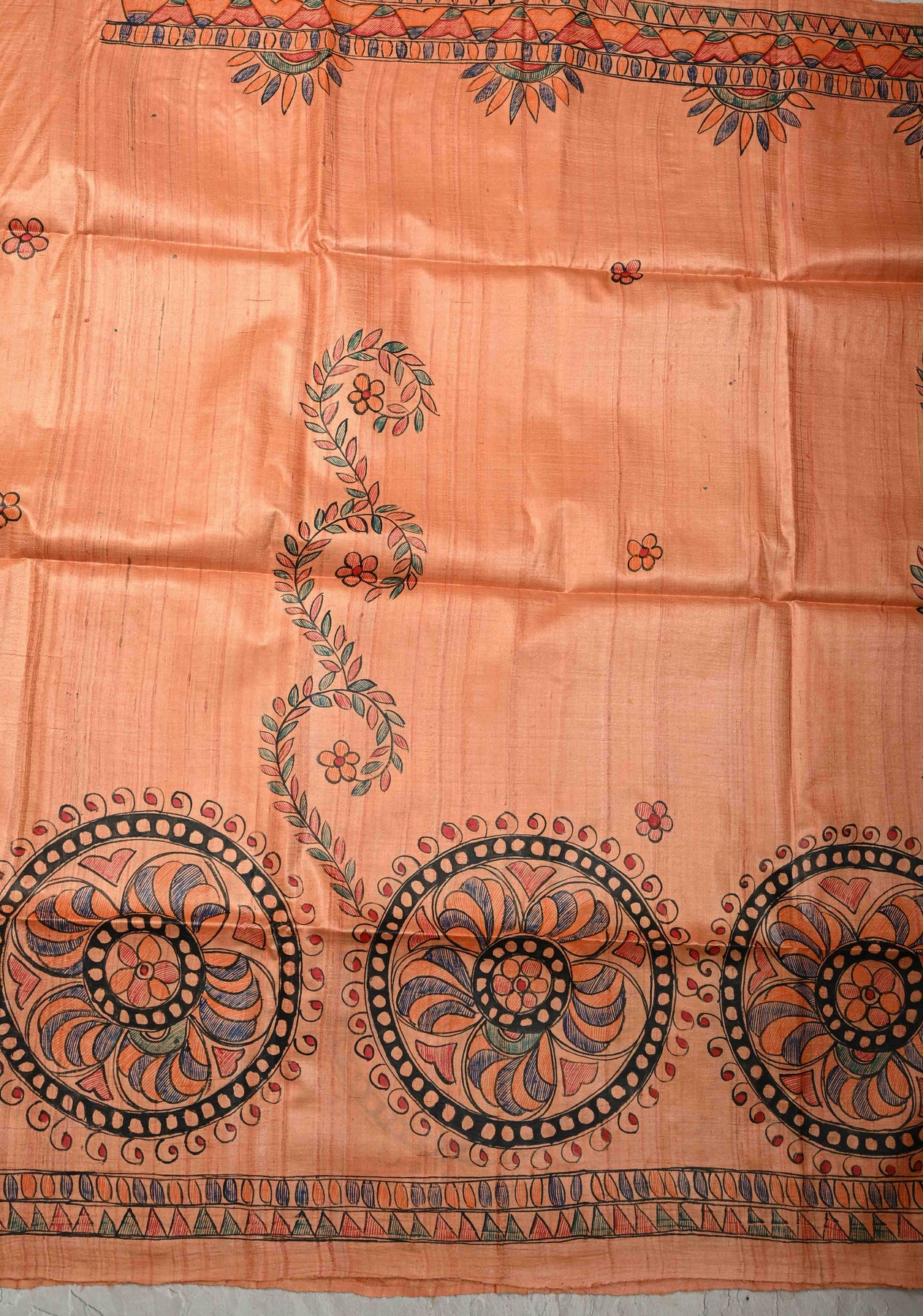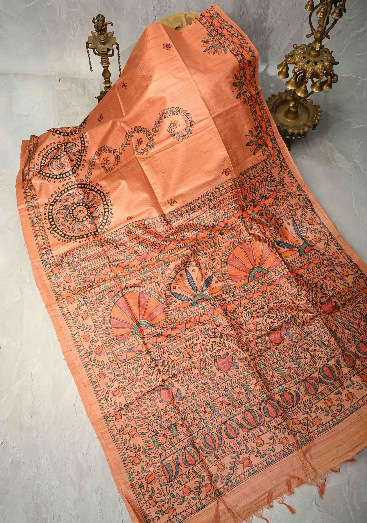 Embrace the allure of heritage with this Antique Peach Pure Tussar Silk Saree, a masterpiece of traditional Madhubani (Mithila) hand-painting. Featuring a rich, natural slubbed texture and a warm apricot glow, this saree serves as a vibrant canvas for intricate folk art. Perfect for the discerning collector, it blends earthy elegance with the divine symbolism of ancient Indian craftsmanship.