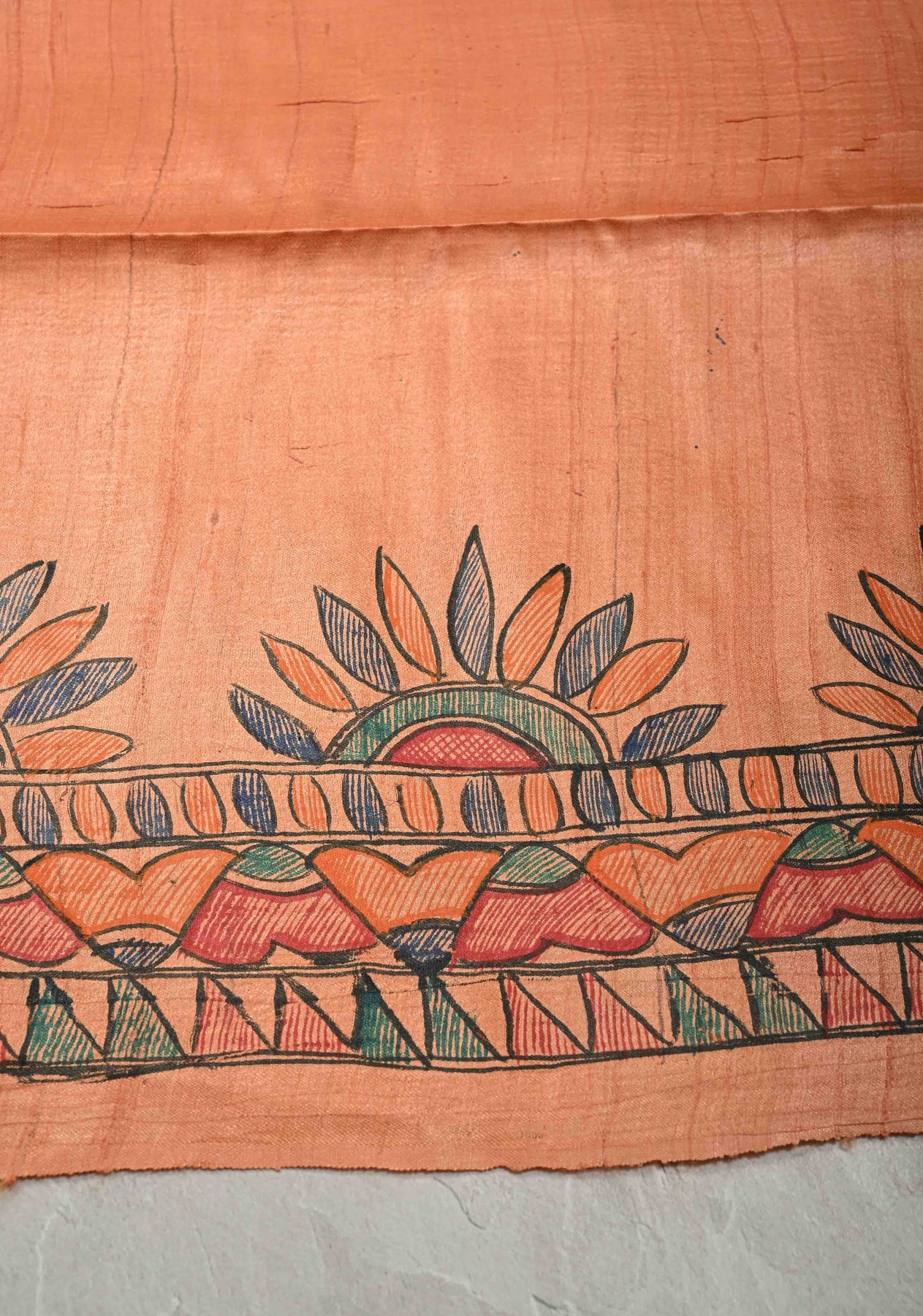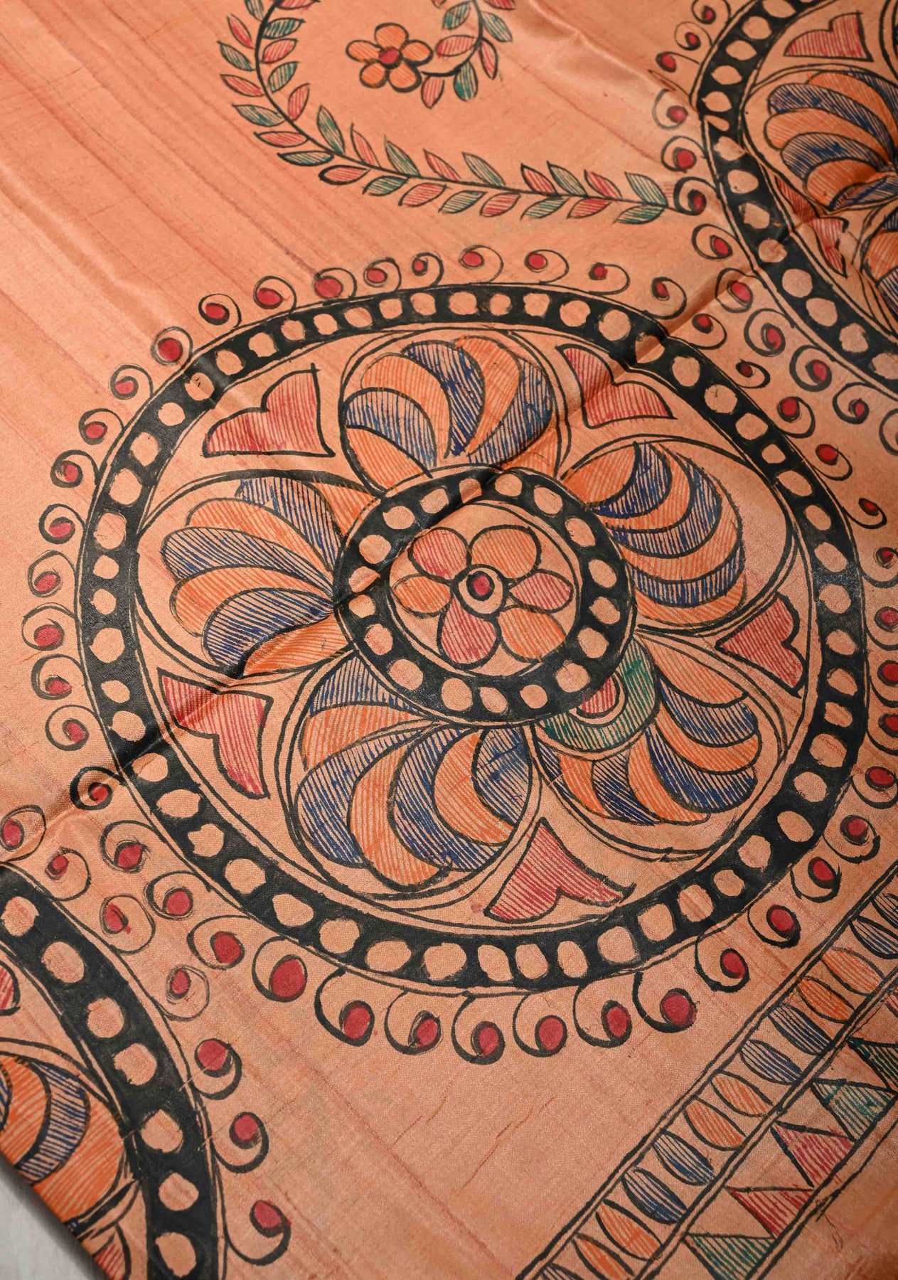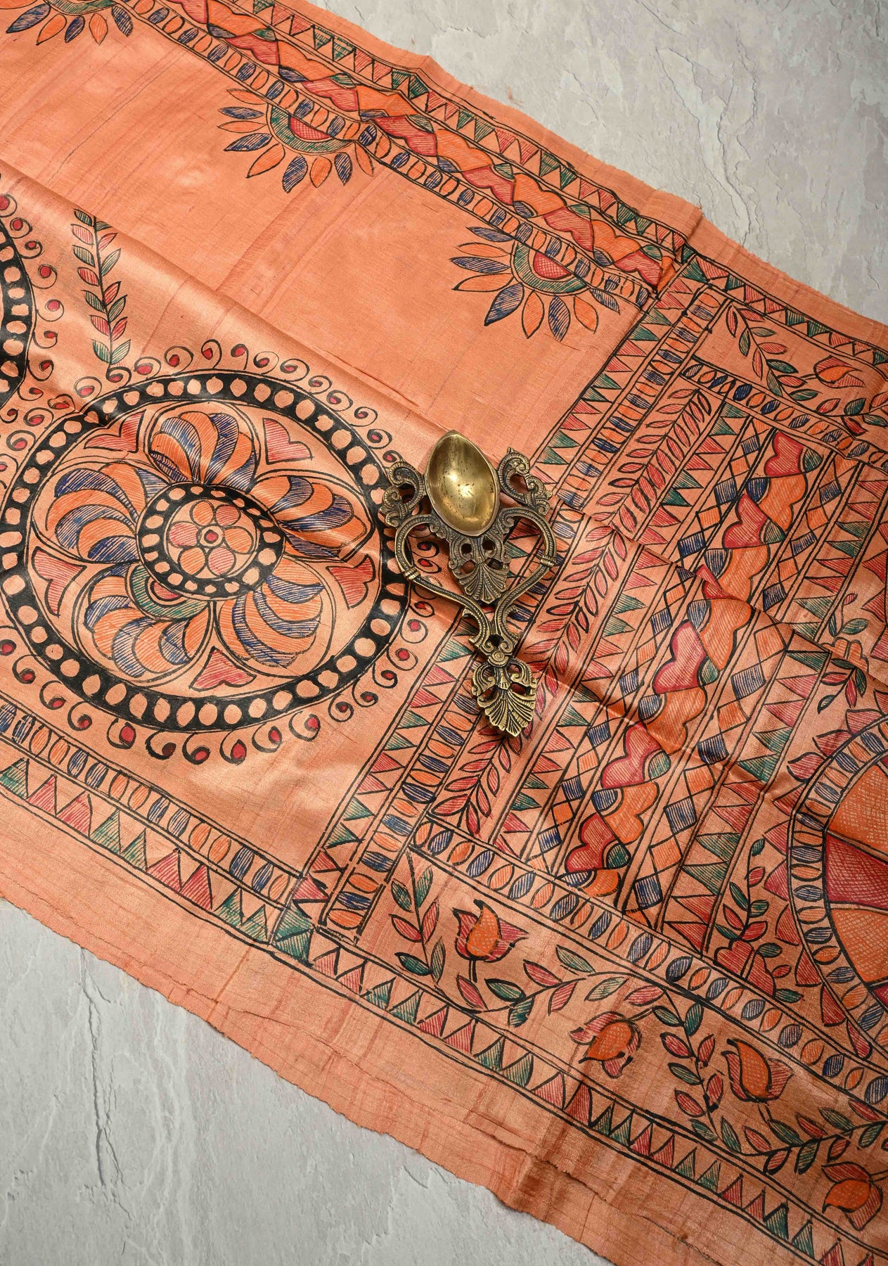 Embrace the allure of heritage with this Antique Peach Pure Tussar Silk Saree, a masterpiece of traditional Madhubani (Mithila) hand-painting. Featuring a rich, natural slubbed texture and a warm apricot glow, this saree serves as a vibrant canvas for intricate folk art. Perfect for the discerning collector, it blends earthy elegance with the divine symbolism of ancient Indian craftsmanship.