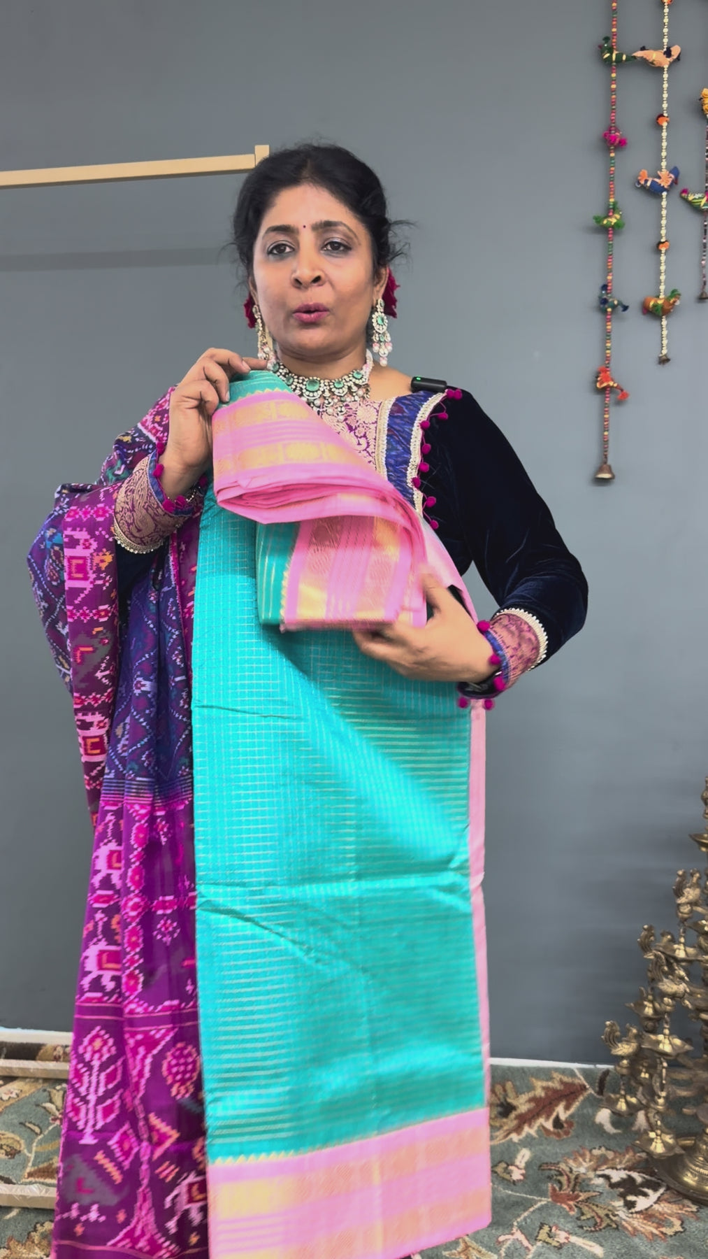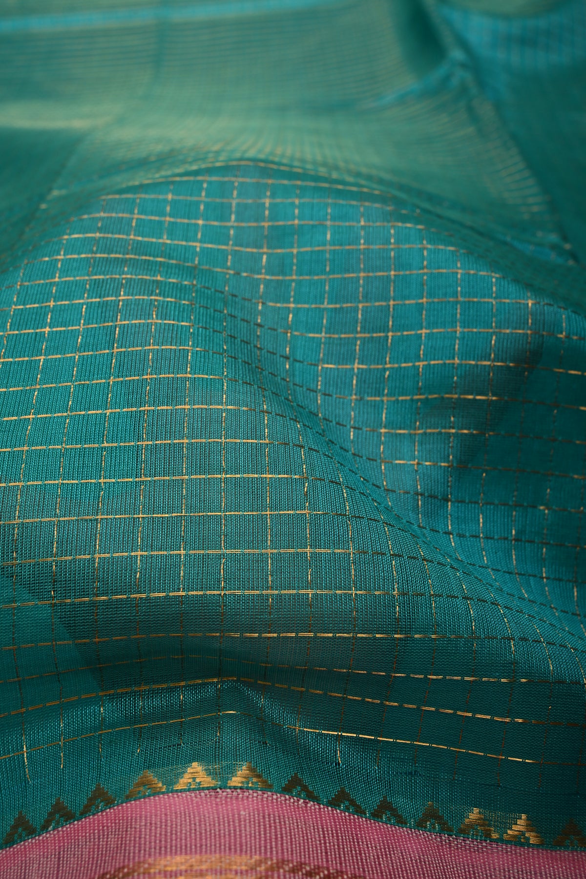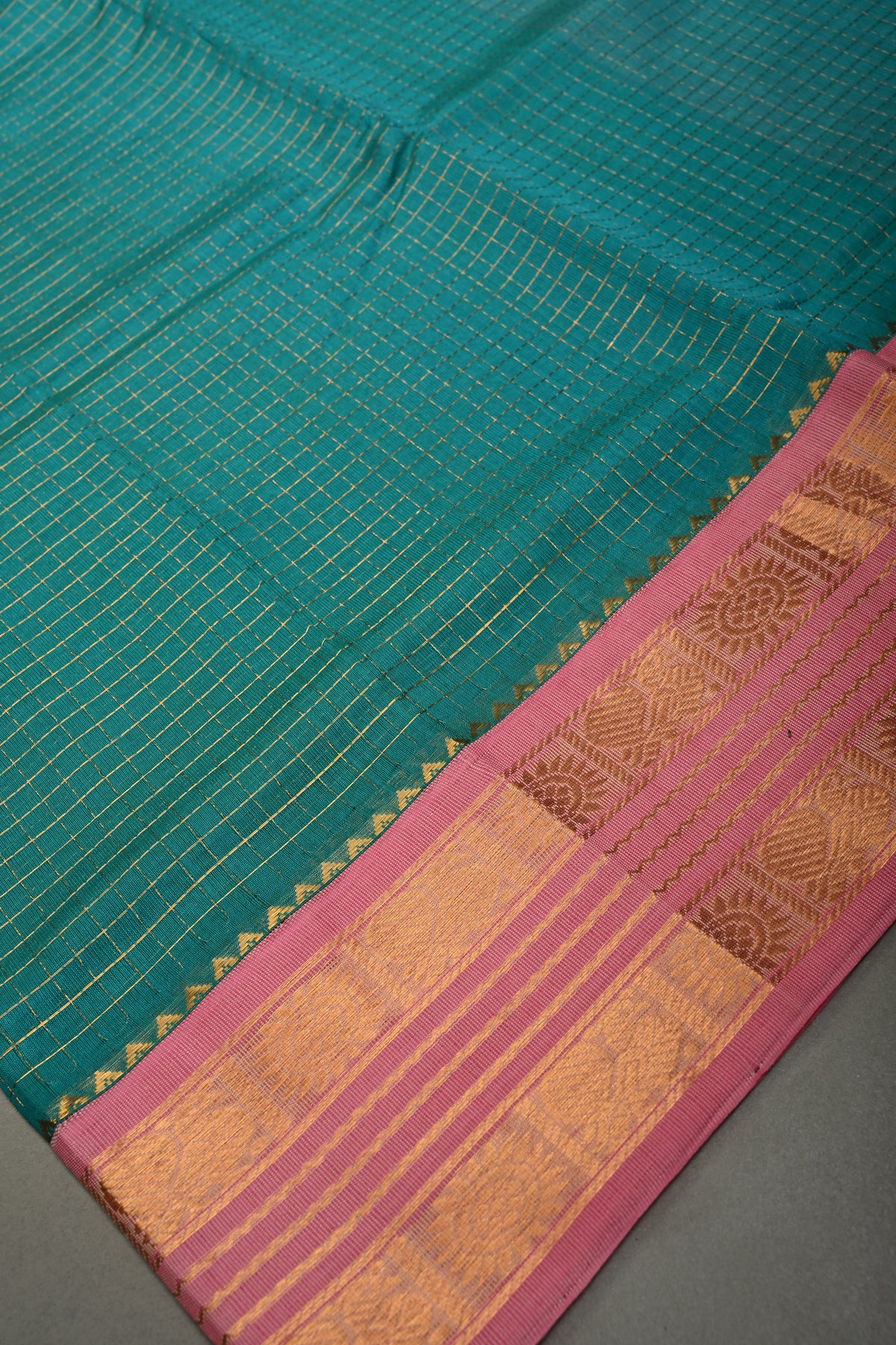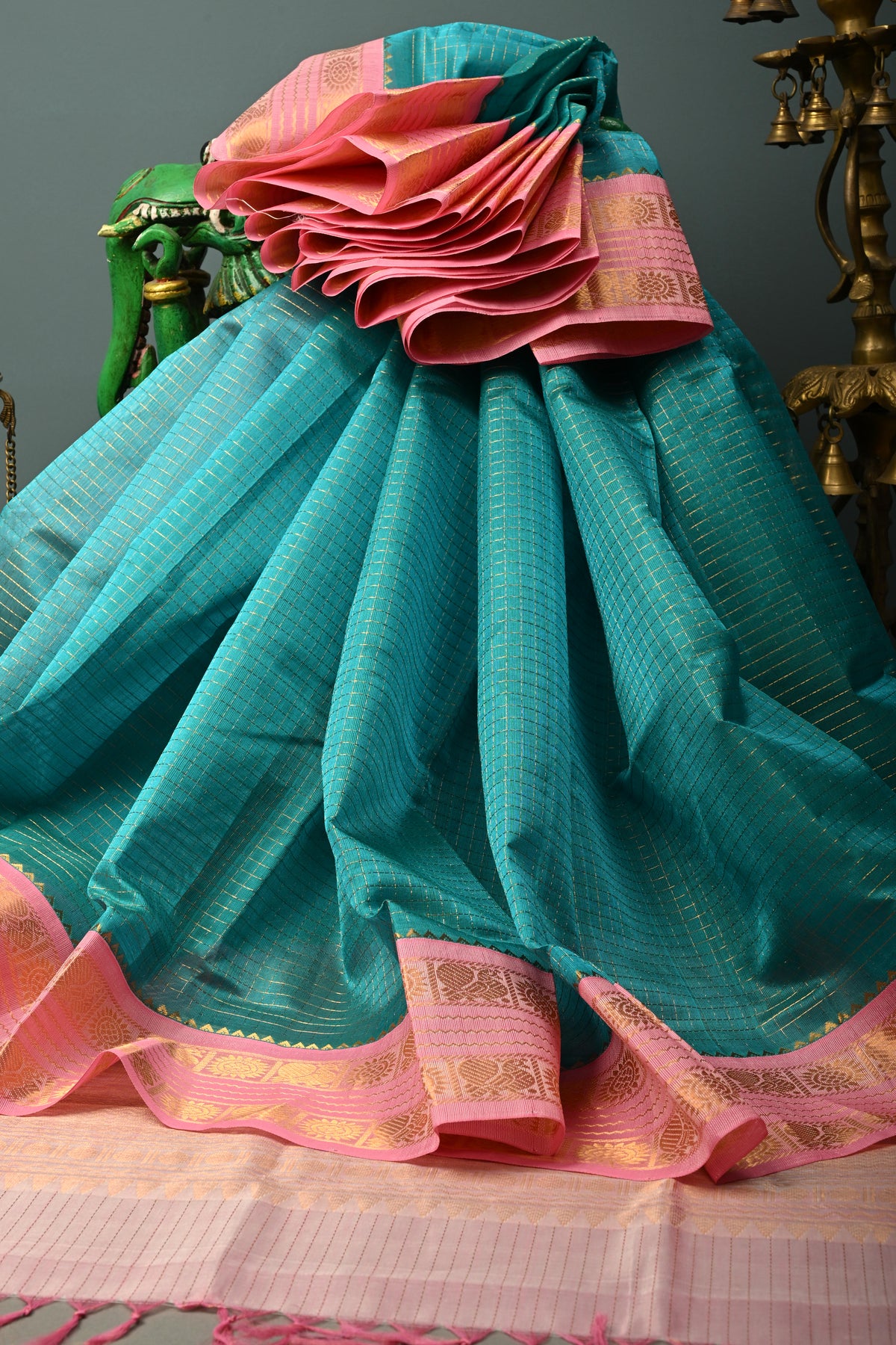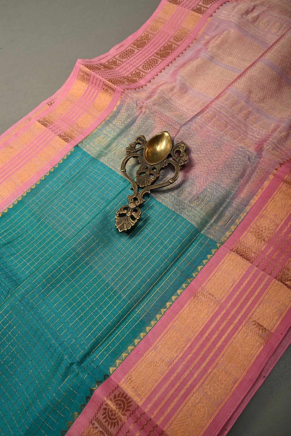 Elevate your ethnic collection with this Aqua Blue Zari Checks Korvai Kanchi Silk Cotton Saree, featuring delicate zari checks woven gracefully across the body. The refreshing aqua blue hue adds a vibrant yet soothing appeal, while the traditional korvai weaving technique enhances its authenticity. A striking contrast Baby Pink zari border beautifully frames the saree, lending it a rich festive finish. Crafted in a comfortable silk cotton blend, it offers a lightweight drape with a subtle sheen, making it perfect for celebrations, cultural events, and elegant day occasions..