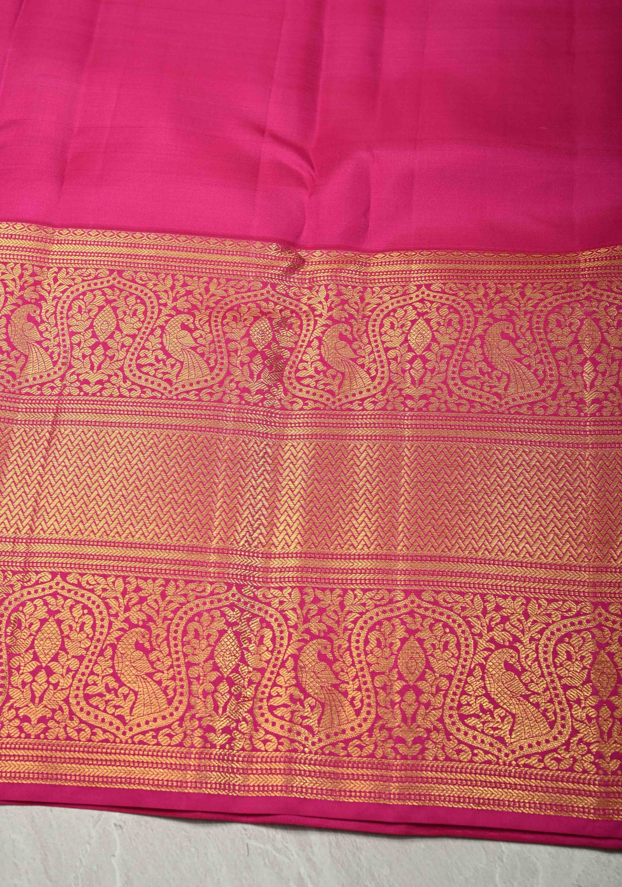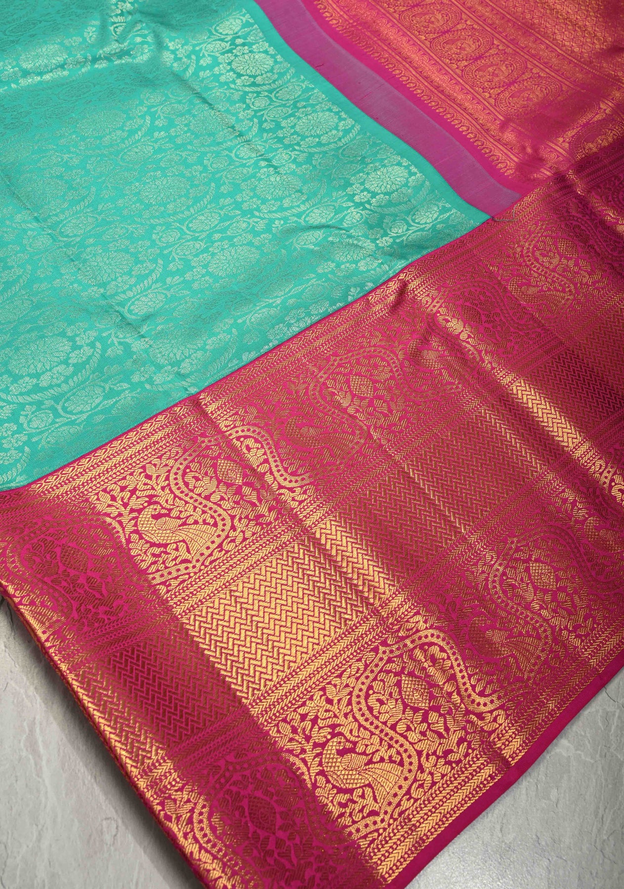Radiate timeless elegance in this Aqua Green Kanjivaram Pure Silk Saree. The vibrant sea-green body features an intricate floral brocade weave with a shimmering dual-tone effect. A magnificent, wide Rani Pink border provides a regal contrast, meticulously woven with gold Zari peacock and floral motifs. Completed by an opulent magenta pallu with heavy gold thread work, this heritage masterpiece is perfect for weddings and festive celebrations.