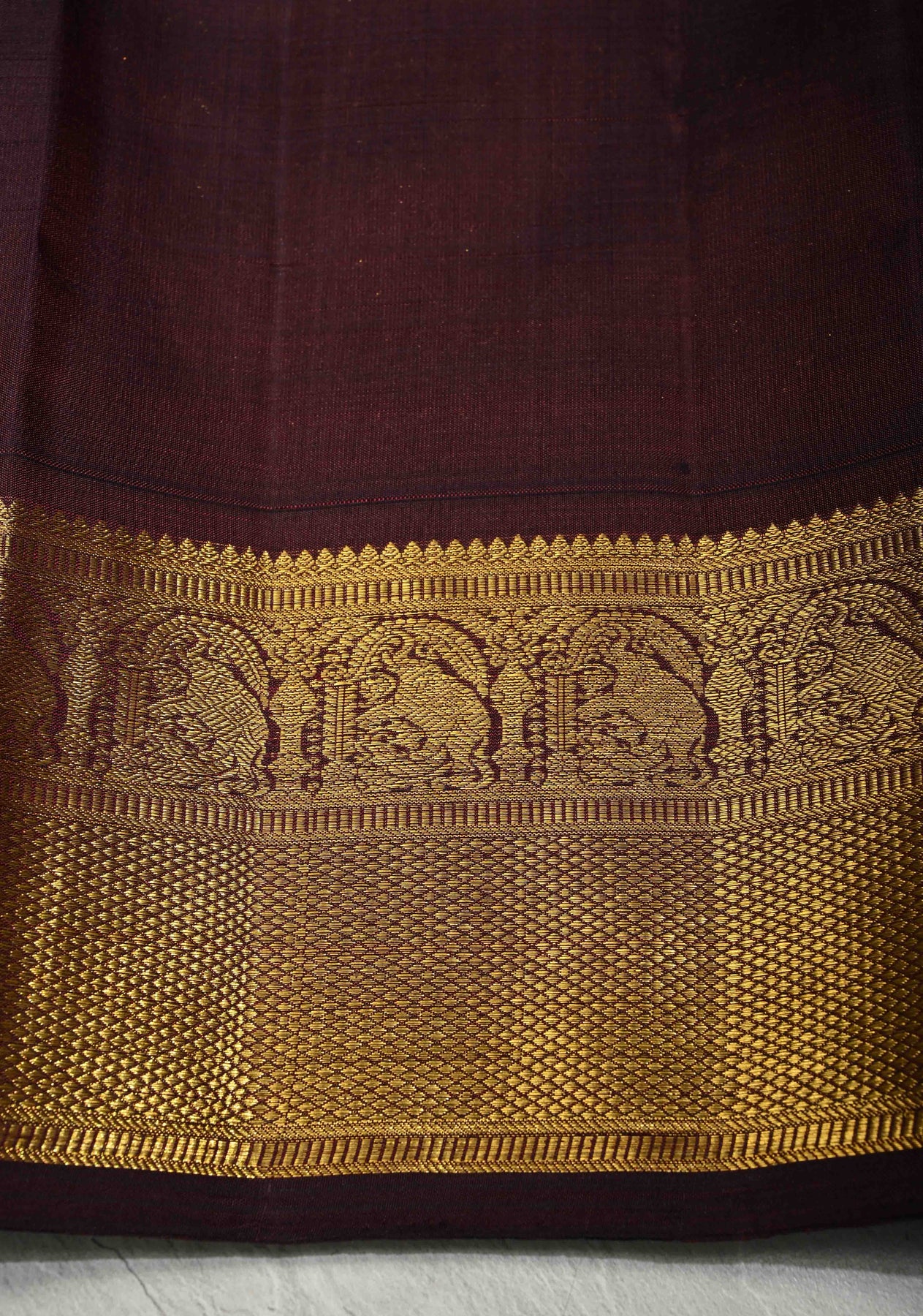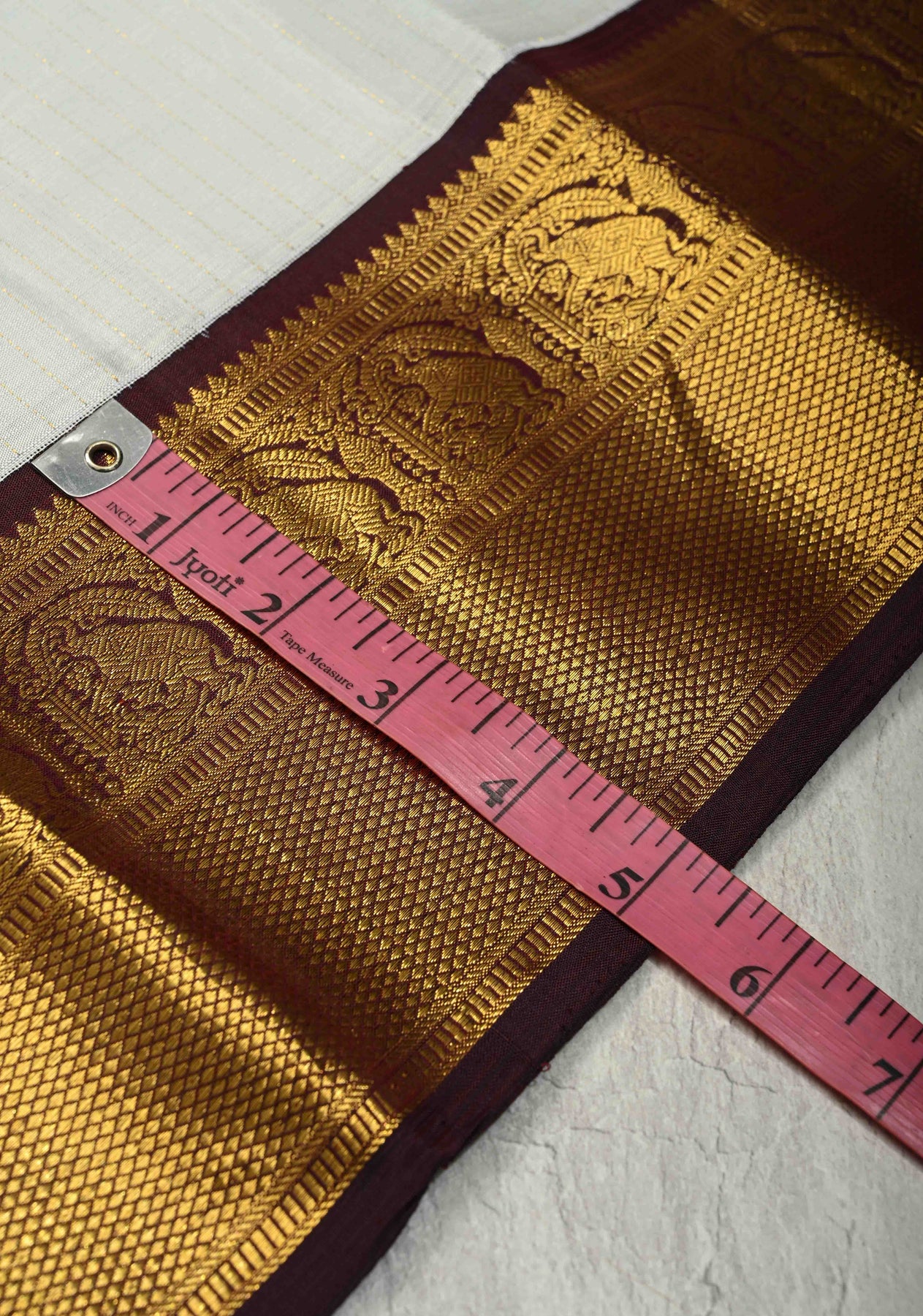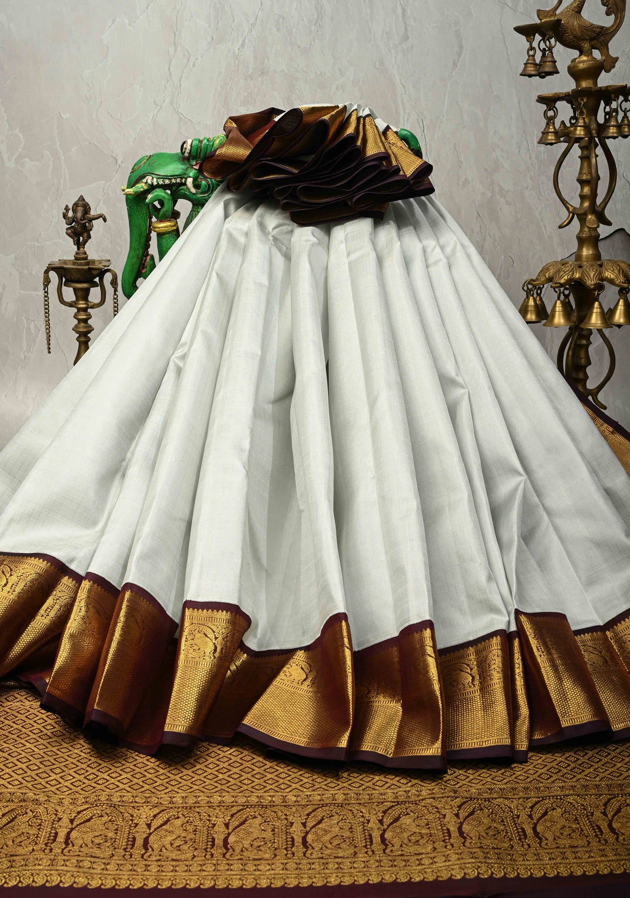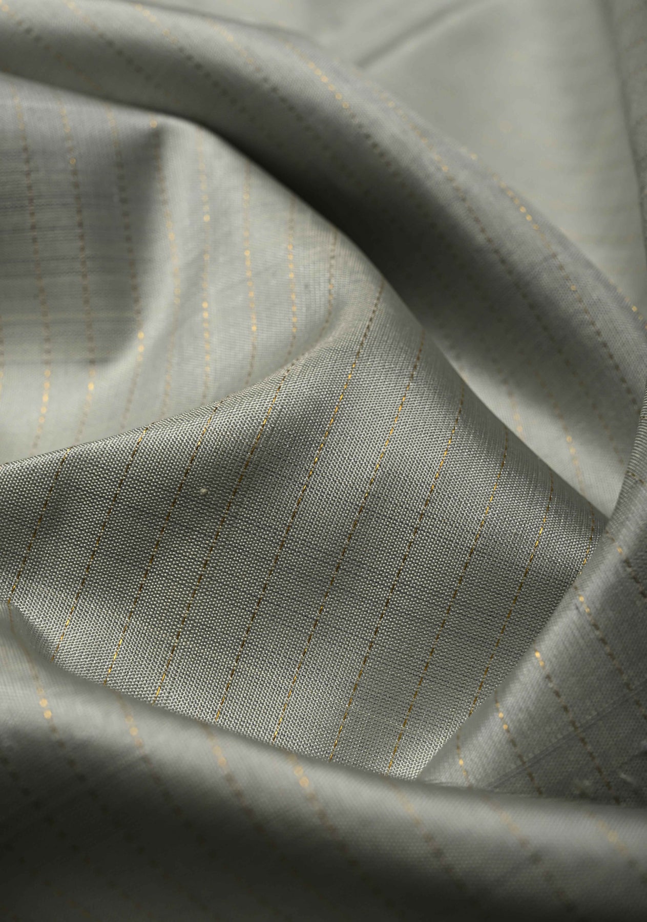 The subtle ash gray body is adorned with delicate zari stripes, adding shimmer and structured elegance. A contrast zari border, expertly joined through the korvai method, enhances the saree’s refinement and showcases authentic Kanchipuram artistry. A timeless piece for those who appreciate understated elegance with heritage appeal.