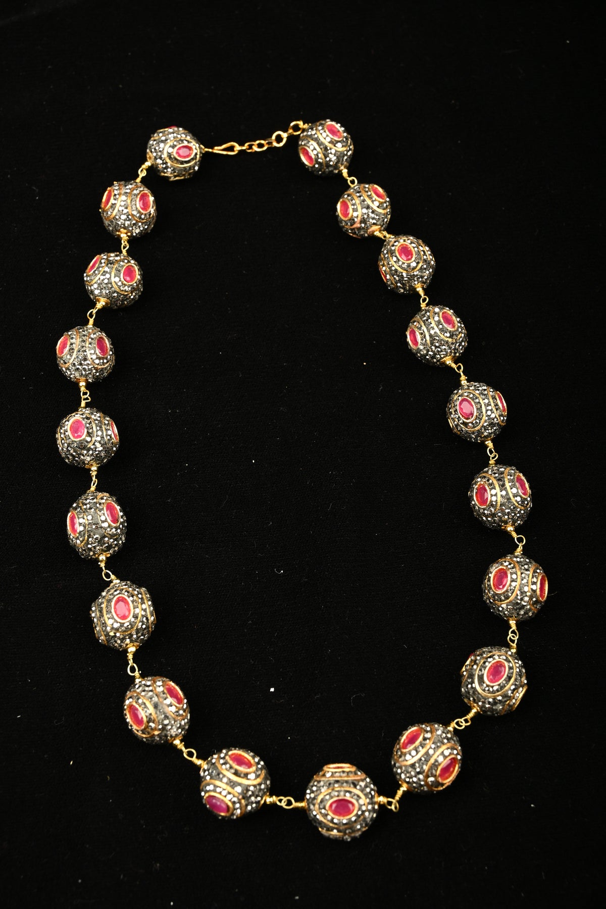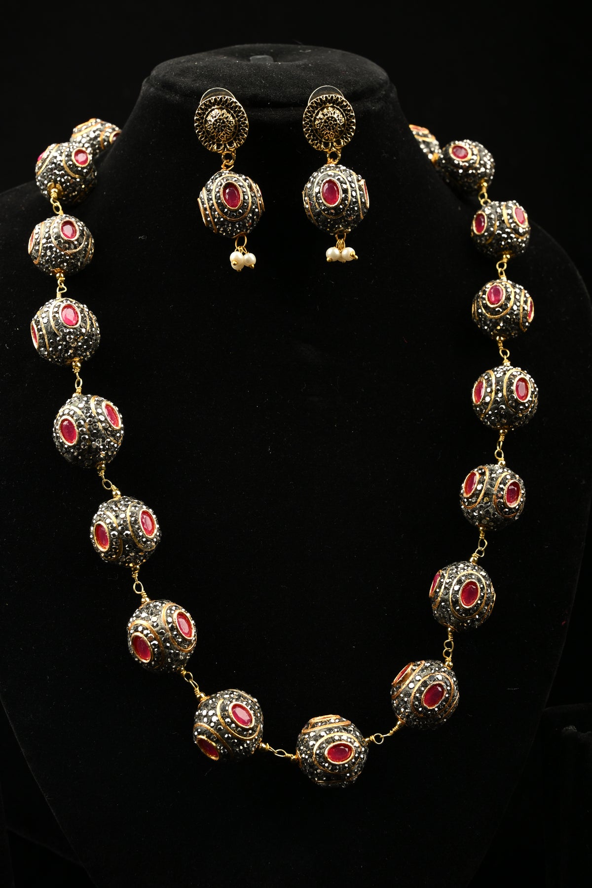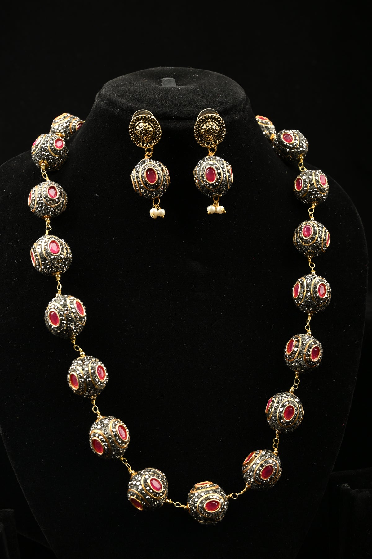 A striking celebration of old-world artistry, this statement necklace features intricately crafted spherical beads adorned with detailing and red inlays. The antique gold finish enhances its regal character