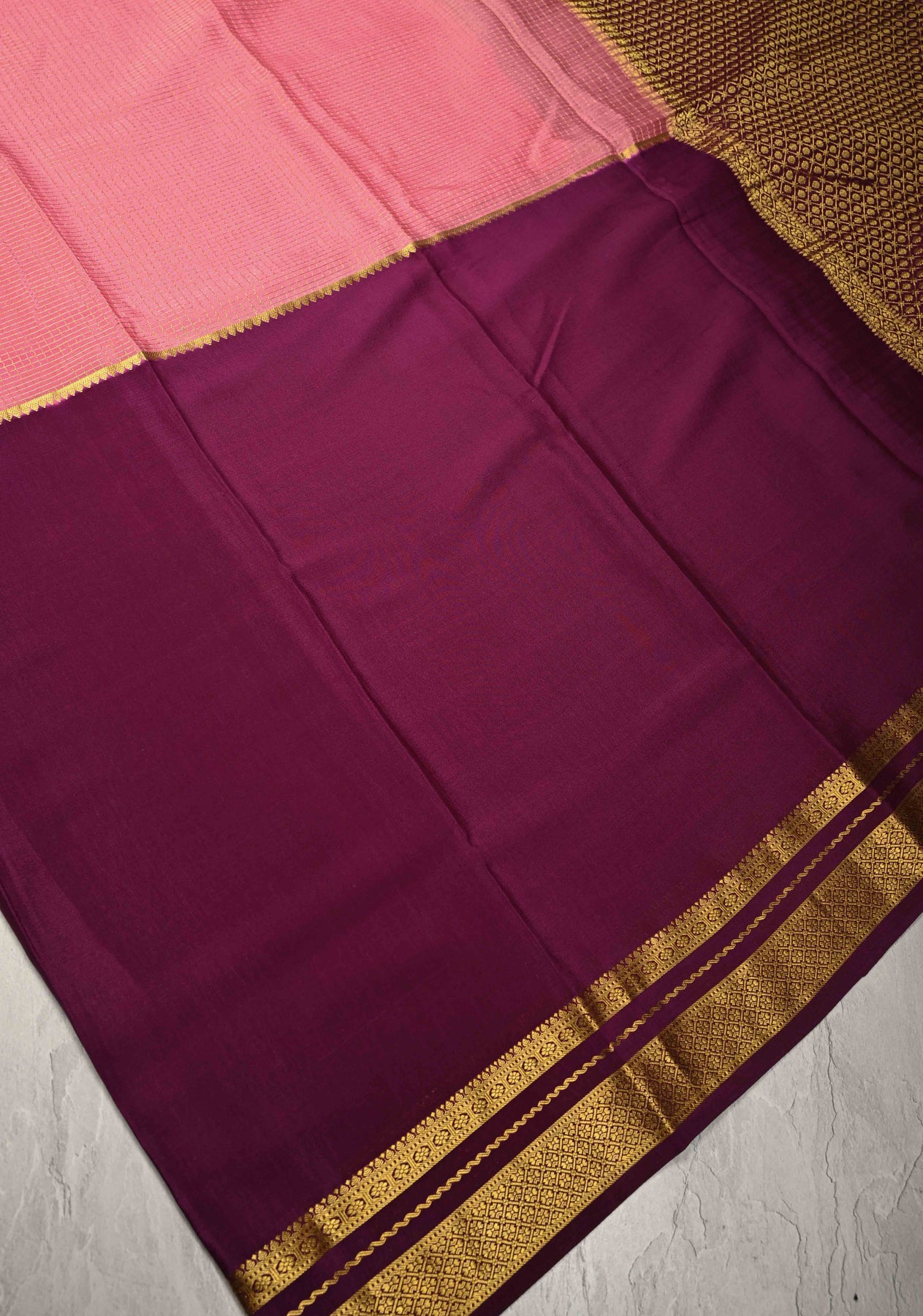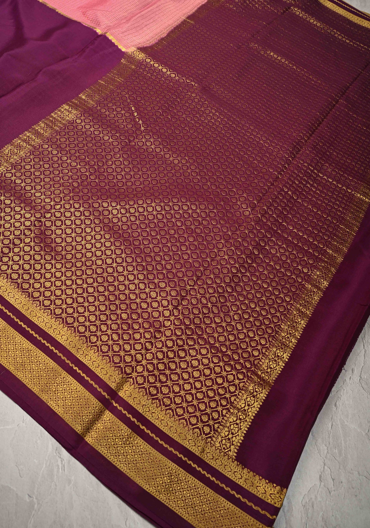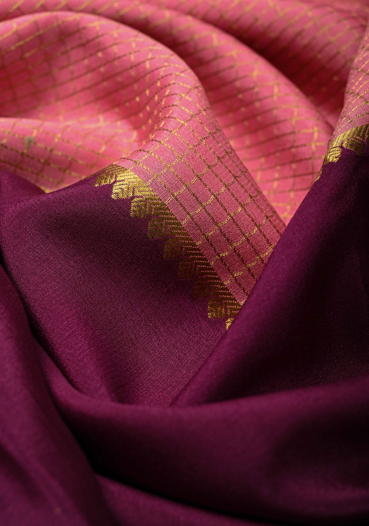 Aubergine Pure Mysore Silk Saree with Podi-Kattam Zari Checks on Rose Pink and Zari Border in KSIC Grade Thickness | SILK MARK CERTIFIED