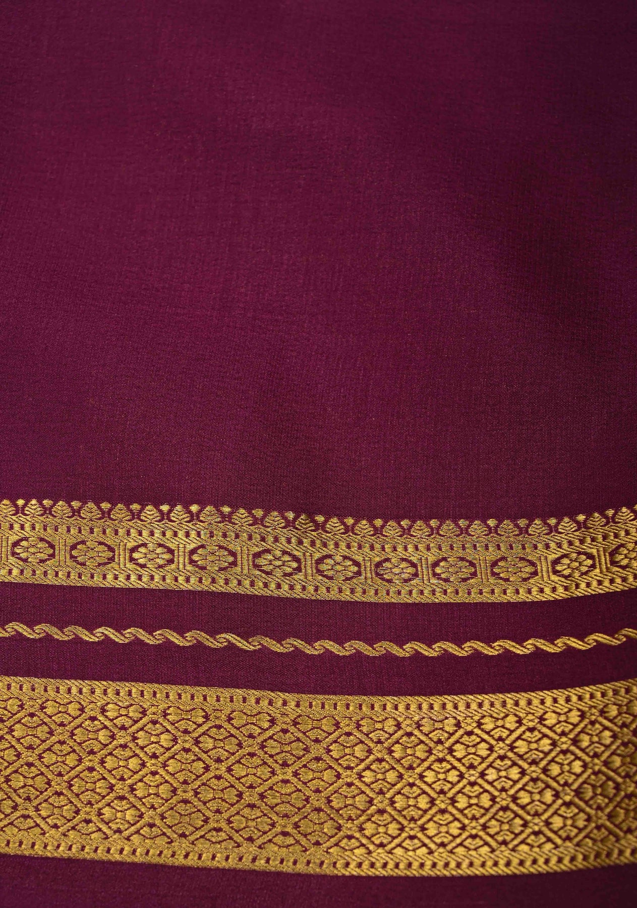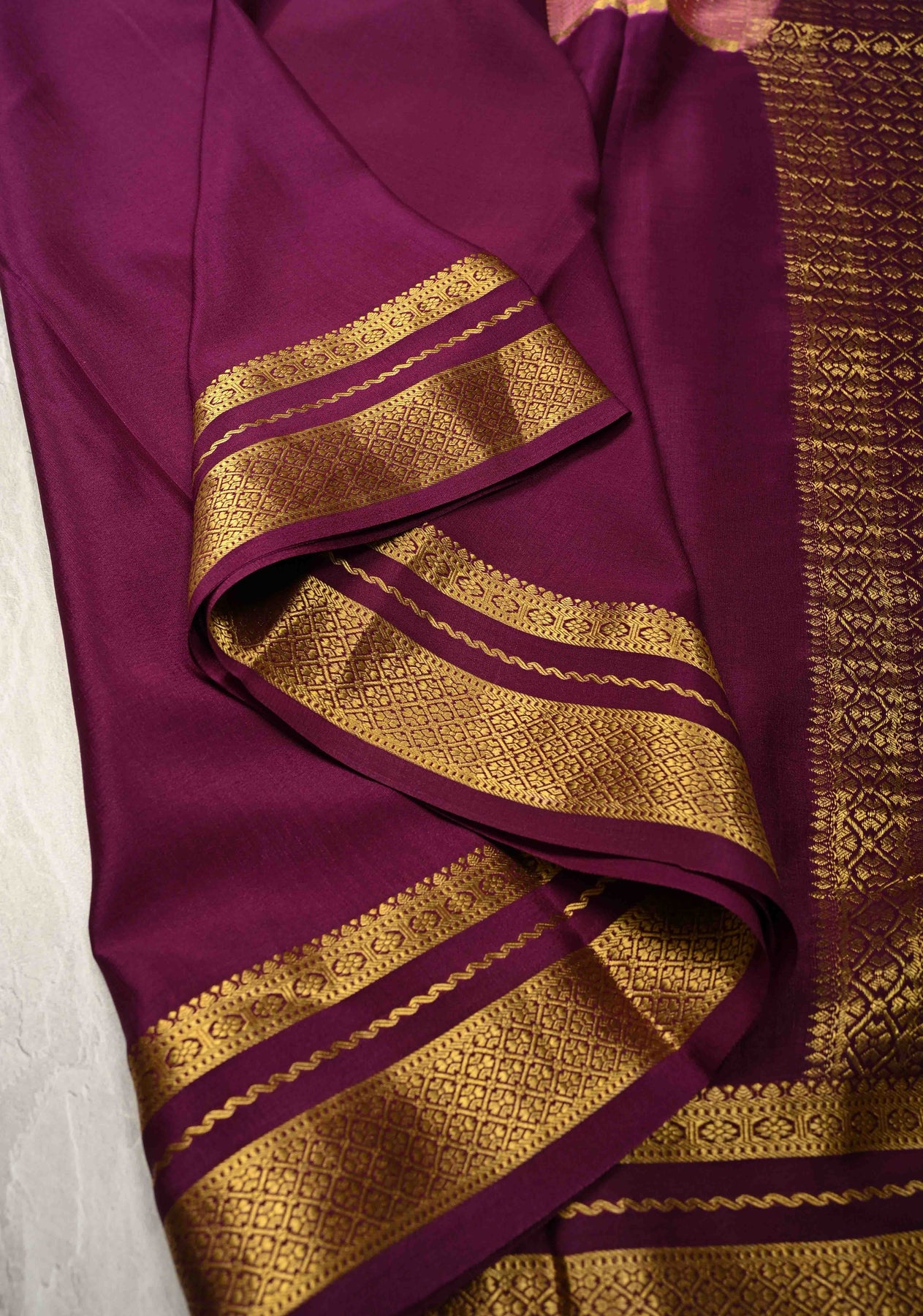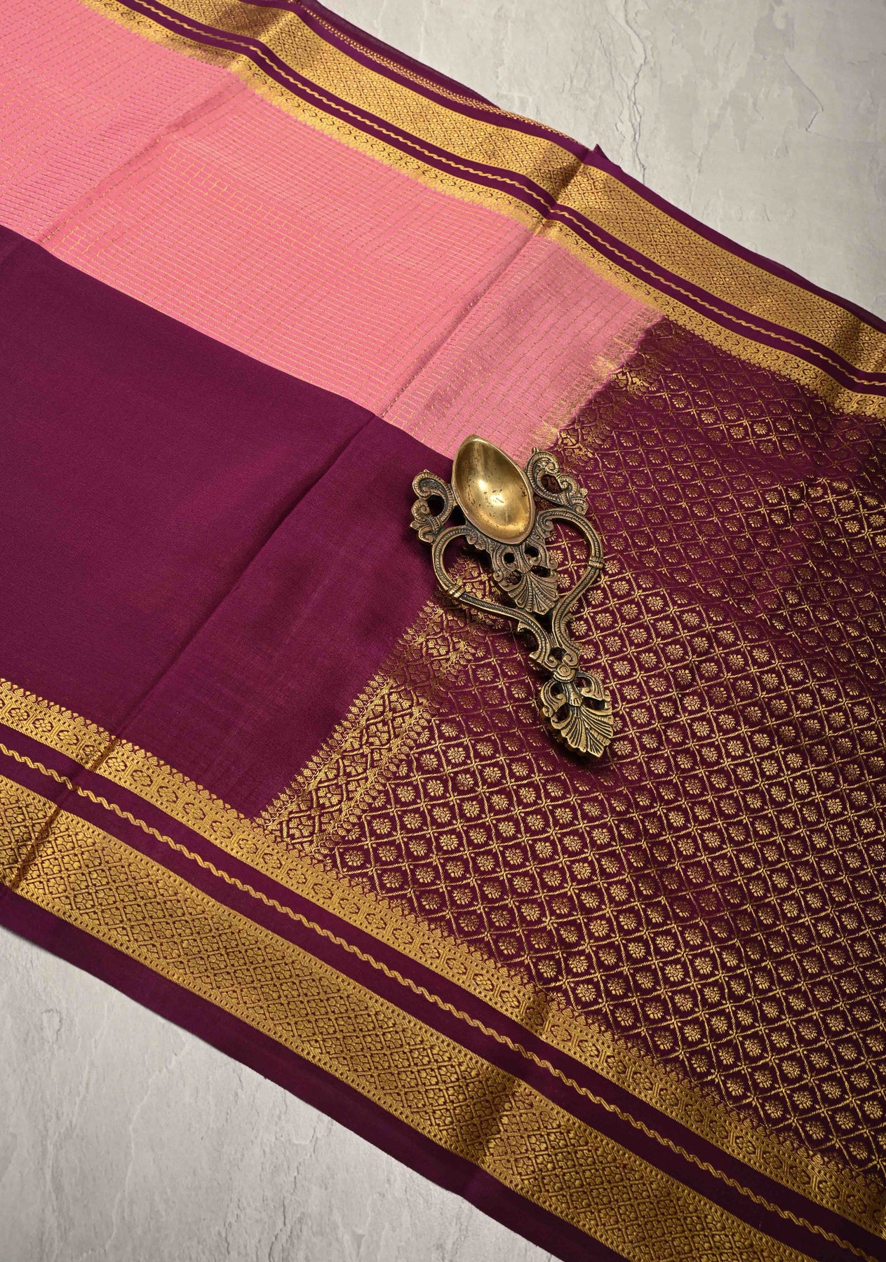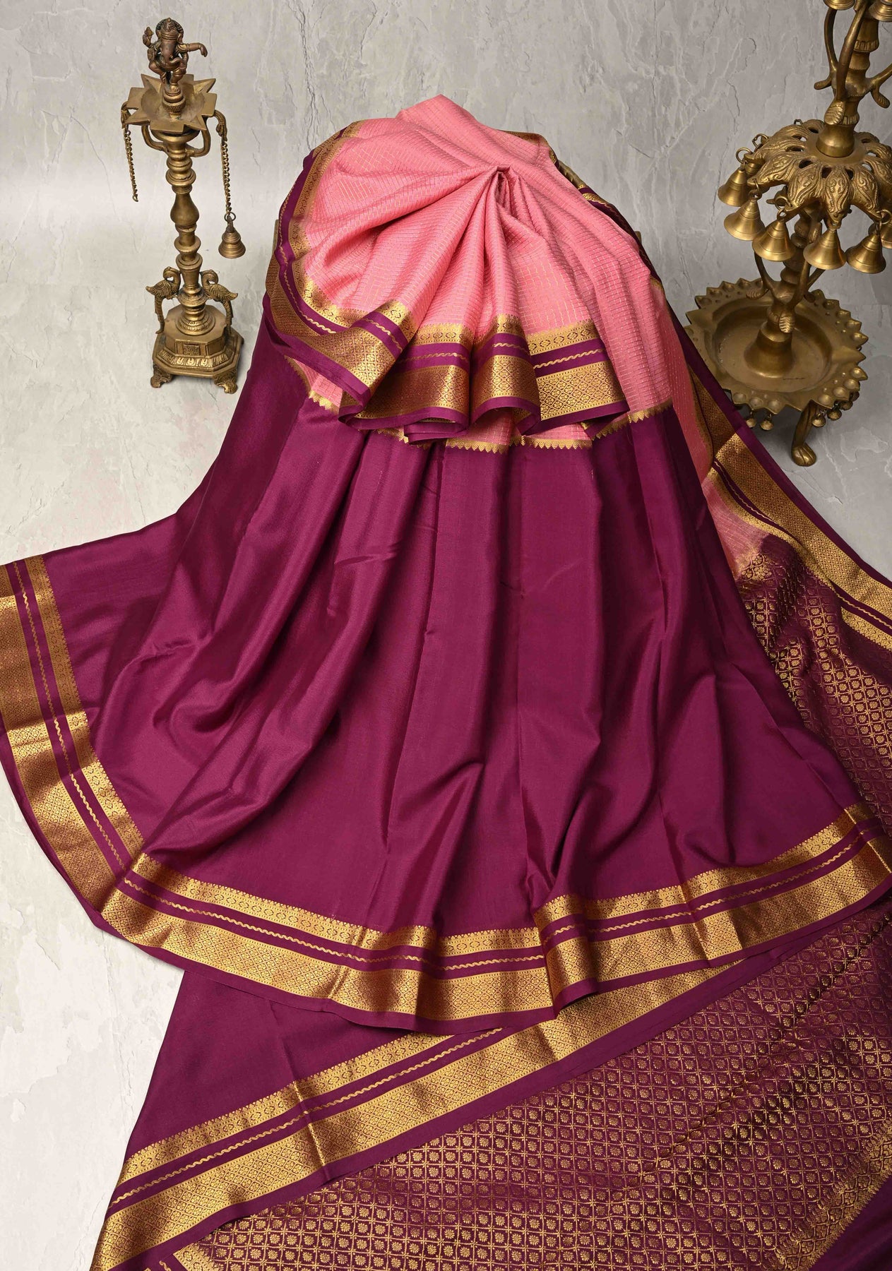 Aubergine Pure Mysore Silk Saree with Podi-Kattam Zari Checks on Rose Pink and Zari Border in KSIC Grade Thickness | SILK MARK CERTIFIED