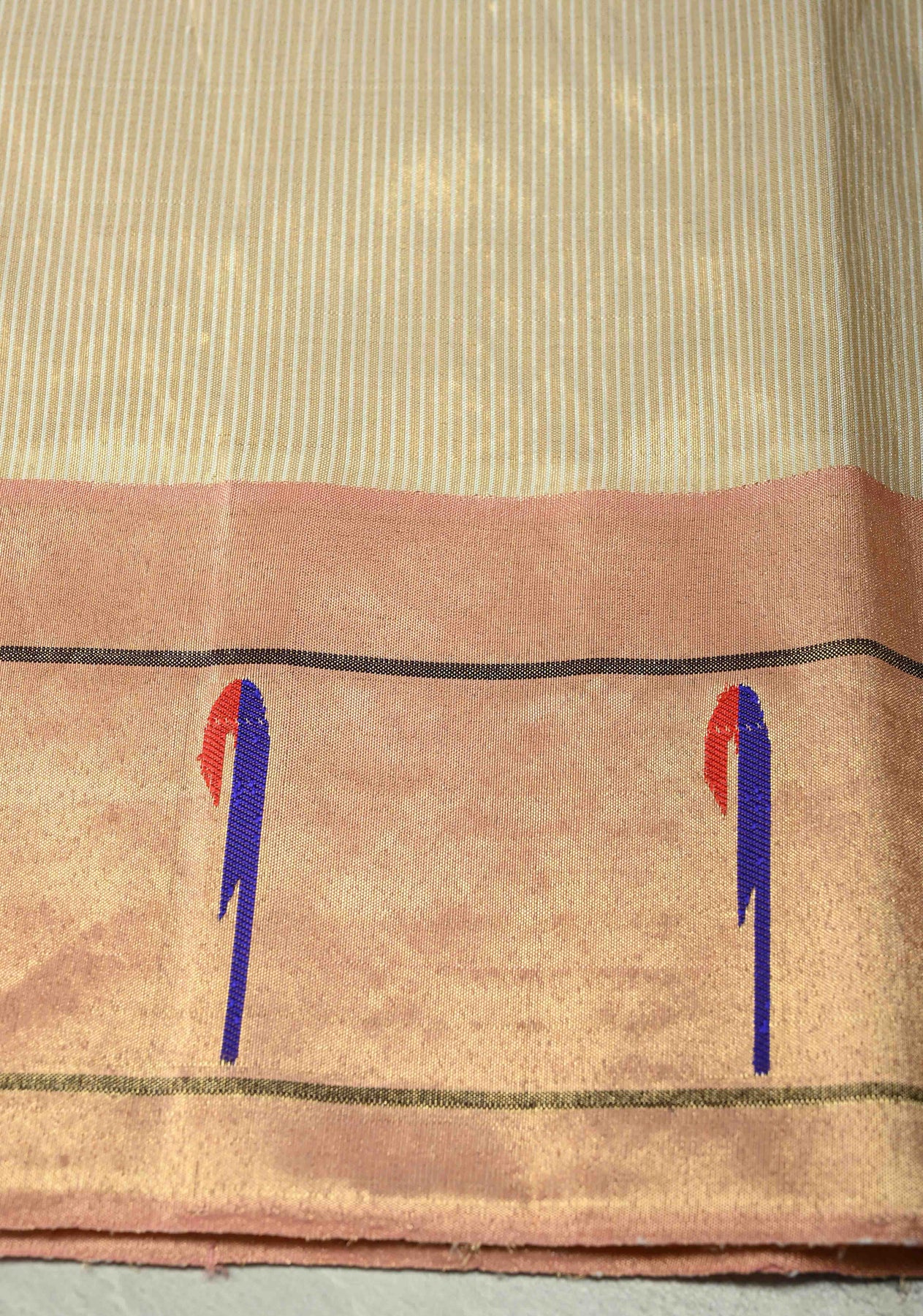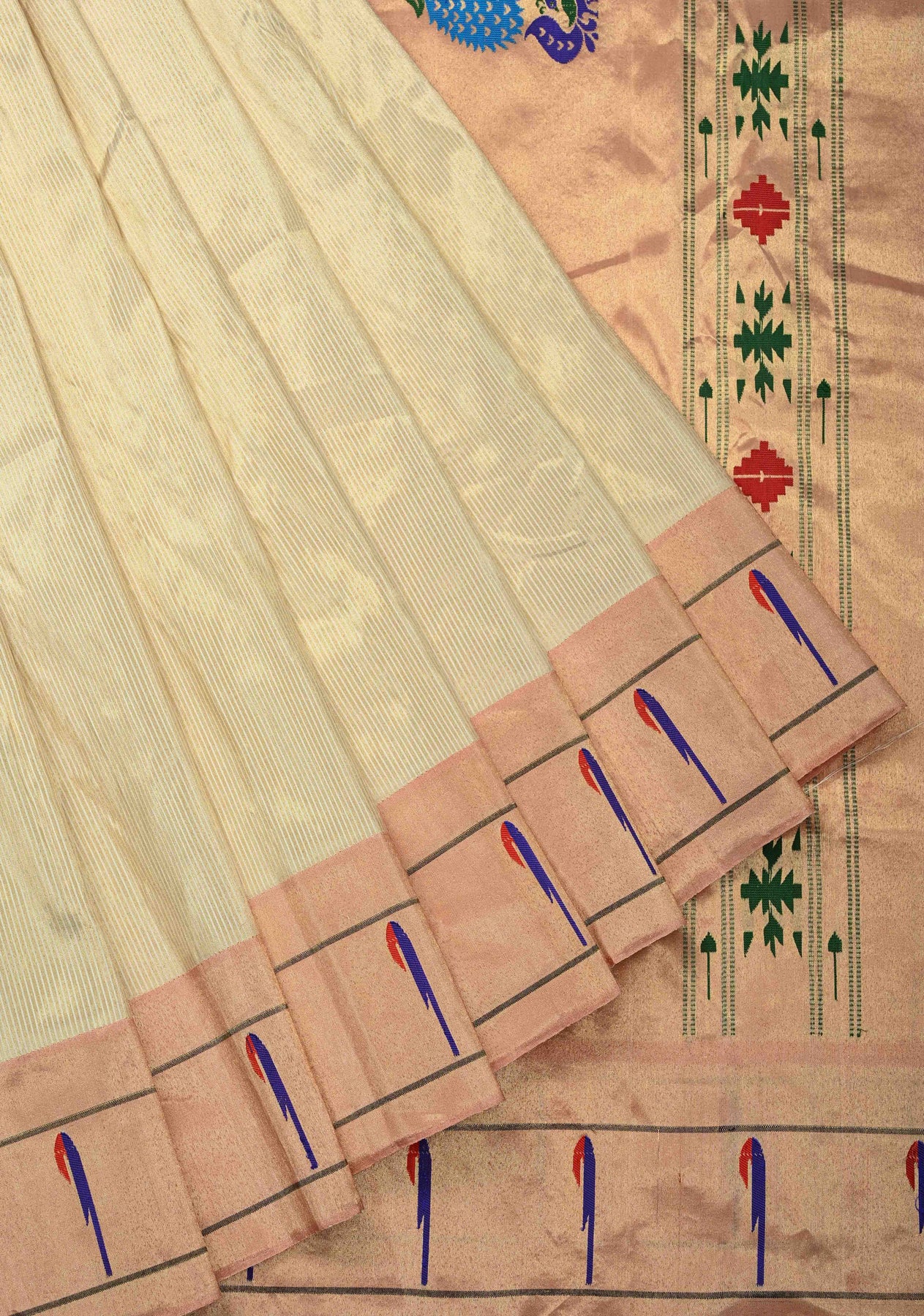 The Authentic Off White Yeola Paithani Handloom Silk Saree is a timeless masterpiece that reflects the rich heritage of Maharashtrian weaving. Crafted from handloom silk, this saree features a serene off-white body that exudes grace and subtle elegance. Its signature single muniya borders—tiny, finely woven parrot motifs in vibrant hues—add a touch of traditional charm while maintaining a refined look. The highlight of the saree is the exquisite pallu adorned with detailed peacock motifs, woven in rich, multi-hued zari that showcases the intricate artistry of Yeola Paithani craftsmanship. Lightweight, luxurious, and culturally rooted, this saree is perfect for weddings, festive occasions, and special celebrations, offering a blend of sophistication and tradition.