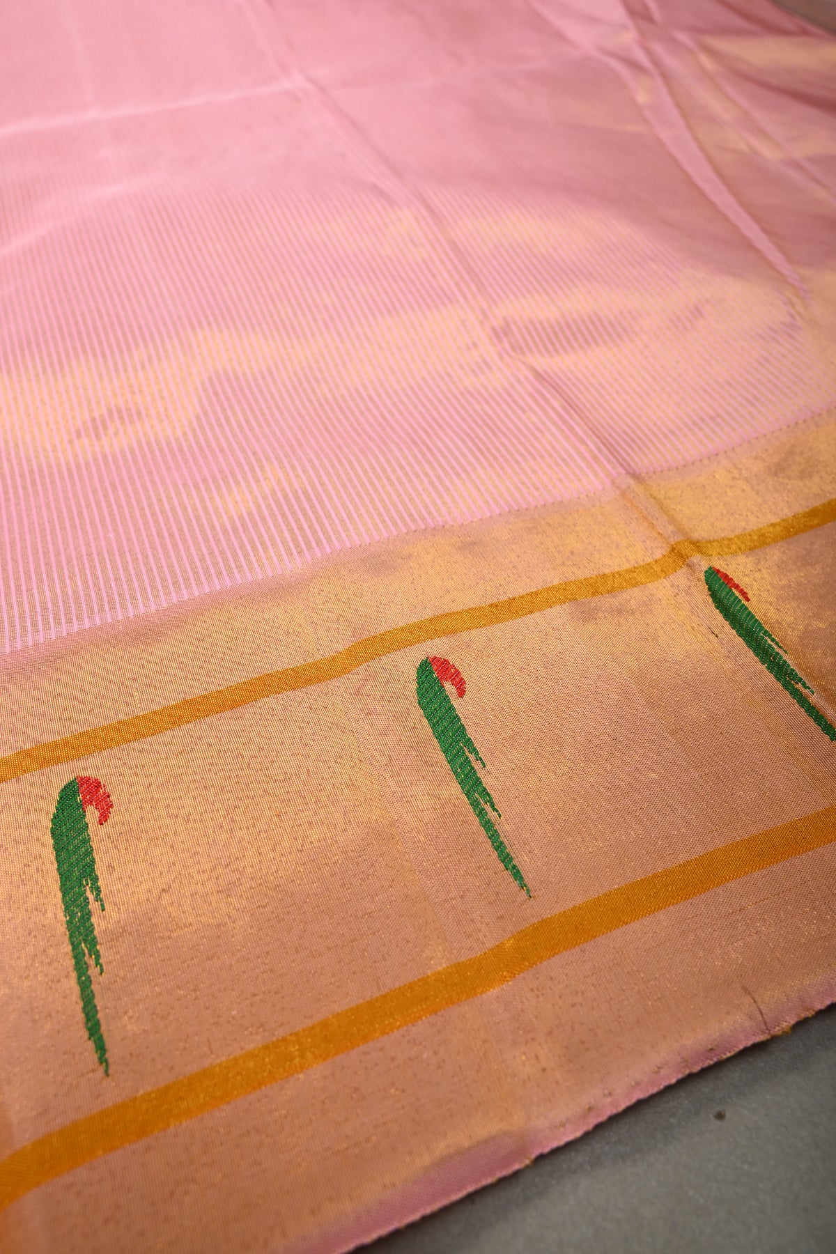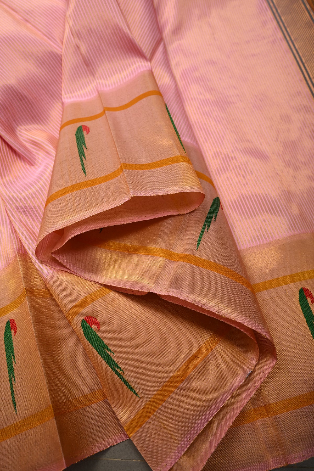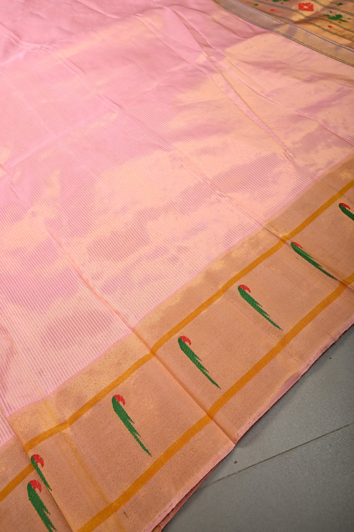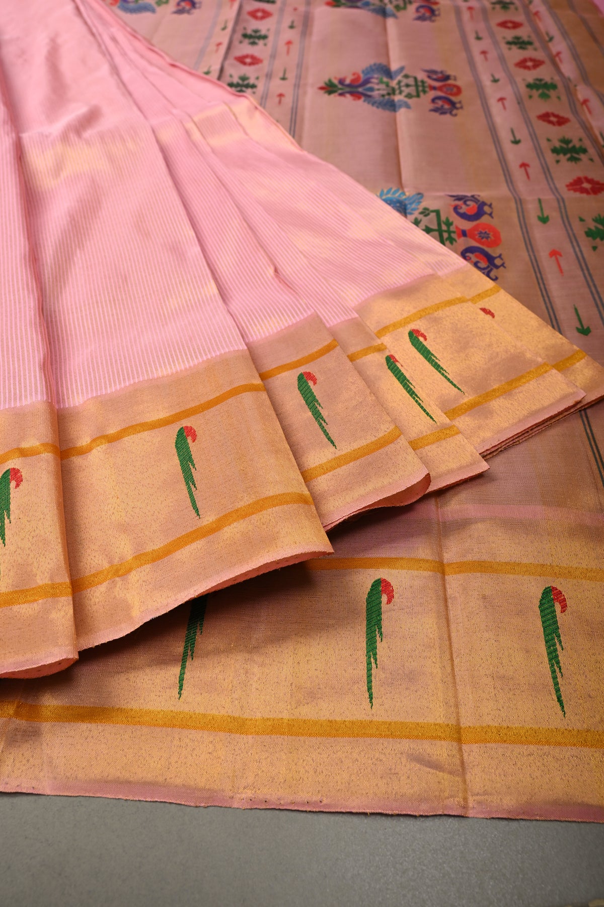 Embrace timeless elegance with this Authentic Pink Yeola Paithani Handloom Silk Saree with Single Muniya Borders and Peacock Motifs on Pallu. Handwoven with meticulous craftsmanship, this saree is a true reflection of the heritage of Yeola Paithani silk, celebrated for its fine texture, vibrant colors, and luxurious finish.