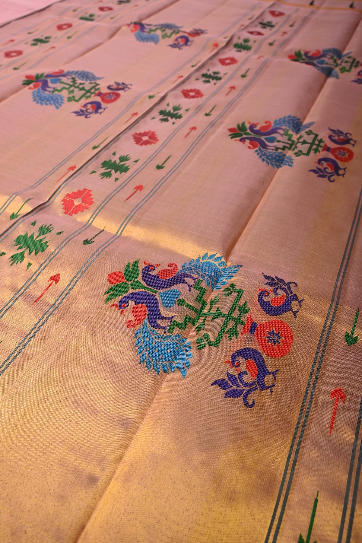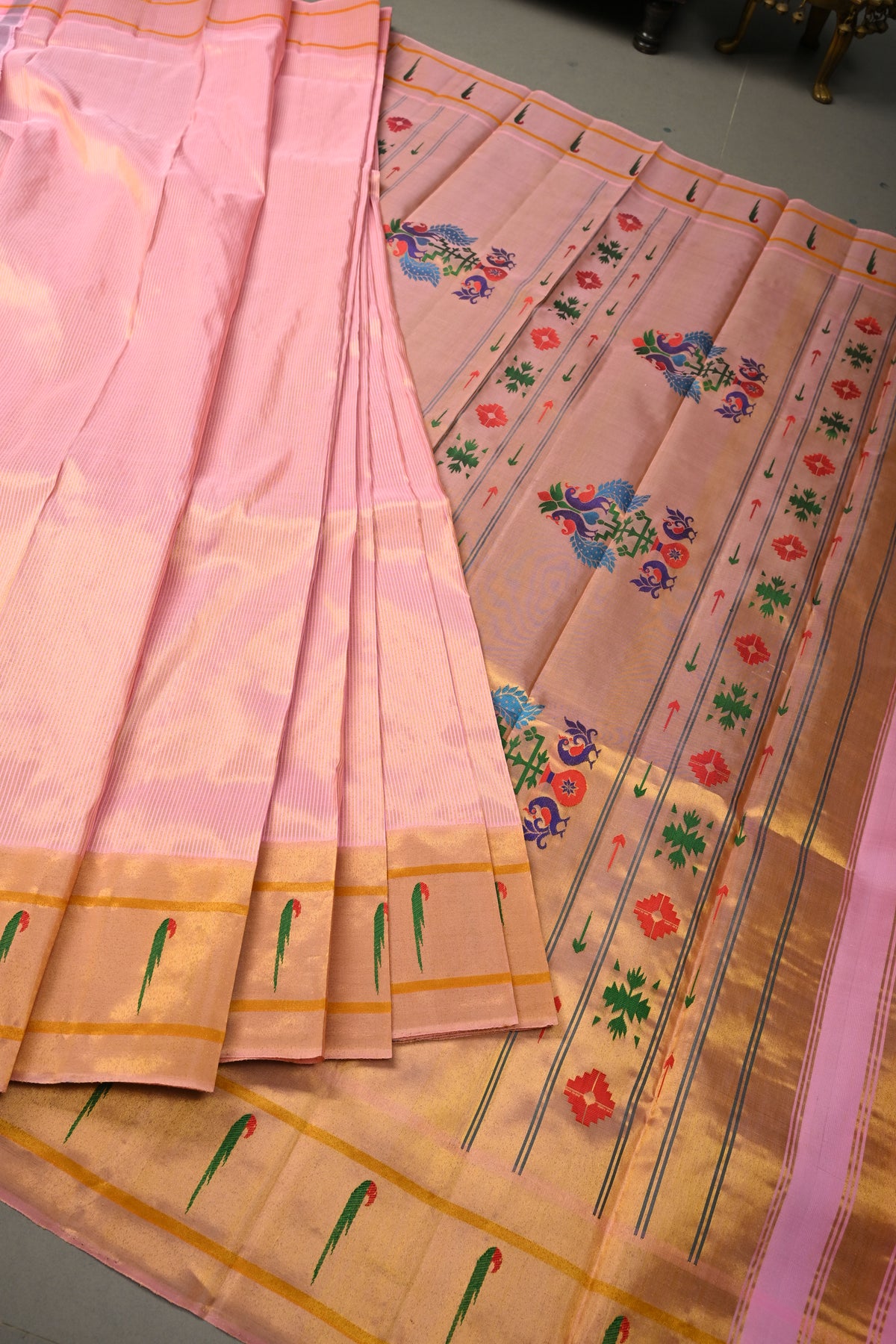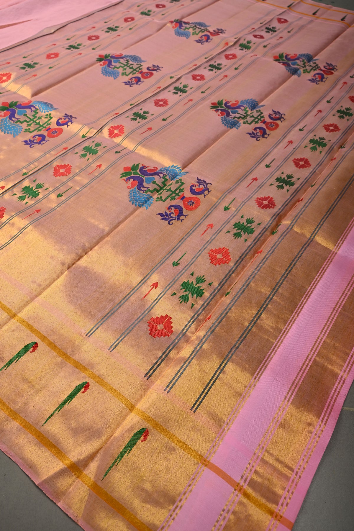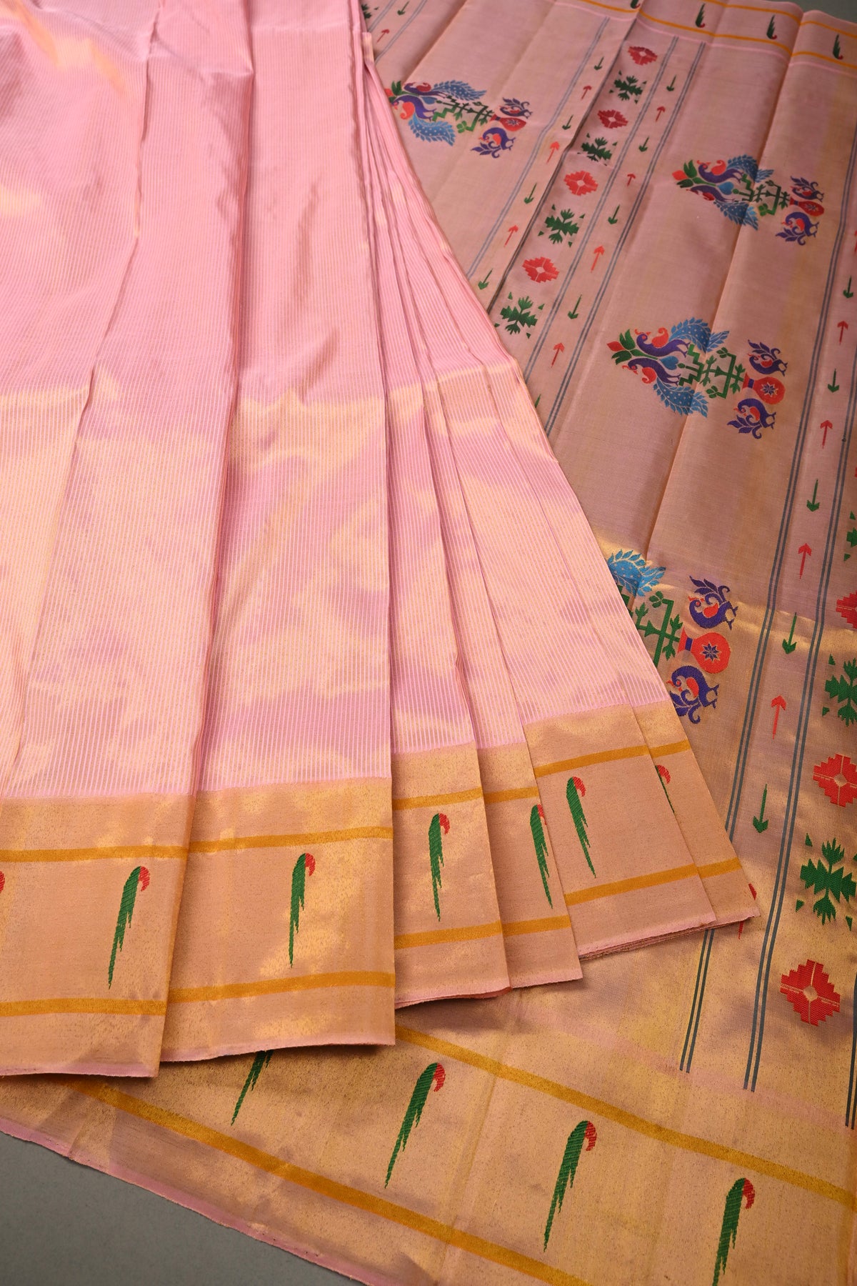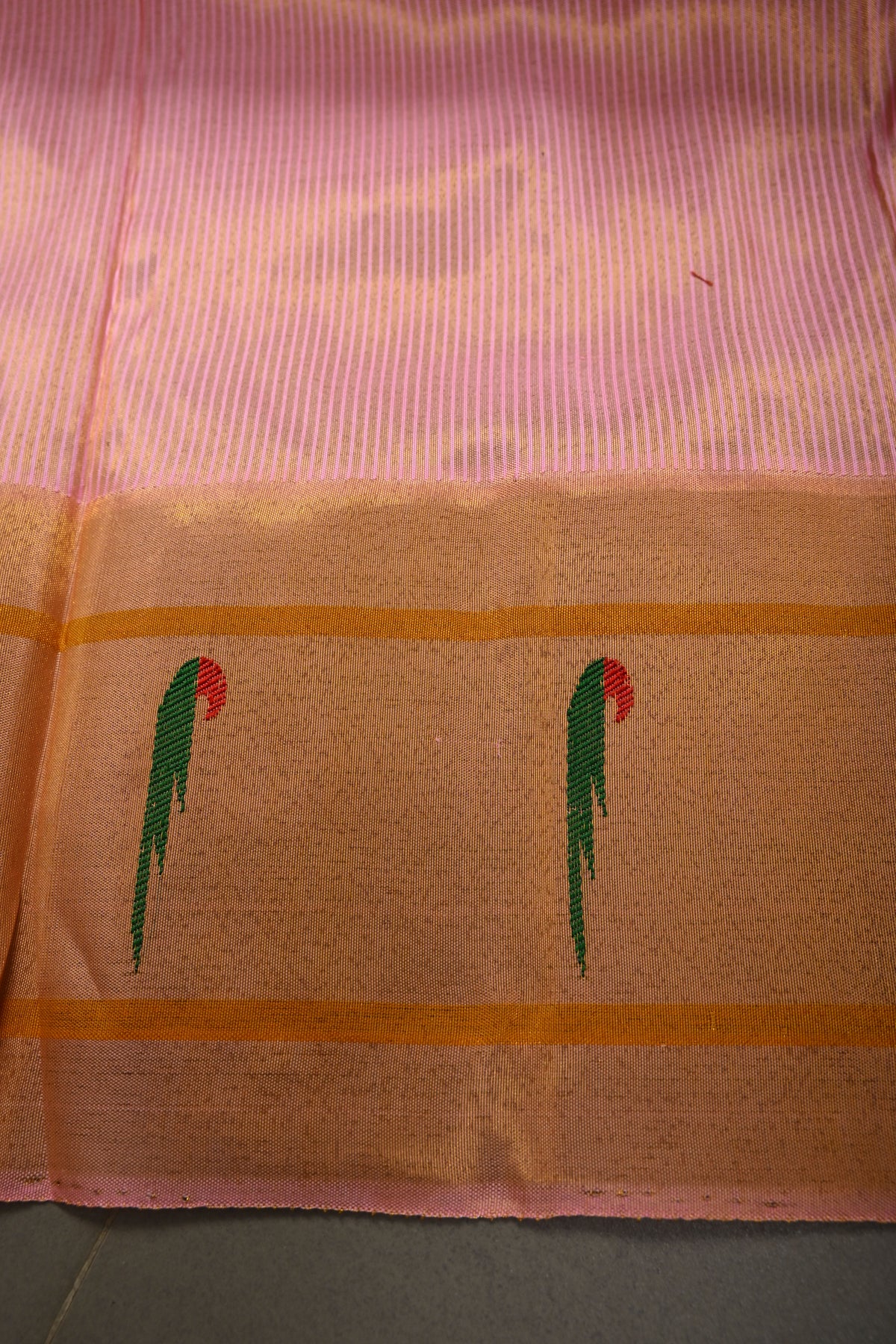 Embrace timeless elegance with this Authentic Pink Yeola Paithani Handloom Silk Saree with Single Muniya Borders and Peacock Motifs on Pallu. Handwoven with meticulous craftsmanship, this saree is a true reflection of the heritage of Yeola Paithani silk, celebrated for its fine texture, vibrant colors, and luxurious finish.