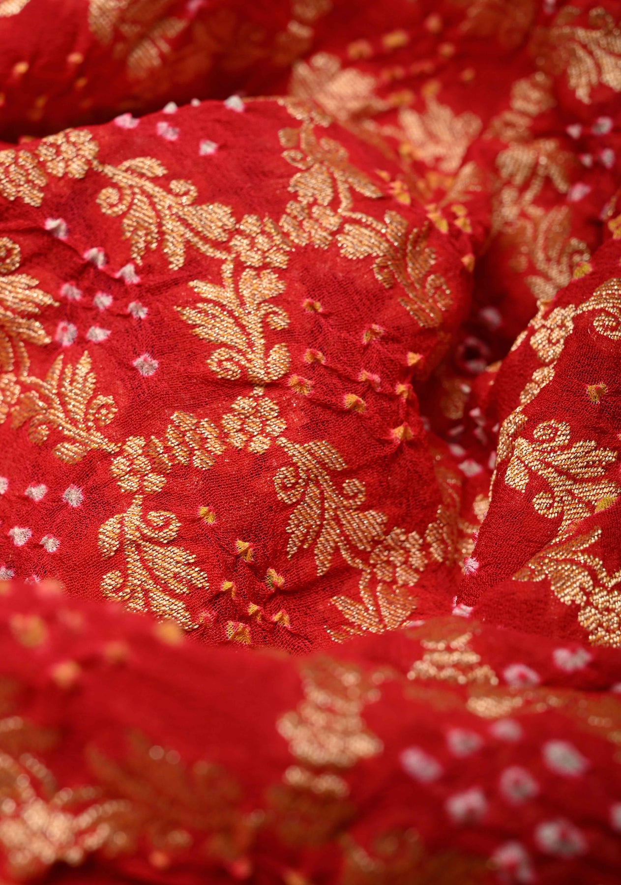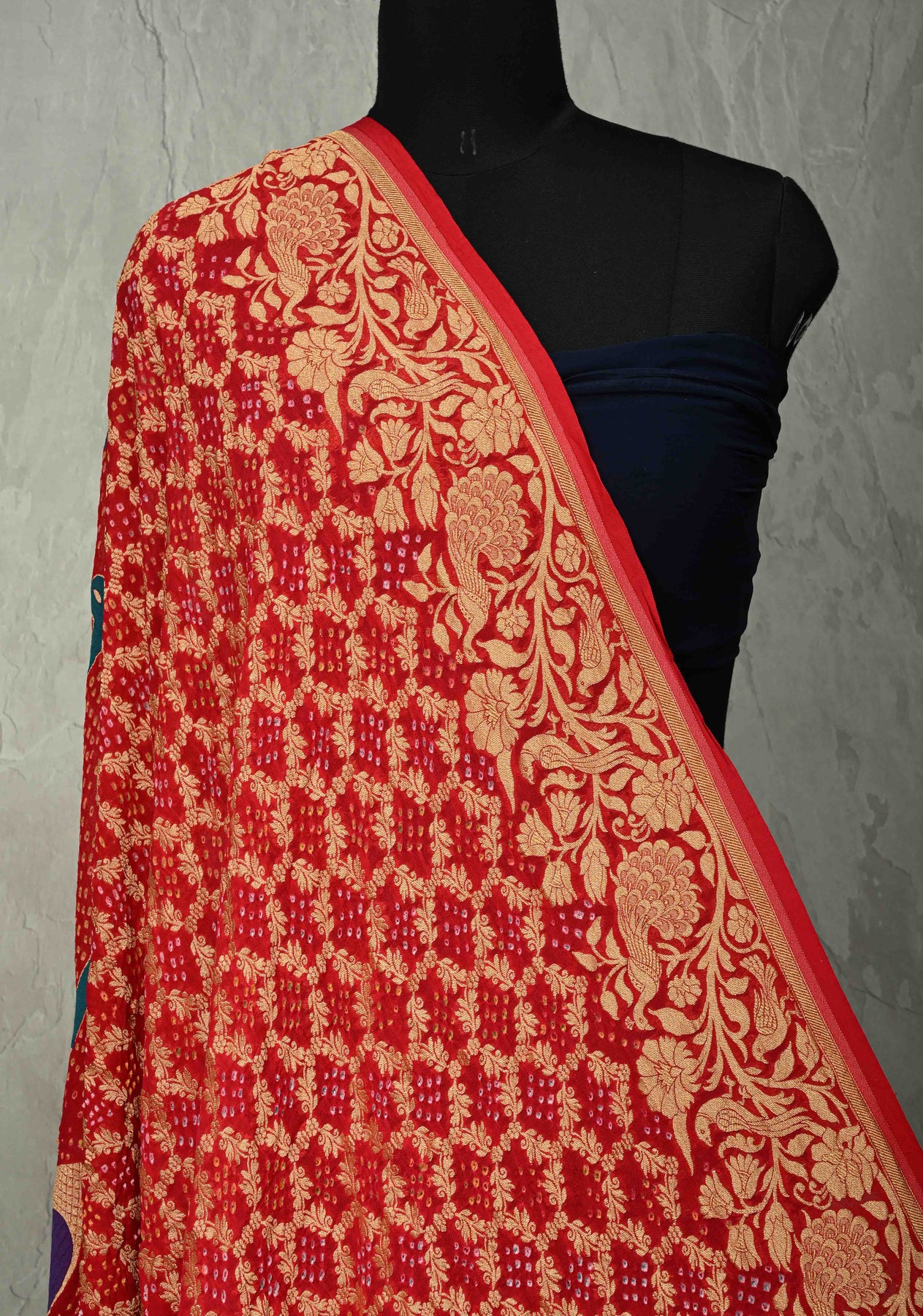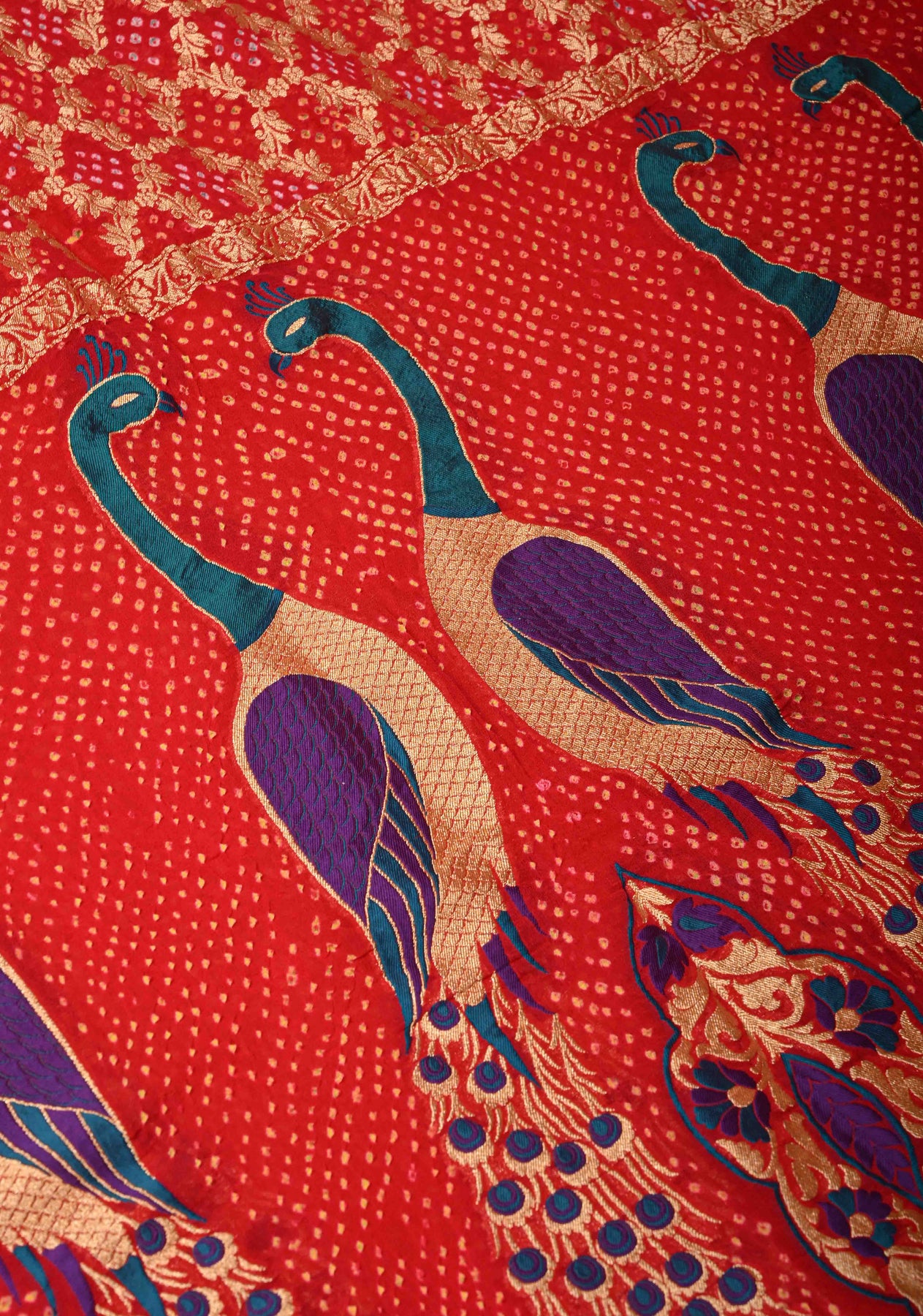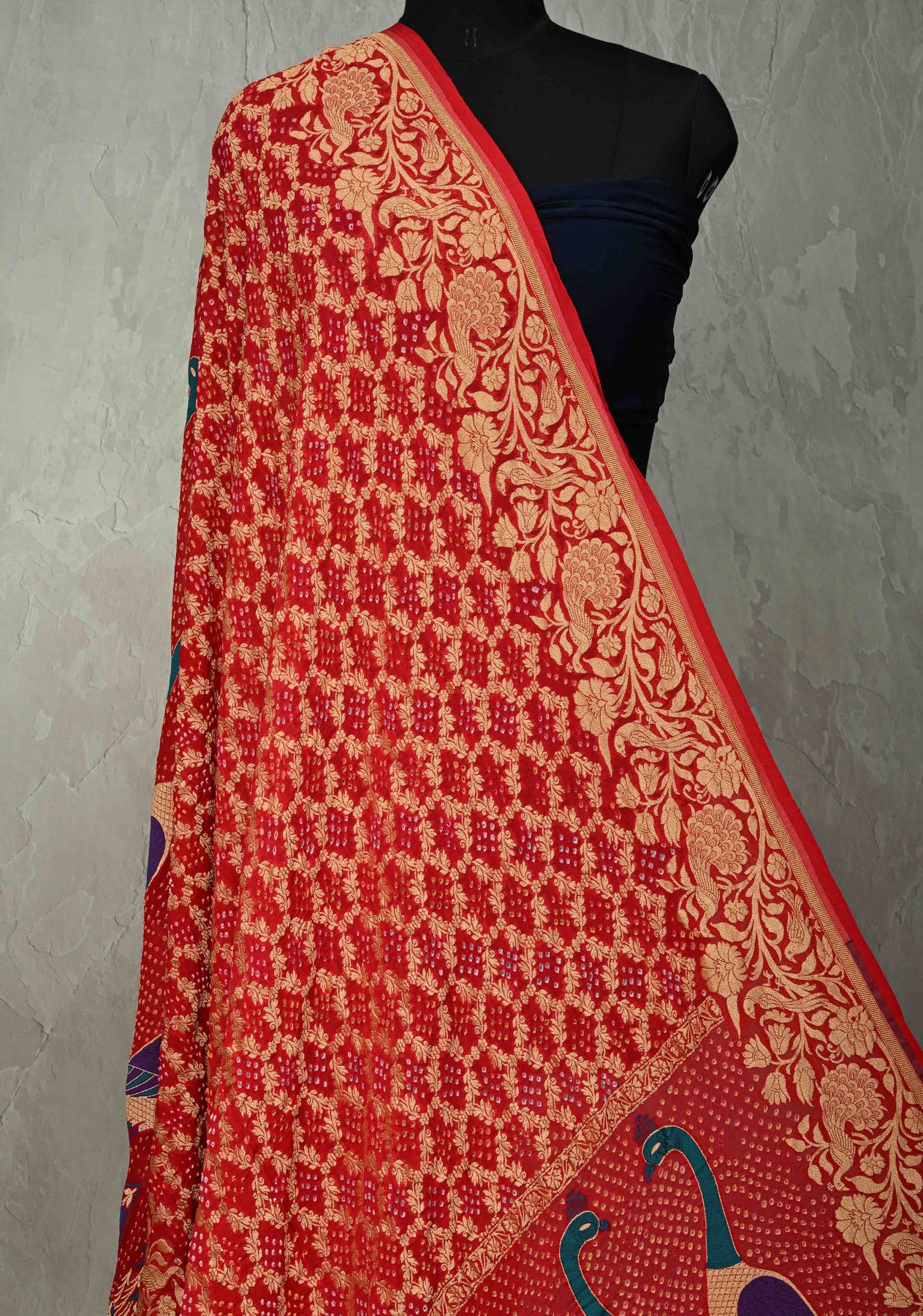This stunning dupatta is a masterpiece of Indian textile artistry, blending several rich traditions. The vibrant bright red hue, a classic for celebrations, is beautifully presented on a luxurious pure silk georgette fabric. The body features an authentic hand-Bandhej tie-dye pattern, which is intricately woven with a Jaal zari design. The pallu is the highlight, adorned with a magnificent peacock design and vibrant Meenakari work, creating a captivating and detailed piece. This handwoven dupatta is a perfect fusion of heritage and sophisticated style, ideal for weddings and grand celebrations.