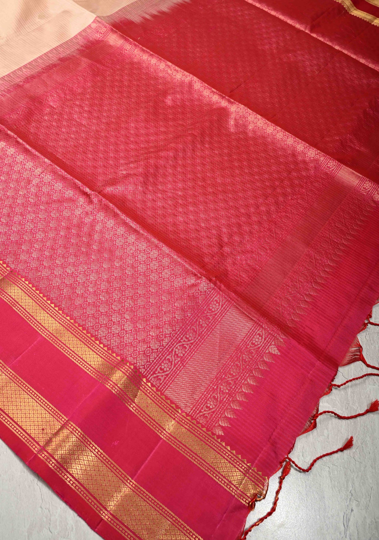 The subtle beige ivory body is adorned with delicate golden zari buttas, adding a touch of shimmer and refinement. The contrasting Pink Rettiapet zari border enhances the saree’s charm, creating a striking yet graceful color combination. A perfect choice for those who appreciate classic design and meticulous craftsmanship.