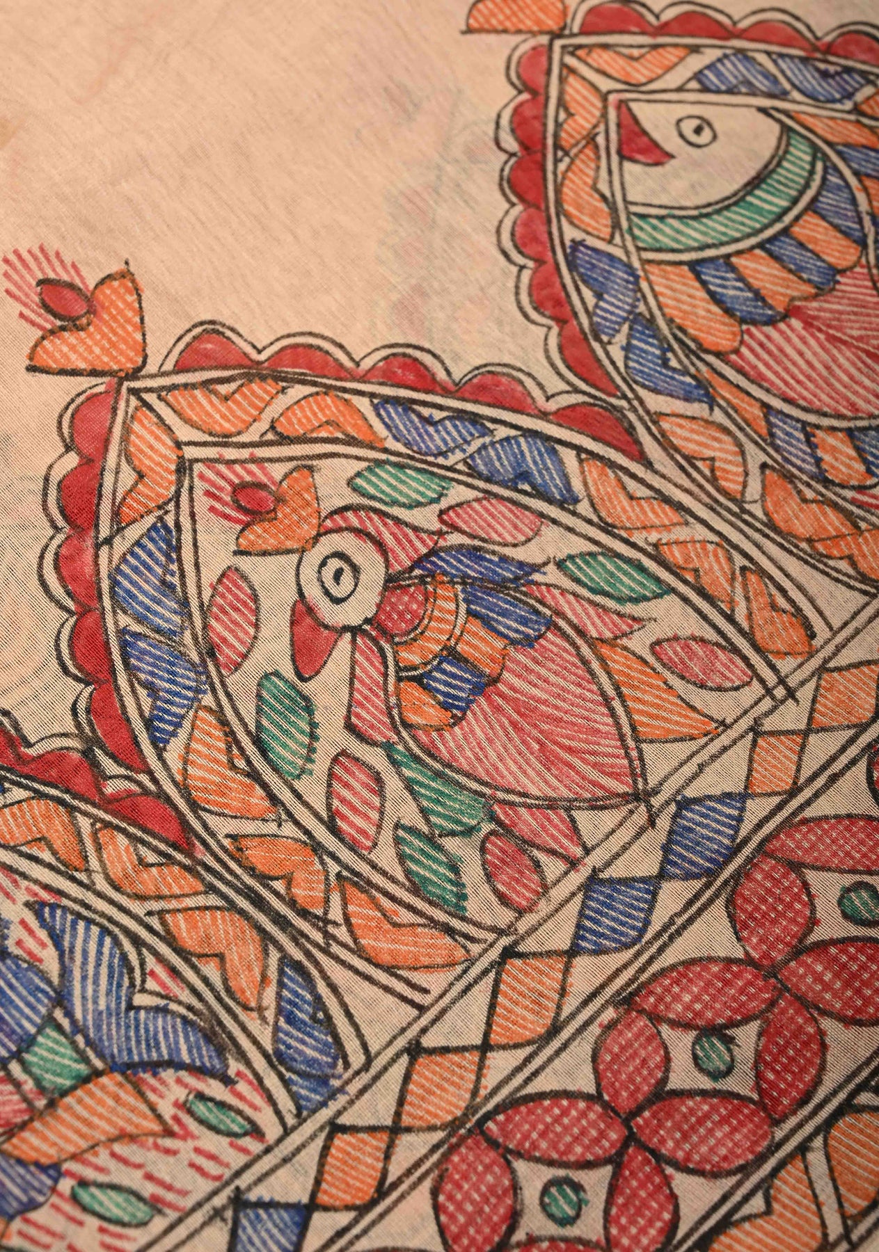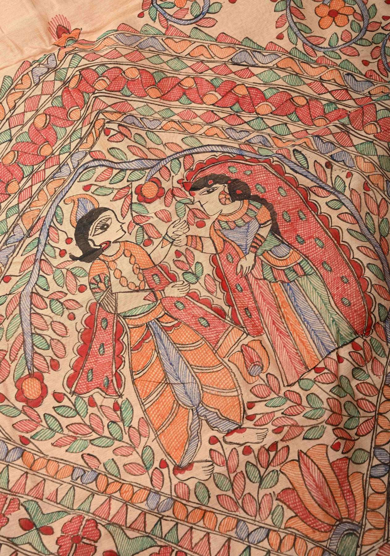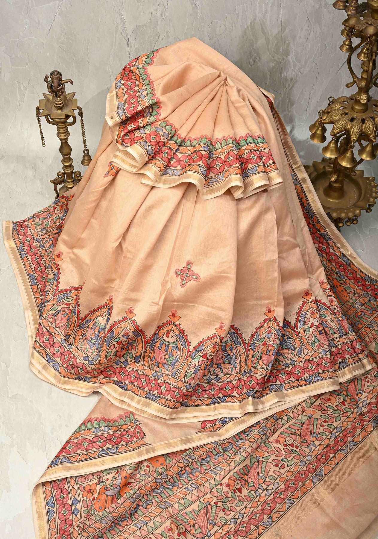 Beige Kanak Rekha Heritage Tussar Silk Saree with Madhubani hand painting and Minimal Zari Border | SILK MARK CERTIFIED