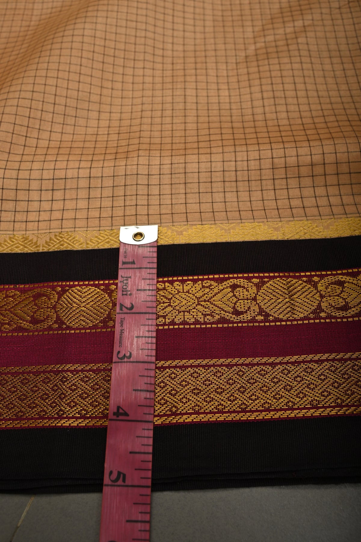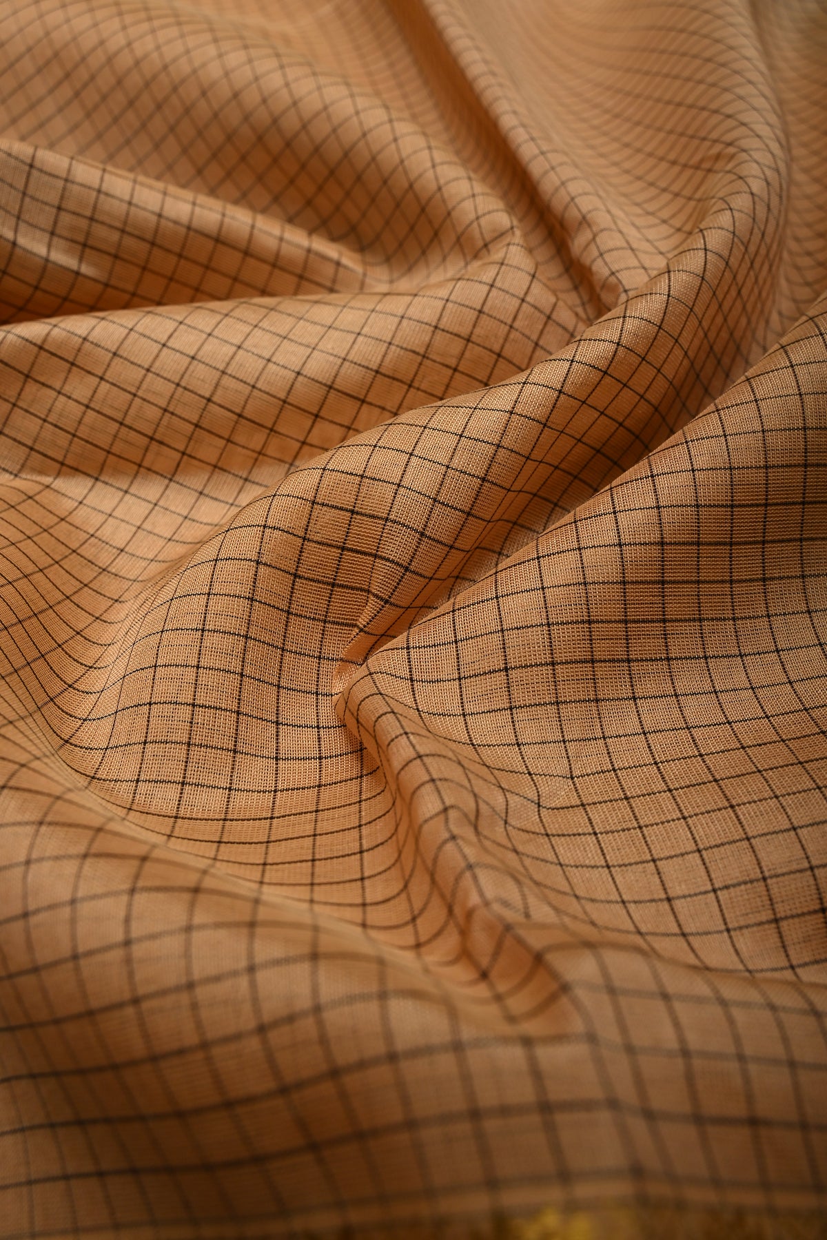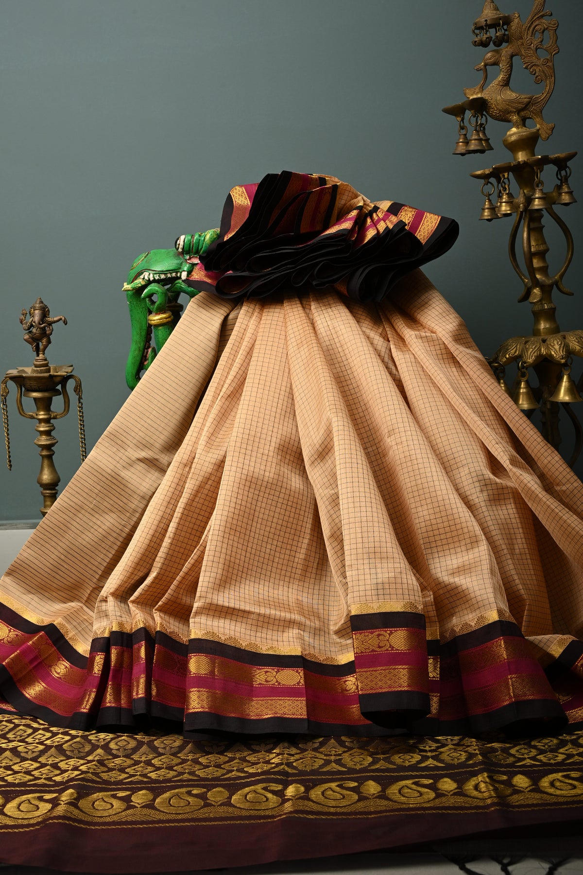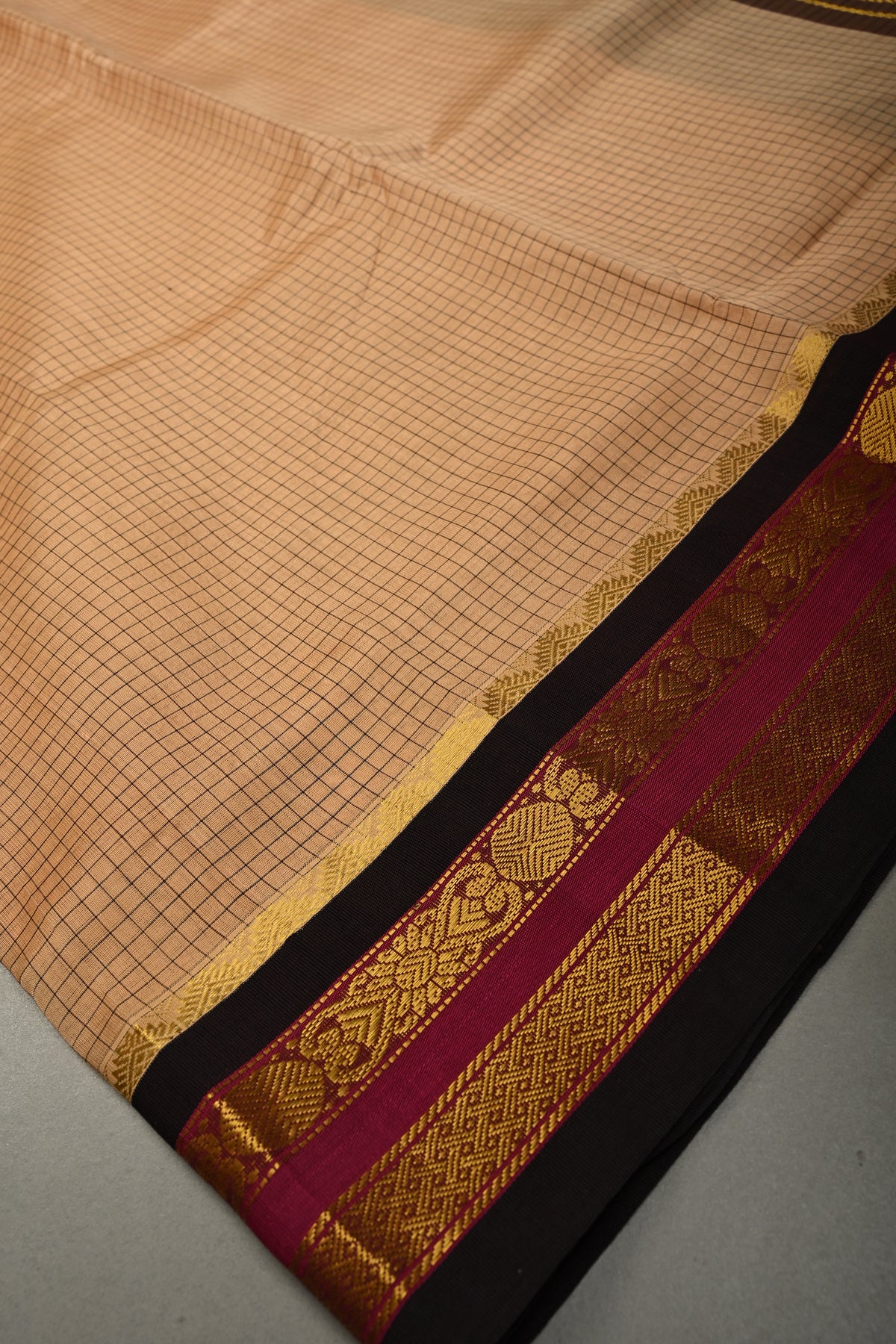 The sophisticated beige body is enhanced with a checks pattern, adding texture and understated charm. A striking contrast zari border frames the saree, lending a touch of traditional richness and refined shimmer. Lightweight and graceful, this saree drapes effortlessly, offering comfort for long hours of wear.