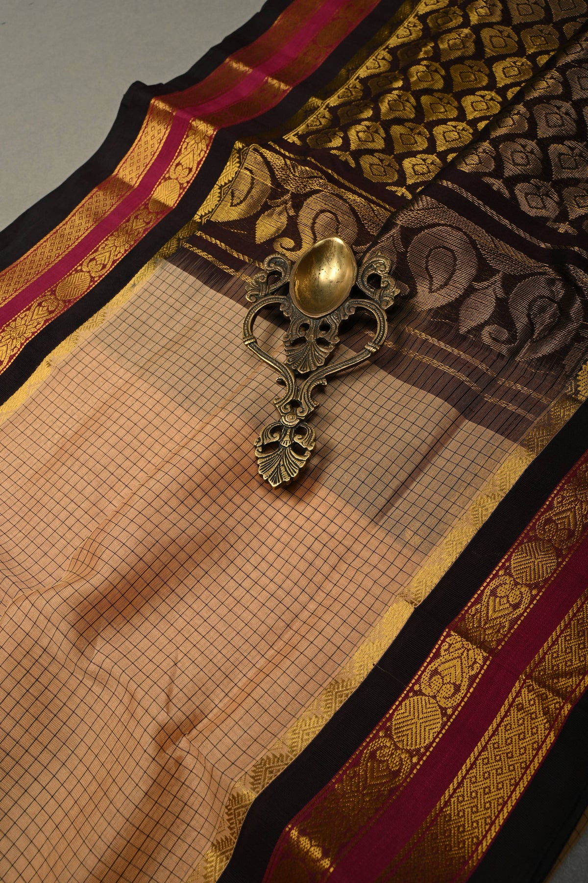 Biscuit Kanchi Silk Cotton Handloom Saree with Checks Pattern and Contrast Zari Border