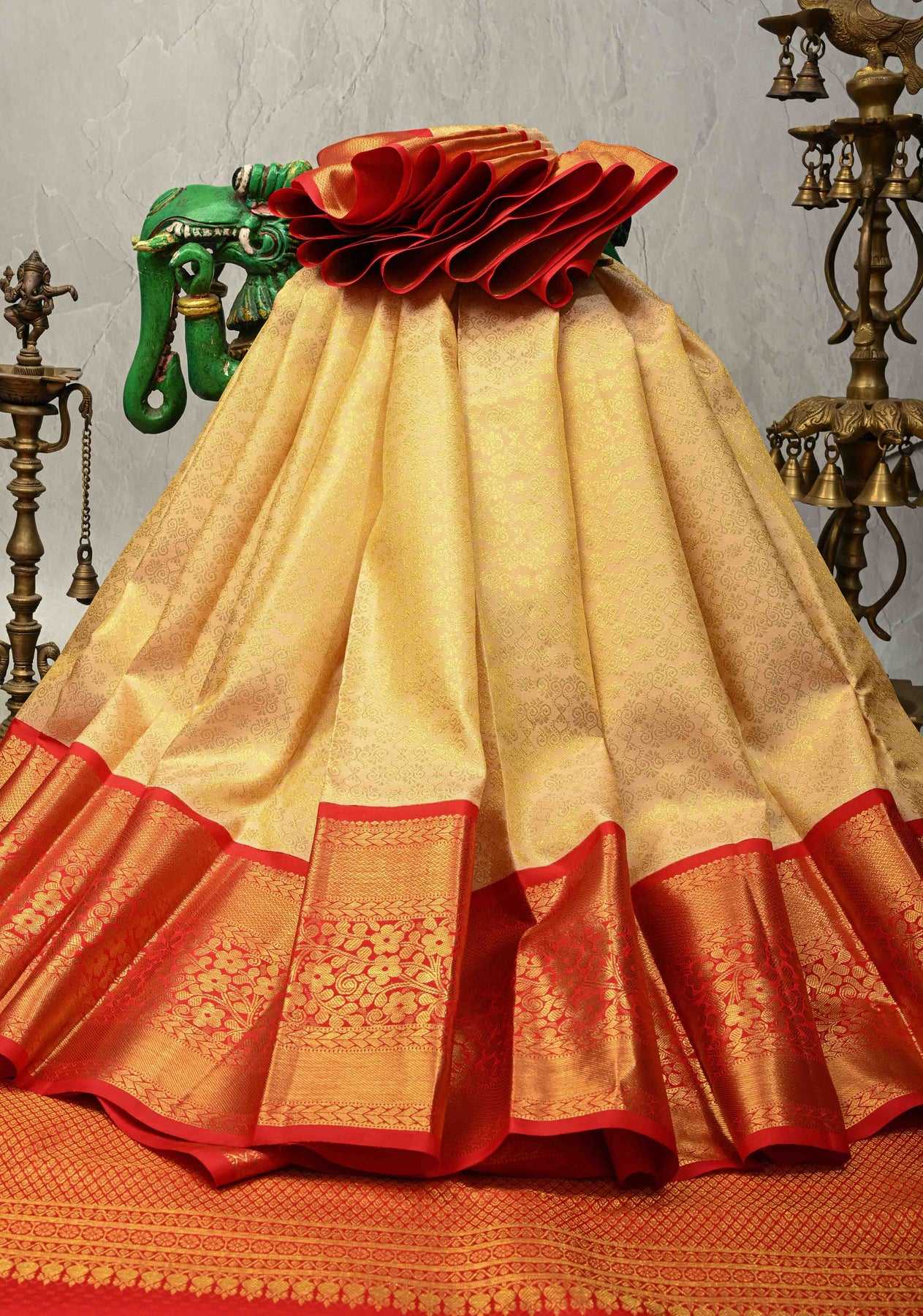 The subtle beige hue exudes understated sophistication, making this saree perfect for weddings, festive occasions, religious ceremonies, and formal celebrations. With its smooth drape, luminous sheen, and structured texture, it offers both comfort and elegance. Pair it with gold, pearl, or antique jewelry to complete a refined traditional look.