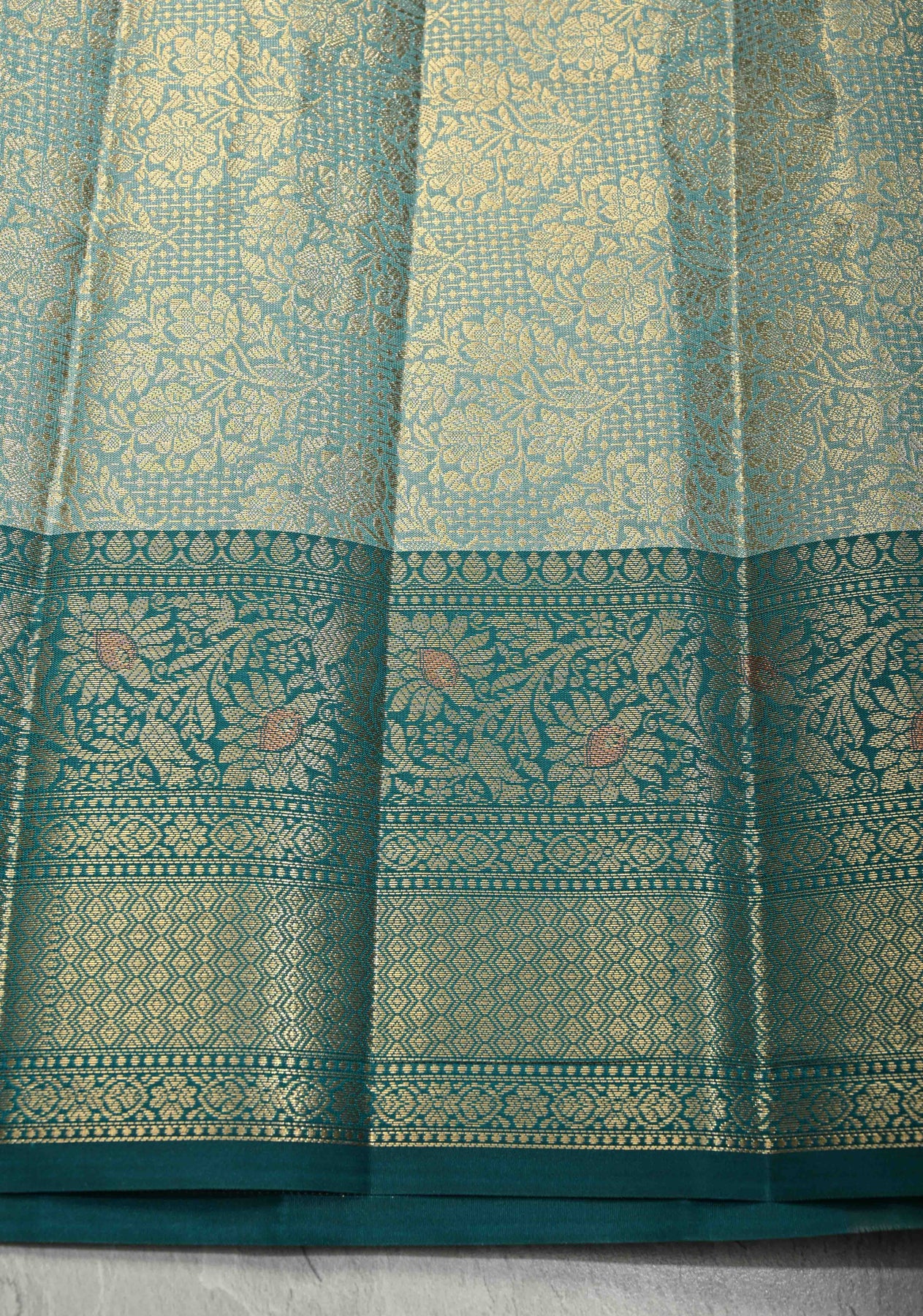 Beige Kanjivaram Tissue Semi Silk Saree with Meenakari Paisley Zari Buttas and Contrast Zari Border