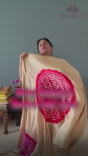 Beige Banarasi Mashru Silk Saree with Bandhni Mandala Design and Bandhni and Zari Borders | SILK MARK CERTIFIED
