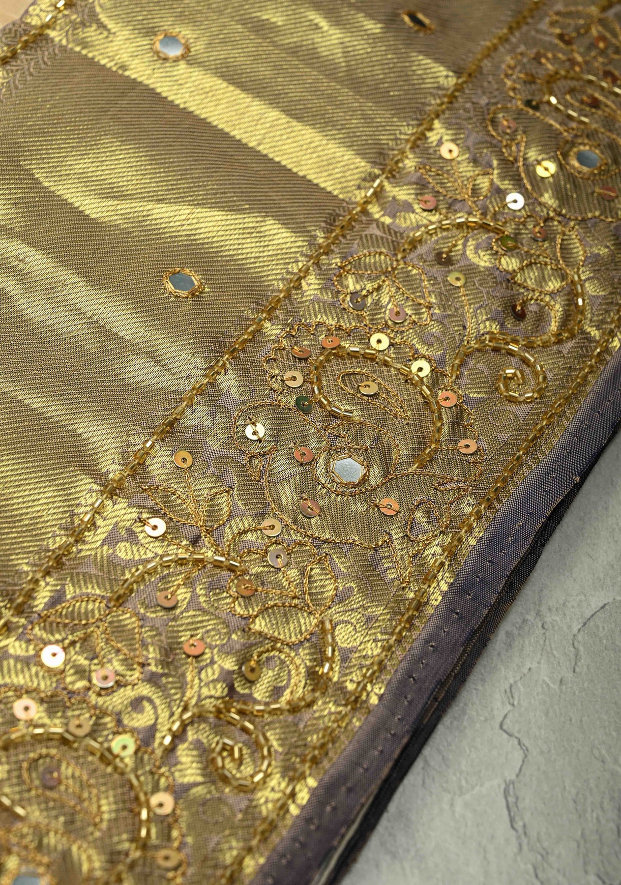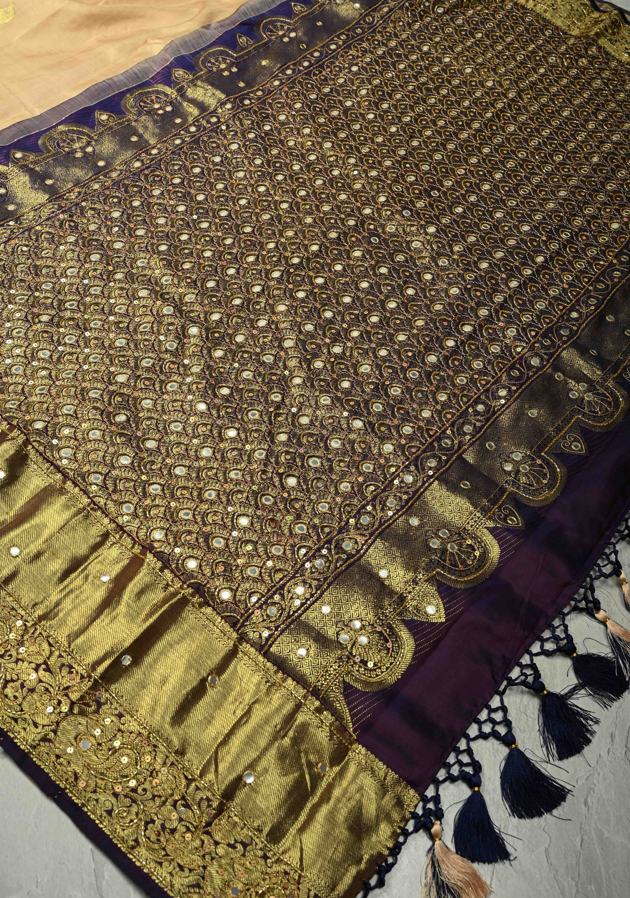 This Beige Kanjivaram Pure Silk Saree is a stunning fusion of timeless tradition and contemporary embellishment. Woven from pure silk, it features a rich, lustrous body adorned with elegant peacock buttas that highlight classic Kanjivaram artistry. The saree is further elevated with exquisite sequins, cutdana, and mirror work, adding a refined sparkle without overpowering its traditional charm. A contrasting zari border frames the drape beautifully, enhancing its regal appeal. Perfect for weddings, grand celebrations, and special occasions, this saree is an exquisite statement of luxury and craftsmanship.