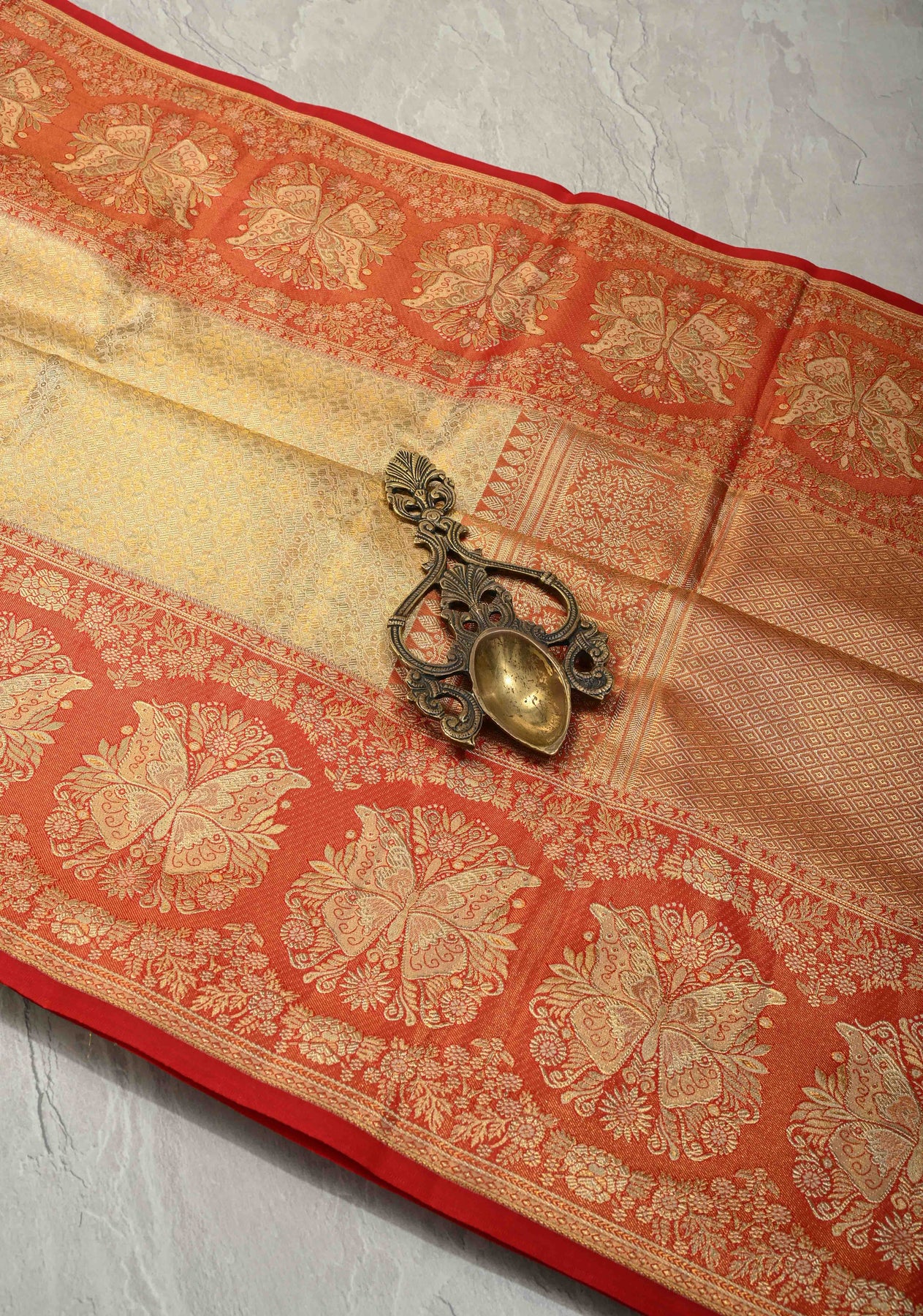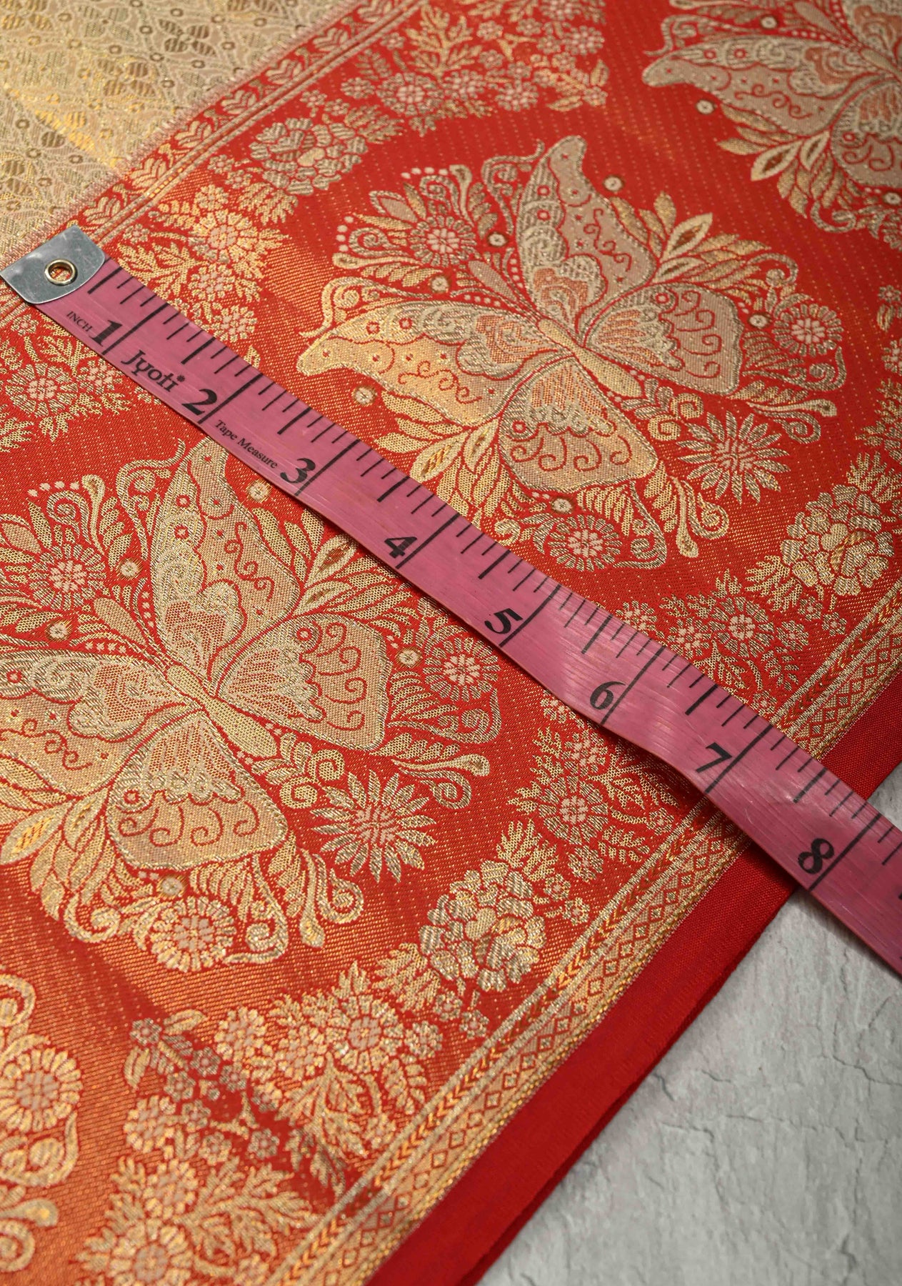 Discover timeless sophistication with this Beige Tissue Kanjivaram Pure Silk Saree, crafted to reflect classic South Indian artistry. Made from tissue silk, the saree is adorned with intricate Meenakari floral brocade, adding vibrant detail and refined elegance. The contrast butterfly zari border lends a distinctive and regal finish, enhancing its overall charm. With its subtle sheen and graceful drape, this saree is perfect for weddings, festive occasions, and elegant celebrations. Pair it with traditional jewelry to complete a truly majestic look.