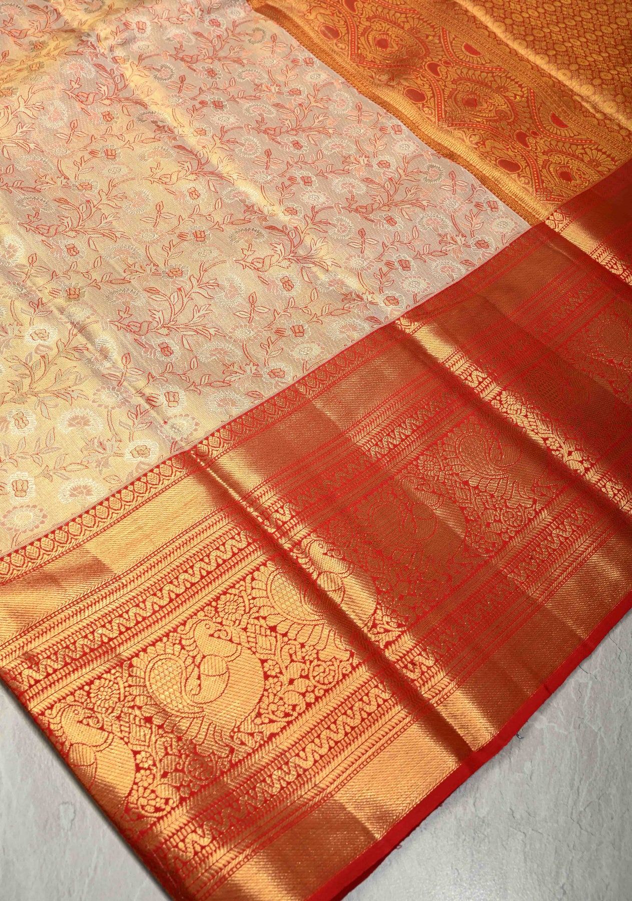 The Beige Tissue Kanjivaram Pure Silk Saree with Meenakari Floral Brocade and Contrast Wide Zari Border is a timeless celebration of heritage craftsmanship and understated . Woven from authentic Kanjivaram pure silk tissue, this saree features intricate Meenakari floral brocade weaving that adds vibrant detailing and rich texture. The contrast wide zari border enhances its regal appeal, reflecting the grandeur of traditional South Indian artistry.