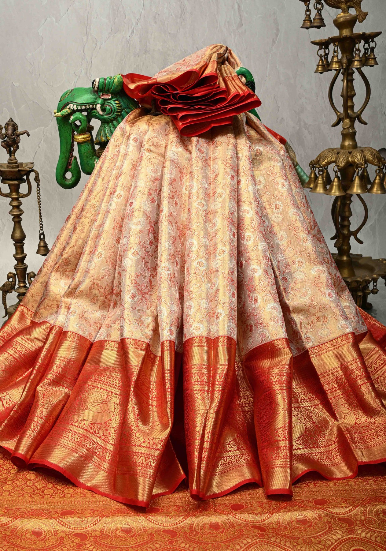 The elegant beige tissue base offers refined sophistication, making this saree an ideal choice for weddings, bridal wear, festive occasions, and grand celebrations. With its luminous sheen, structured drape, and luxurious feel, it creates a majestic and graceful silhouette. Pair it with traditional gold or antique jewelry for a truly royal and timeless look.