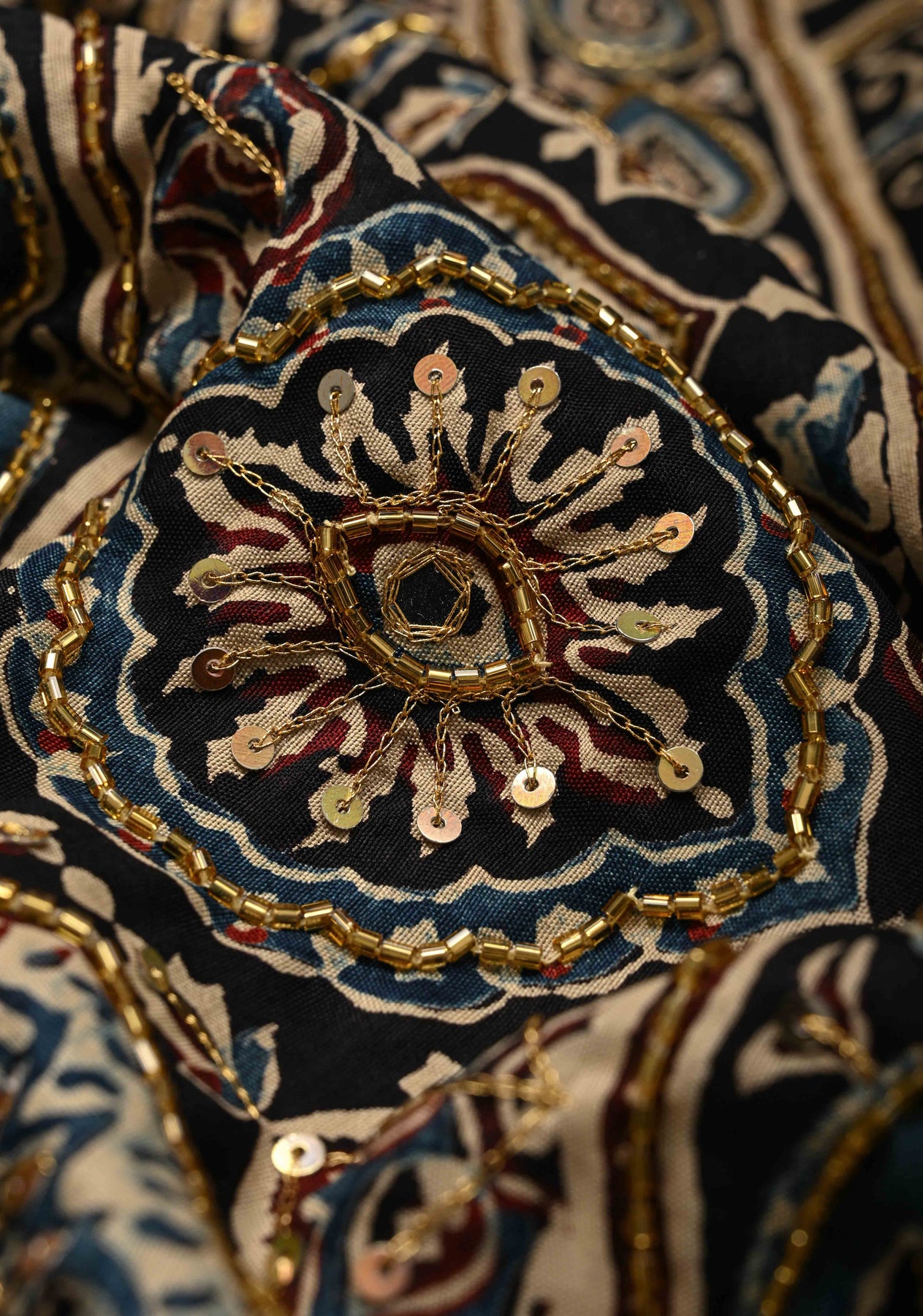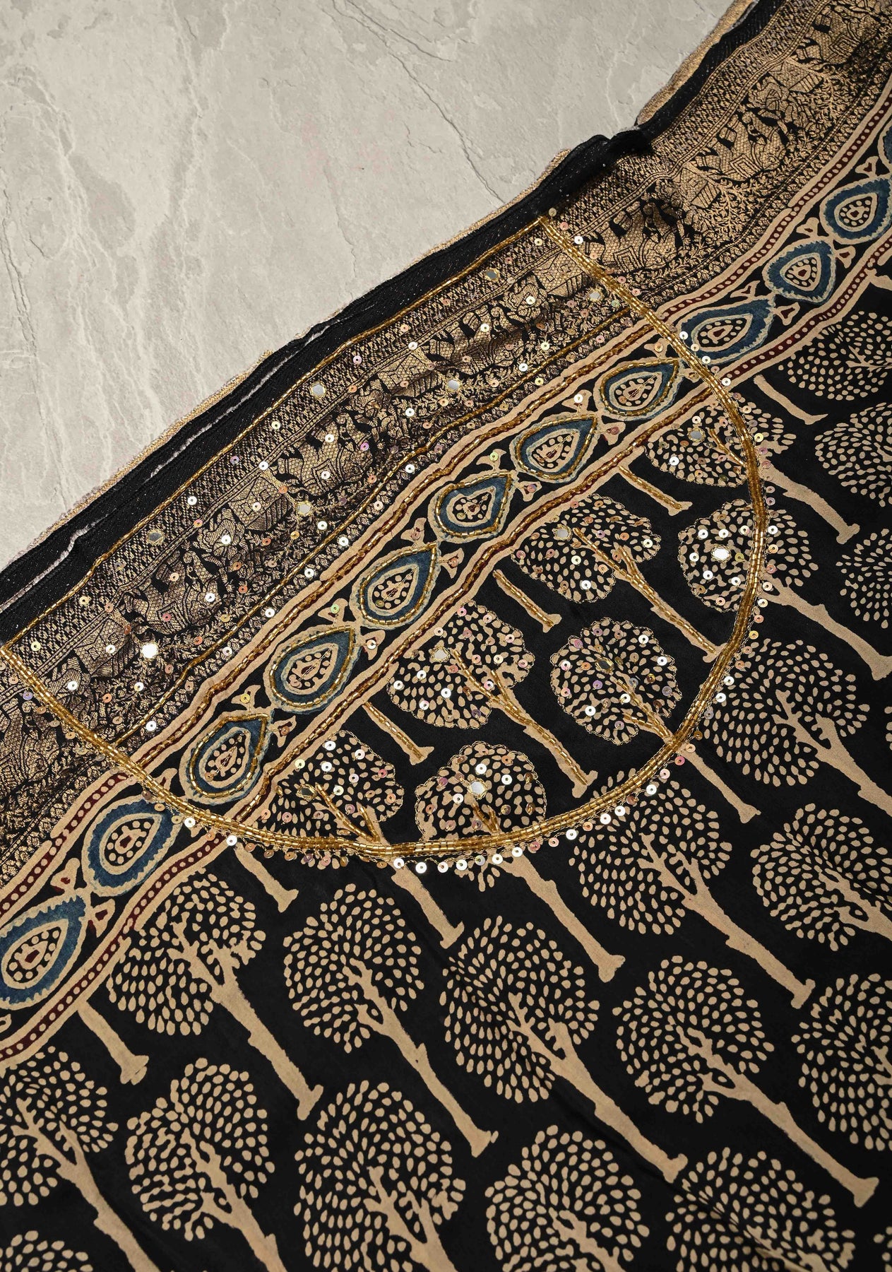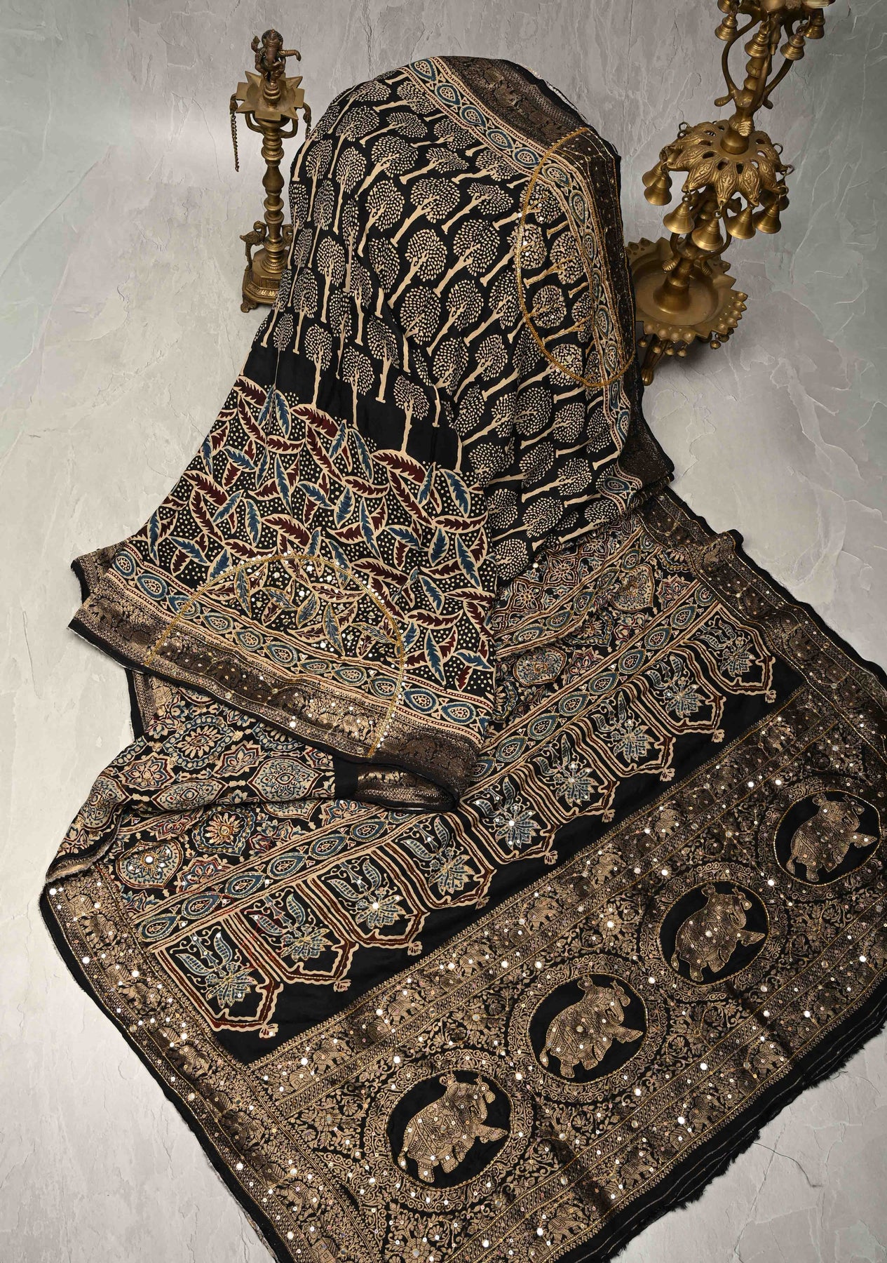This Black Ajrakh Dola Silk Saree is a luxurious blend of heritage and elegance, adorned with traditional Ajrakh hand block prints that showcase centuries-old craftsmanship. The black base is elevated with intricate cutdana, sequins, and mirror handwork, adding a subtle sparkle and festive charm. The saree is finished with a fancy zari border that lends a regal touch, perfectly balancing tradition and modern glamour. Crafted from smooth, lustrous Dola silk, it drapes beautifully, making it ideal for weddings, festive celebrations, and grand occasions.