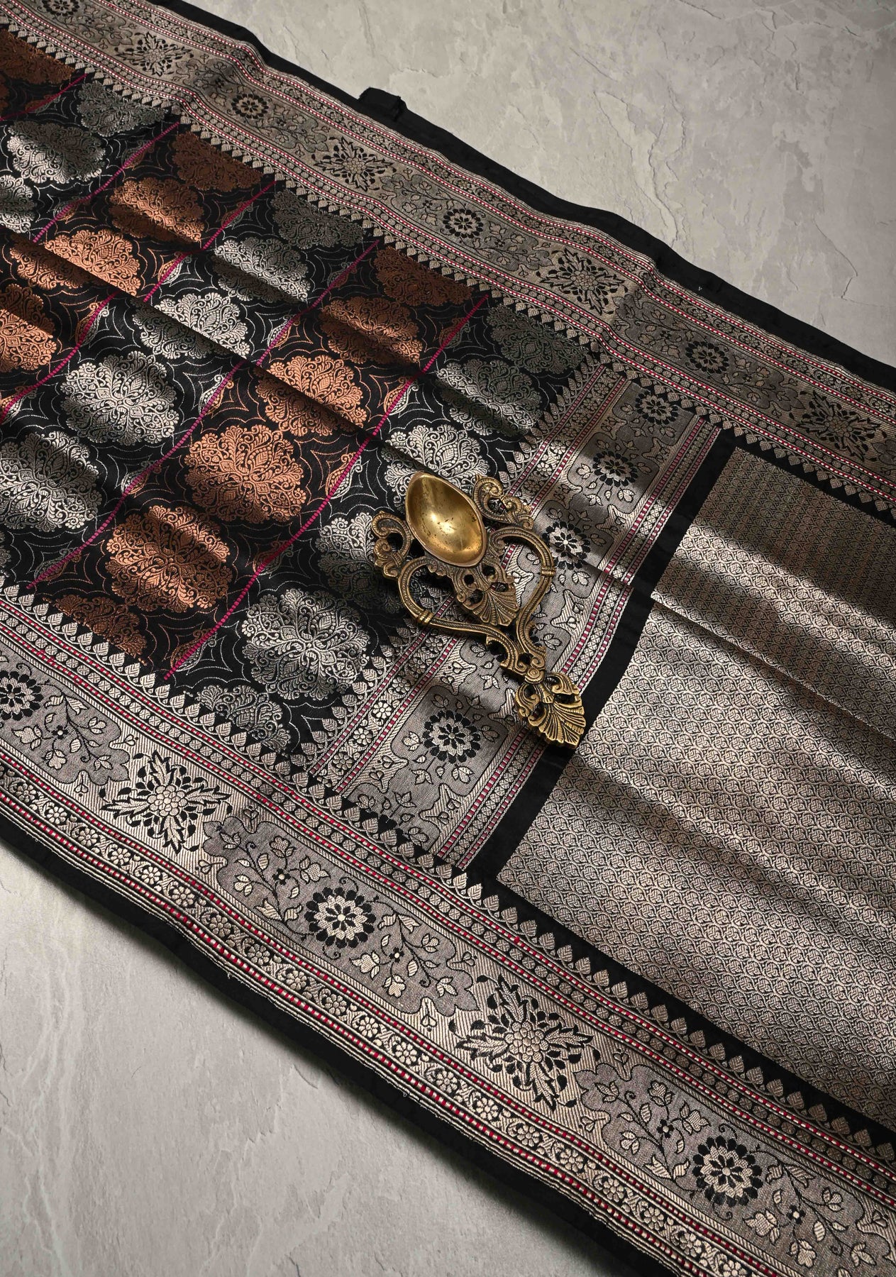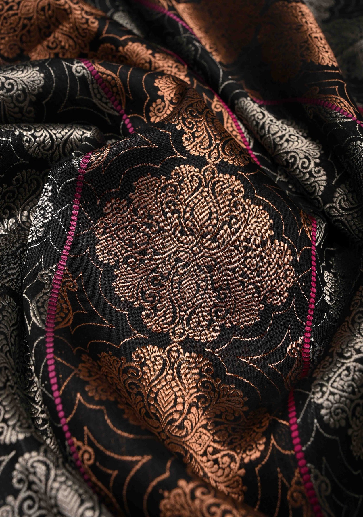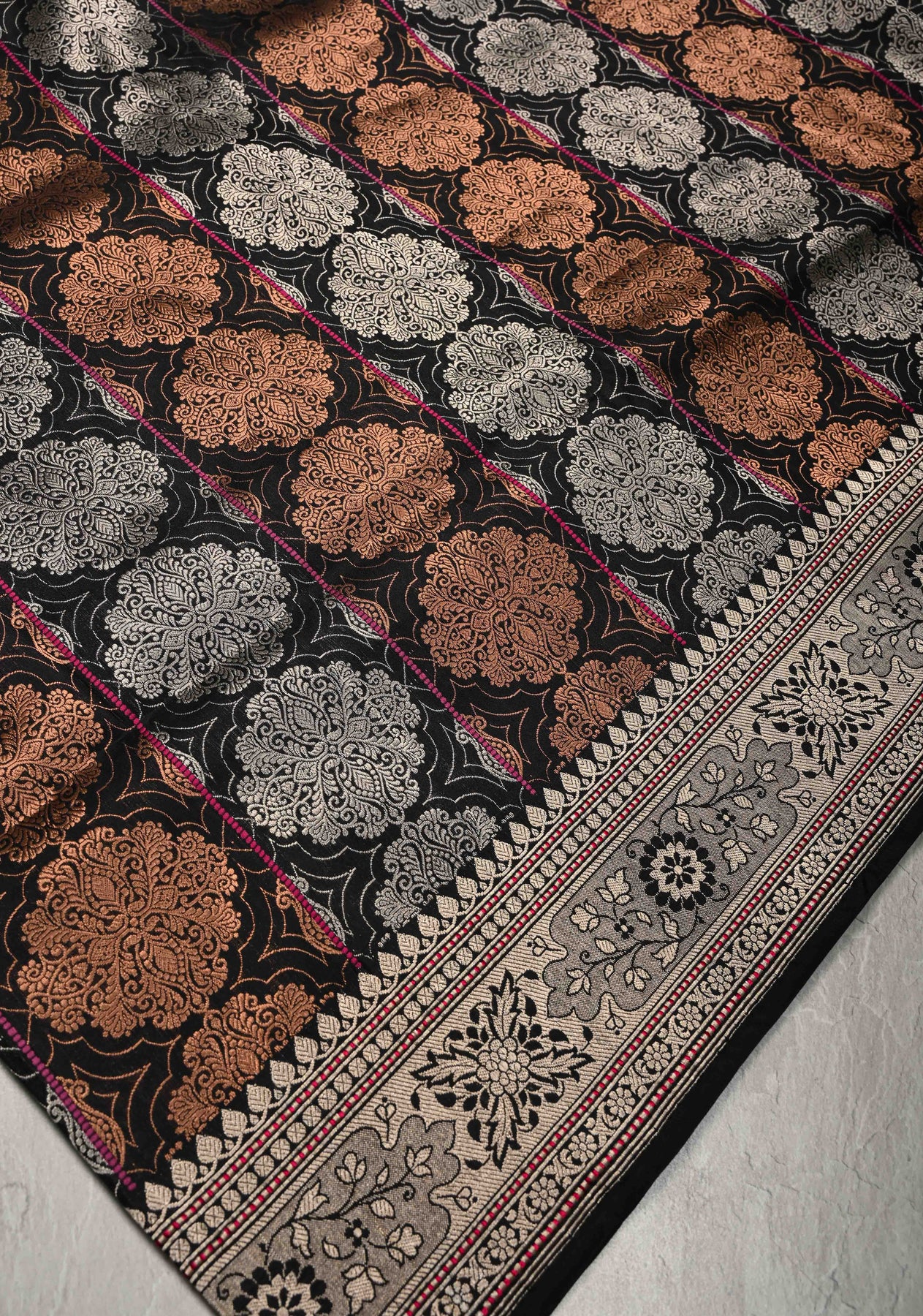 The Black Banarasi Katan Silk Saree is a true testament to the grandeur of timeless handloom artistry. Woven from pure Katan silk, this saree features a standout pattern in stunning copper and silver zari brocade, creating a lush, all-over floral design. A contrasting zari border frames the saree, adding to its regal appeal. Elegant, heirloom-worthy, and perfect for grand occasions, this saree embodies pure Banarasi opulence.