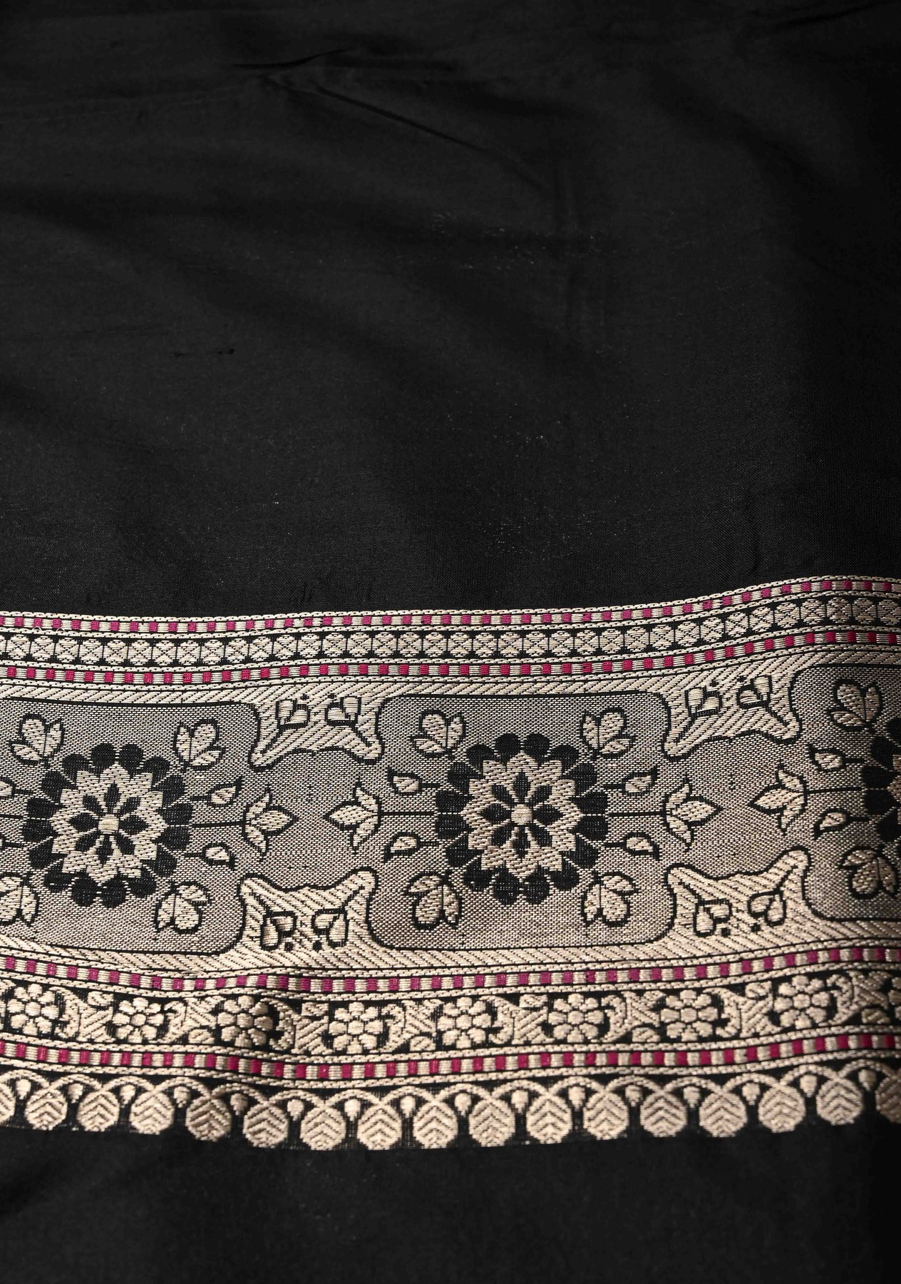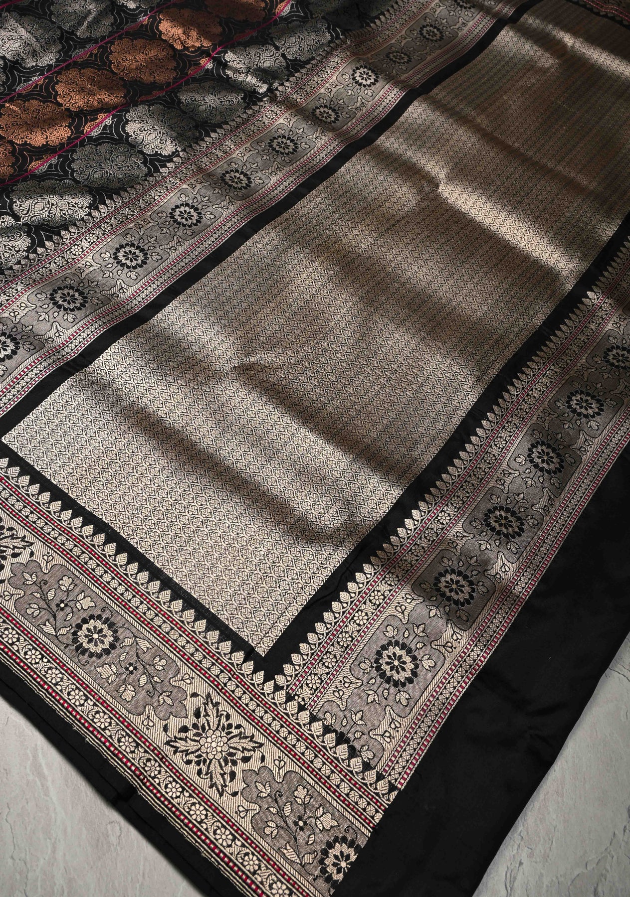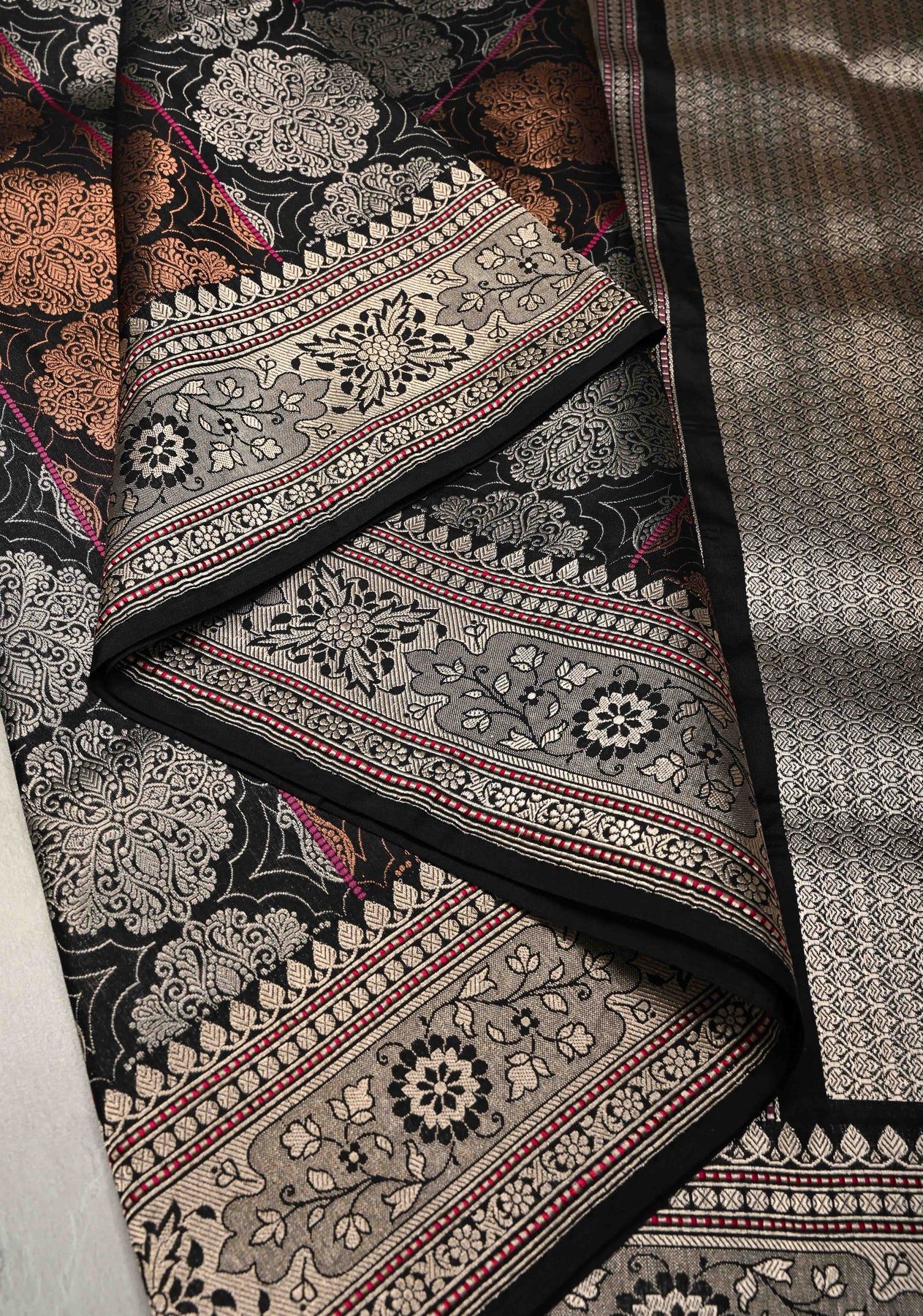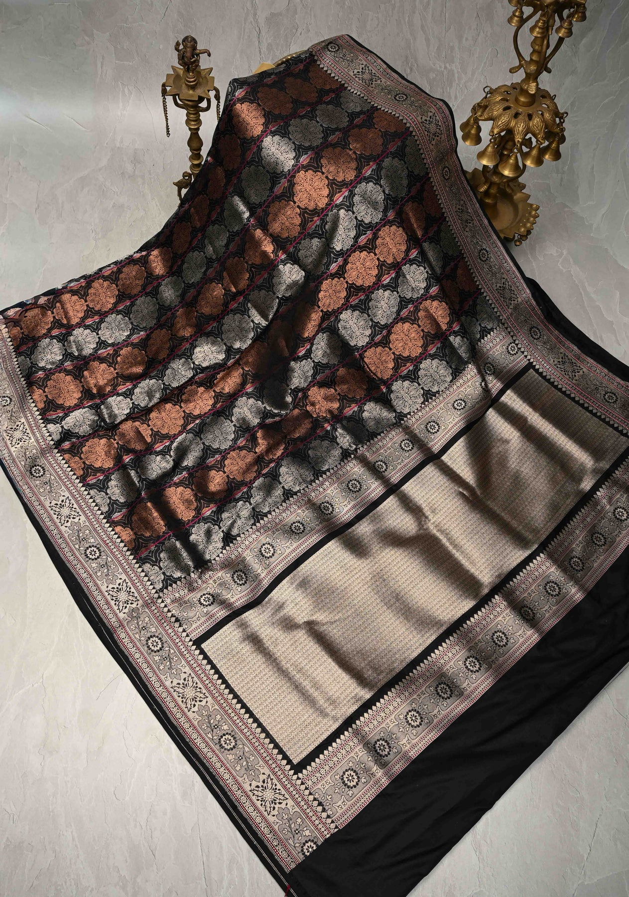 The Black Banarasi Katan Silk Saree is a true testament to the grandeur of timeless handloom artistry. Woven from pure Katan silk, this saree features a standout pattern in stunning copper and silver zari brocade, creating a lush, all-over floral design. A contrasting zari border frames the saree, adding to its regal appeal. Elegant, heirloom-worthy, and perfect for grand occasions, this saree embodies pure Banarasi opulence.