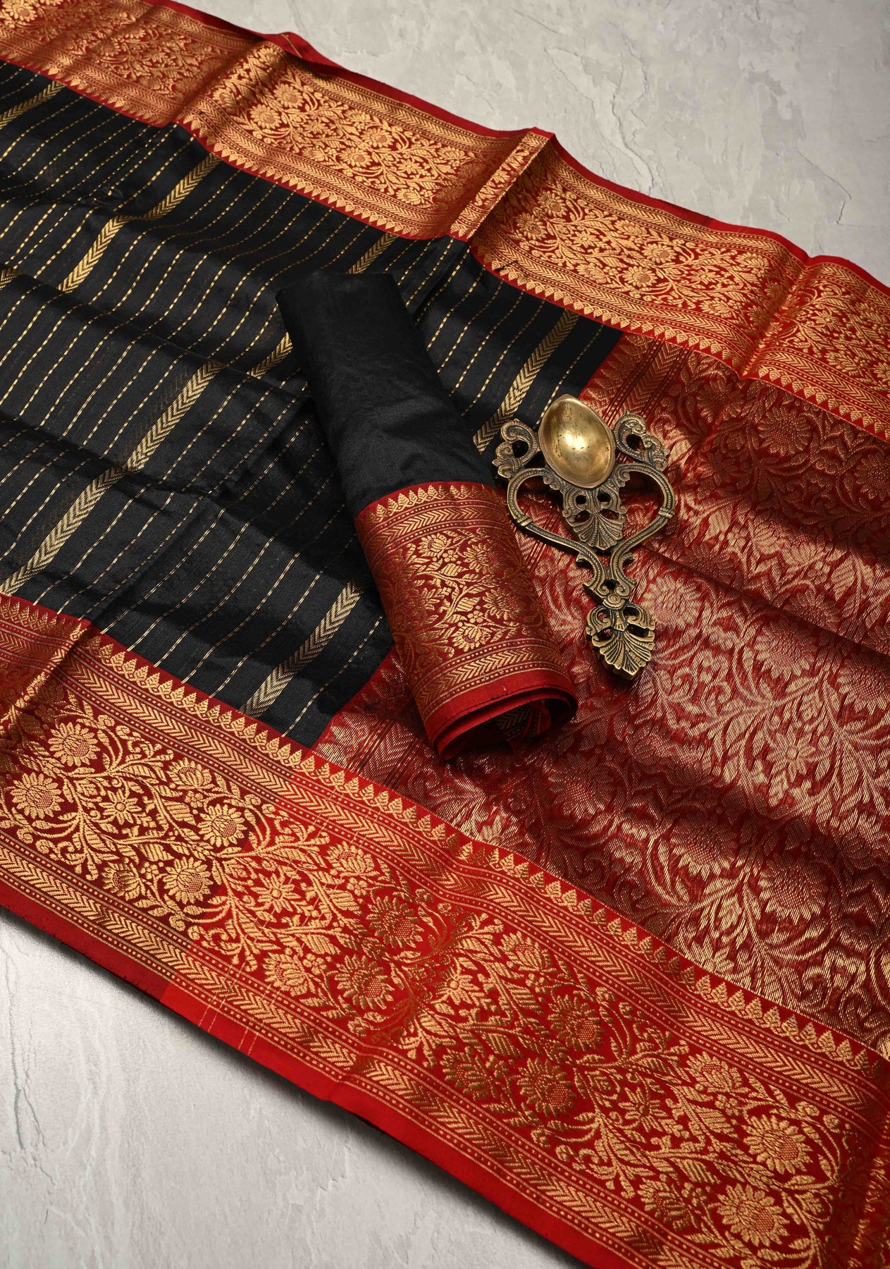 Make a bold statement in this Black Chanderi Silk Saree, designed with elegant vertical stripes that add length and sophistication to your silhouette. Crafted from breathable, lightweight Chanderi silk, the saree offers a subtle sheen and smooth drape. Its standout feature is the contrast Zari border, which beautifully frames the saree and elevates its traditional charm. Perfect for formal occasions, festive celebrations, or cultural events, this saree pairs effortlessly with statement jewelry and a sleek blouse for a refined look.