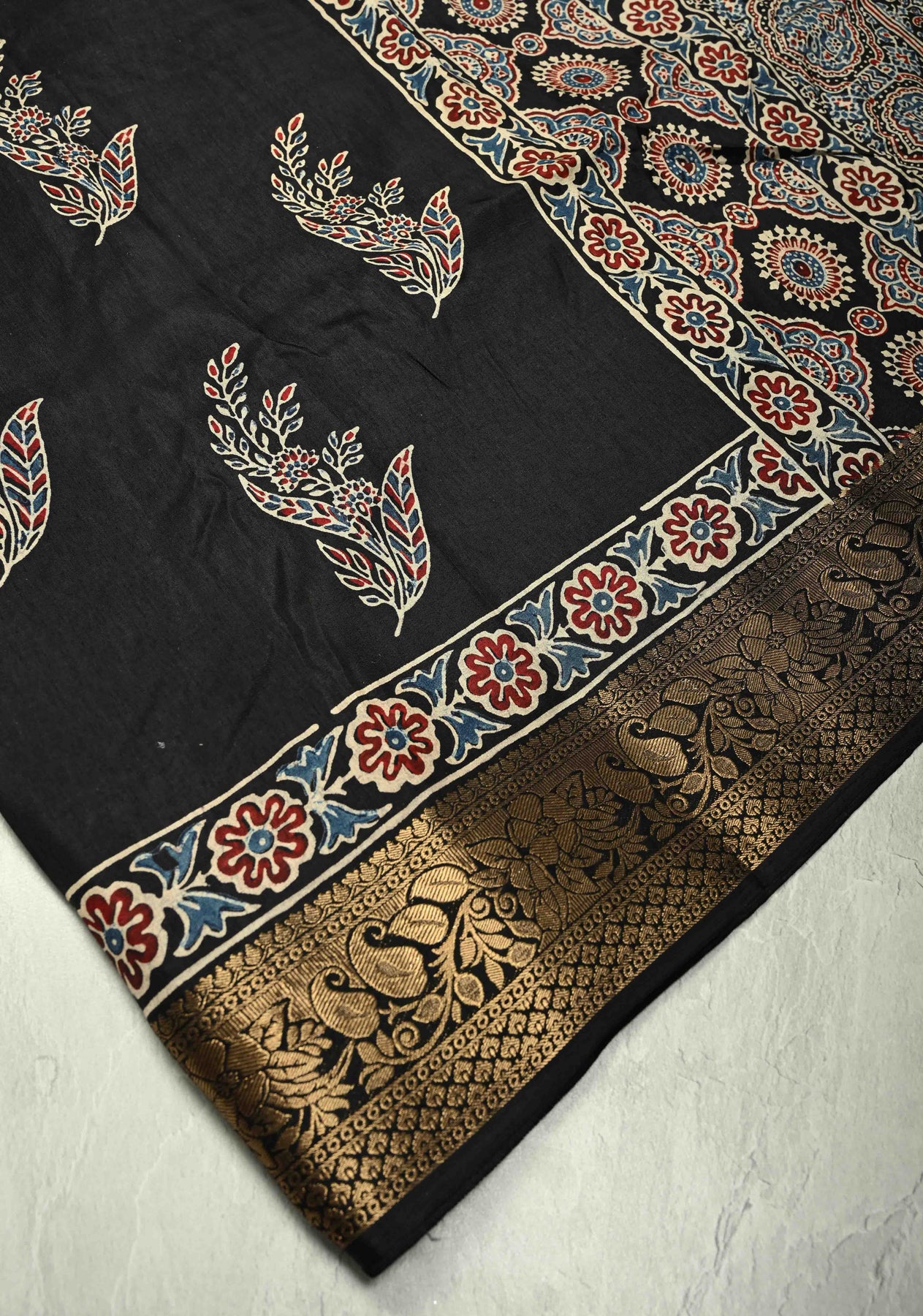 Black Dola Silk Saree with Floral Hand Block Print and Fancy Zari Border